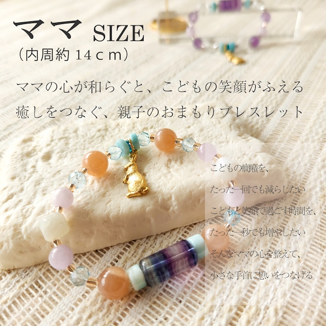 ------- 商品説明 ------- 怒りたいわけじゃない 子供を変えたいんじゃない 泣きたくなる心を、そっと包んであげたい。 ただ、こどもと笑い合いたい。 、、、いつも笑顔でいるのは難しい、、、 そんなママの心を癒し整えてくれるお守りブレスレットです。 心のバランスを整えるパワーのある石を詰め込みました。 お子様用のKIDSブレスレットもあります。 ママとお子さんの笑顔の時間が一秒でも増えますように ----------◅ 石の効果 ▻---------- フローライト・・・心の混乱や情緒の不安定さを整え、心を穏やかにする ラリマー ・・・癇癪やイライラや怒りを鎮め、心を癒しリラックスさせる アパタイト ・・・心の混乱や興奮を鎮め、ママとこどもの気持ちをつなげる アメシスト ・・・興奮した気持ちをゆっくり鎮め、愛情を思い出させてくれる ラピスラズリ・・・不安やストレスを軽減し、心に安心感を与える “こどもの本当の気持ち”を感じ取る力を助ける クンツァイト・・・自分を責める気持ちを和らげ、本当のやさしさをもう一度引き出してくれる クリスタル ・・・感情をリセットしママとこどもの心を“落ち着いた波”でつなぐ 他の石の力を高める 真鍮パーツを使用しております。詳しくは『❖真鍮パーツについて❖』をご覧ください。 ------- 仕様 ------- 伸縮性のあるテグスを使用しています。 ▫サイズ▫ 内周 約14.5cm ※小さめサイズの石を使用しておりますので、 ぴったりフィットするサイズ感です。 ▫天然石▫ モンゴル産フローライト ドミニカ産ラリマー アパタイト ザンビア産アメジスト アフガニスタン産ラピスラズリ ナイジェリア産クンツァイト ブラジル産クリスタル ▫素材▫ サージカルステンレス 丸カン 真鍮 ねこチャーム ▷ご注意◁ 天然石の特性上、写真では写りきれない内包物やごく小さな欠けが見られる場合がございます。 これらは不良品ではなく、長い時間をかけて自然が生み出した天然石ならではの個性としてご理解ください。 商品画像は実物の色味にできる限り近づけて撮影しておりますが、 撮影環境やお使いのディスプレイ設定により、実際の商品と色味や印象が多少異なる場合がございます。 また、繊細なつくりのため、衣服やバッグなどへの引っかかり、強い衝撃には十分ご注意ください。 天然石のクラックやコーティングによるカラー素材、またパールなど 超音波洗浄ができない素材を使用しているため、機械による超音波洗浄は行っておりません。 お届け前には一点ずつ手洗いを行っております。 就寝中や激しい運動の際は外してご使用ください。 枕元に置いて休ませてあげるのもおすすめです。