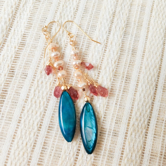 マザーオブパールマーキス×淡水パール×ストロベリークォーツ×ジルコン ピアス 25006P