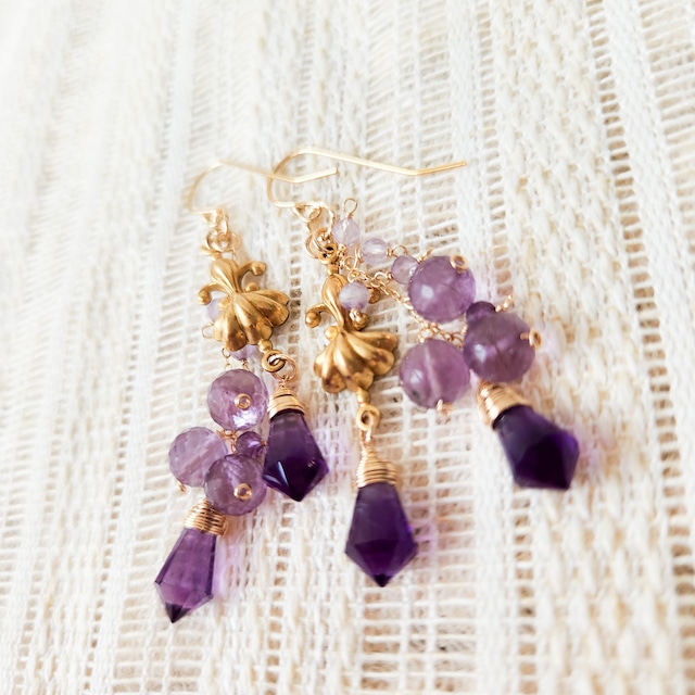 ------- 商品説明 ------- 本商品は、14KGF刻印入りの既製ピアスパーツを使用しています。 変形しにくく、耐久性と安定性を重視したパーツを選んでいます。 フックタイプには、落下防止用のシリコンキャッチをお付けしています。 3種類のアメシストビーズと真鍮オーナメントを組み合わせたピアスです。 ラベンダー色の丸いアメシストビーズがキラキラと美しく、直線と曲線のバランスにこだわったデザインです。 真鍮パーツを使用しております。 詳しくは『❖真鍮パーツについて❖』をご覧ください。 ------- 仕様 ------- ▫重さ▫ 片方 約3.5g (いちごみるく飴1こ分くらい) 両方 約7g ▫天然石▫ アメシスト ▫素材▫ 14KGF ピアス・ワイヤー・チェーン・丸カン 真鍮パーツ オーナメントコネクター ▷ご注意◁ 天然石の特性上、写真では写りきれない内包物やごく小さな欠けが見られる場合がございます。 これらは不良品ではなく、長い時間をかけて自然が生み出した天然石ならではの個性としてご理解ください。 商品画像は実物の色味にできる限り近づけて撮影しておりますが、 撮影環境やお使いのディスプレイ設定により、実際の商品と色味や印象が多少異なる場合がございます。 また、繊細なつくりのため、衣服やバッグなどへの引っかかり、強い衝撃には十分ご注意ください。 天然石のクラックやコーティングによるカラー素材、またパールなど 超音波洗浄ができない素材を使用しているため、機械による超音波洗浄は行っておりません。 お届け前には一点ずつ手洗いを行い、仕上げにコーティング剤を塗布しております。