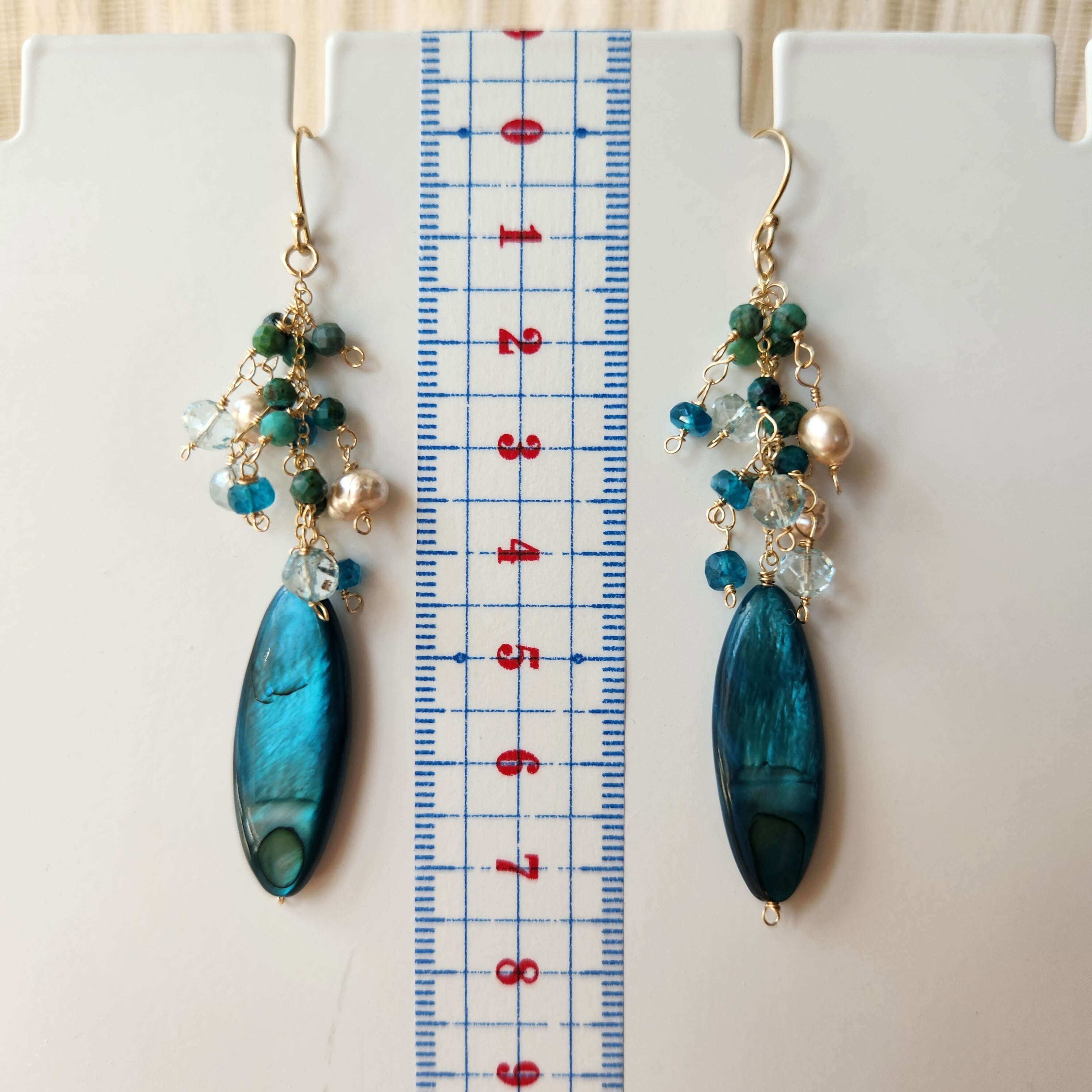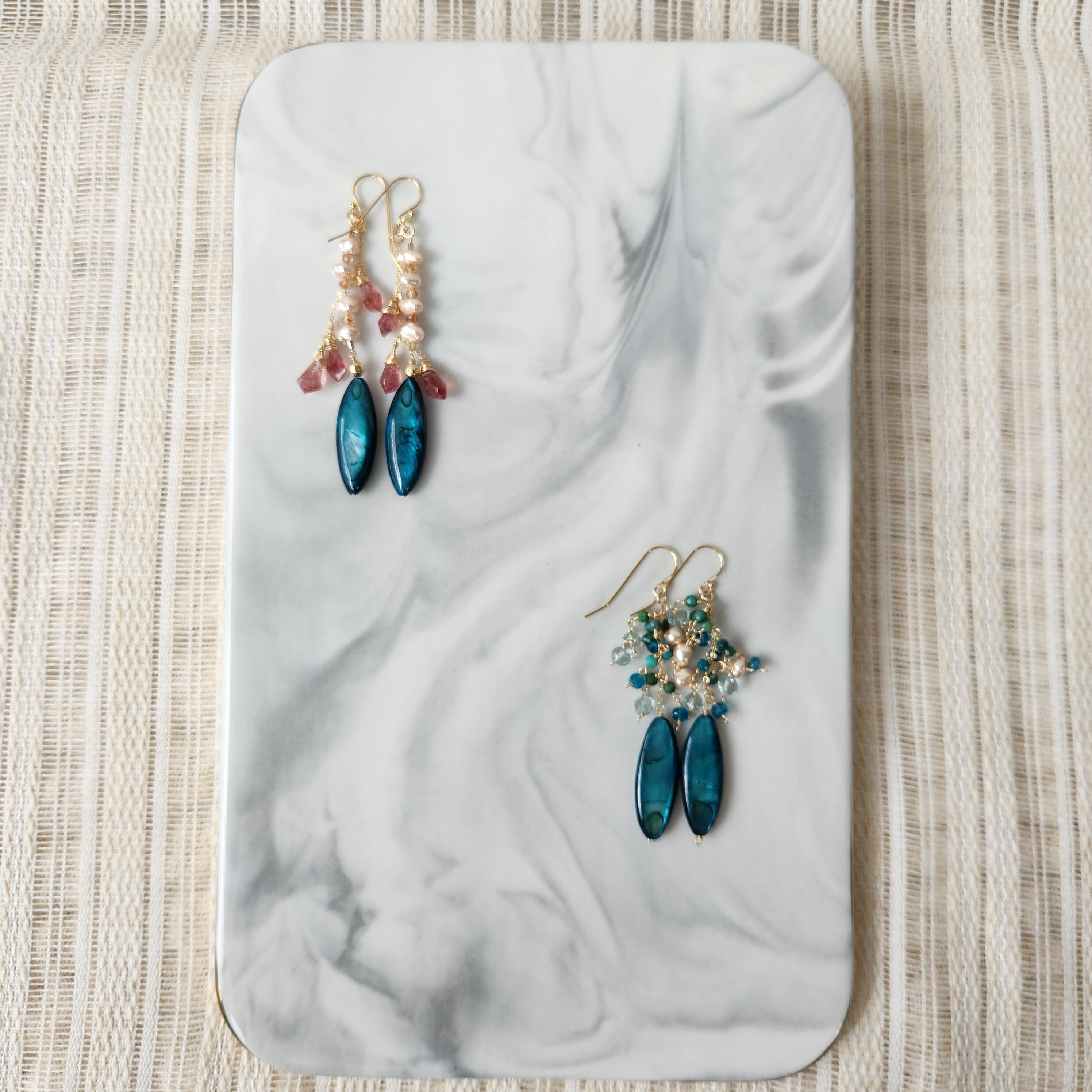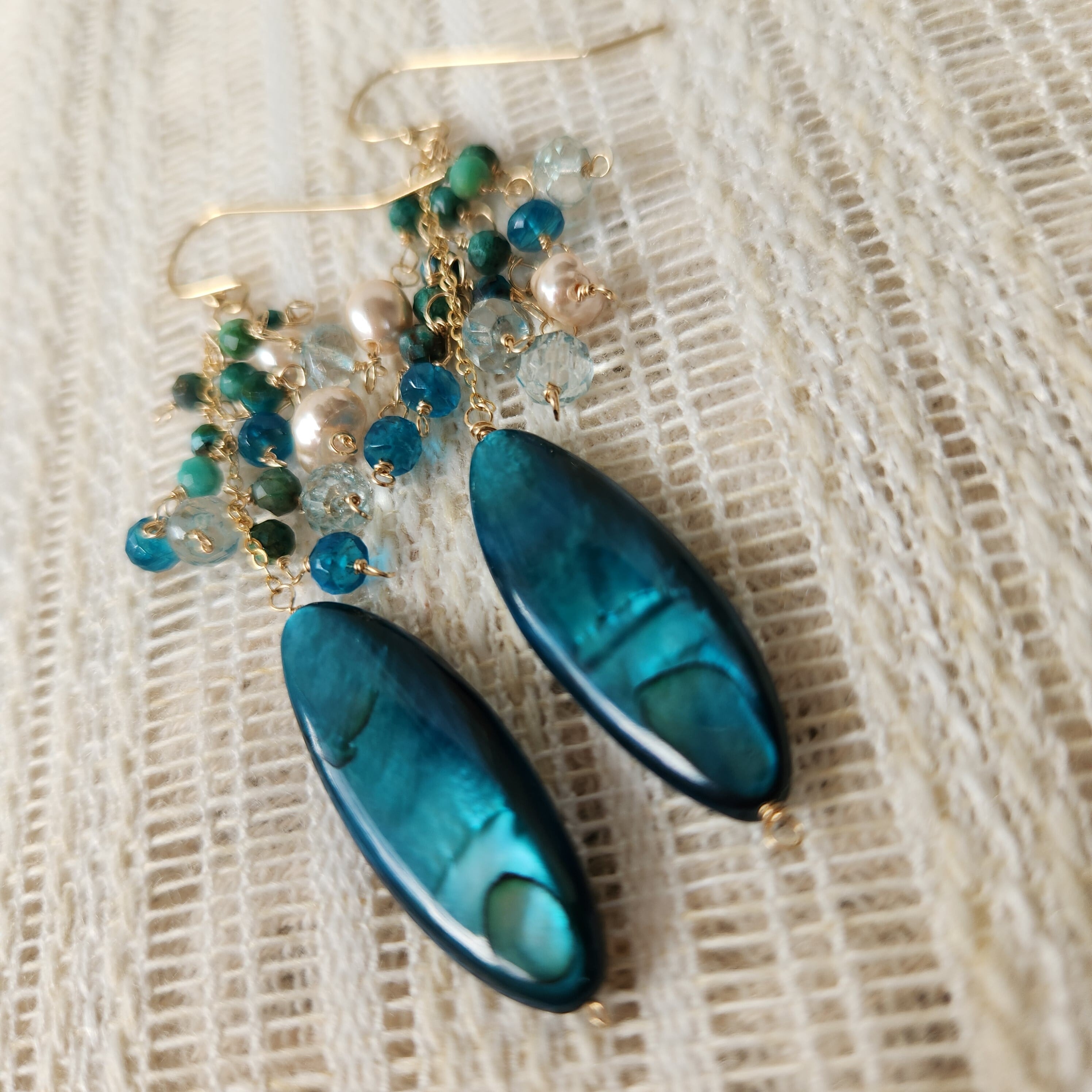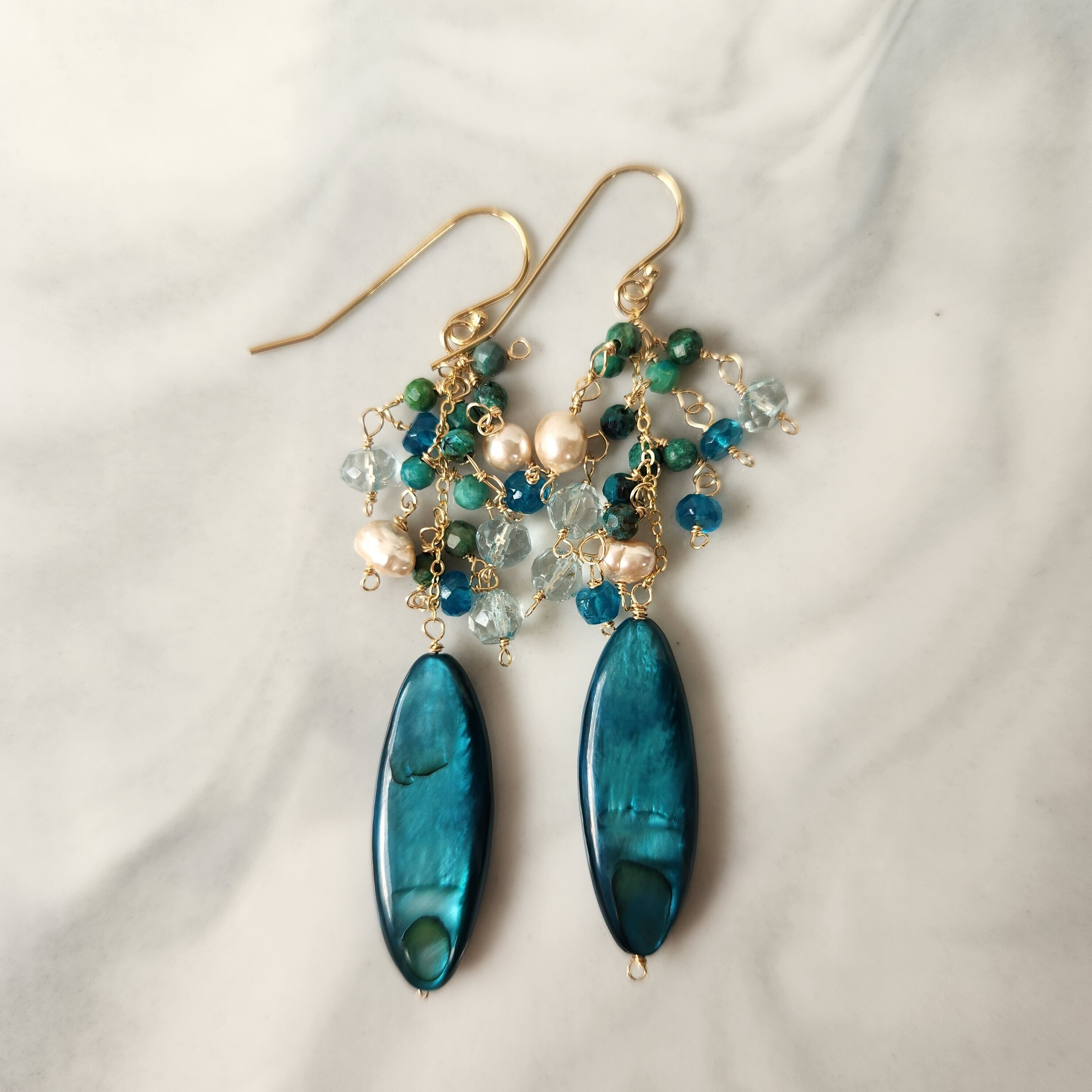 小粒の淡水パール、アパタイト、クリソコラ、コーティングクリスタルを合わせたピアスです。