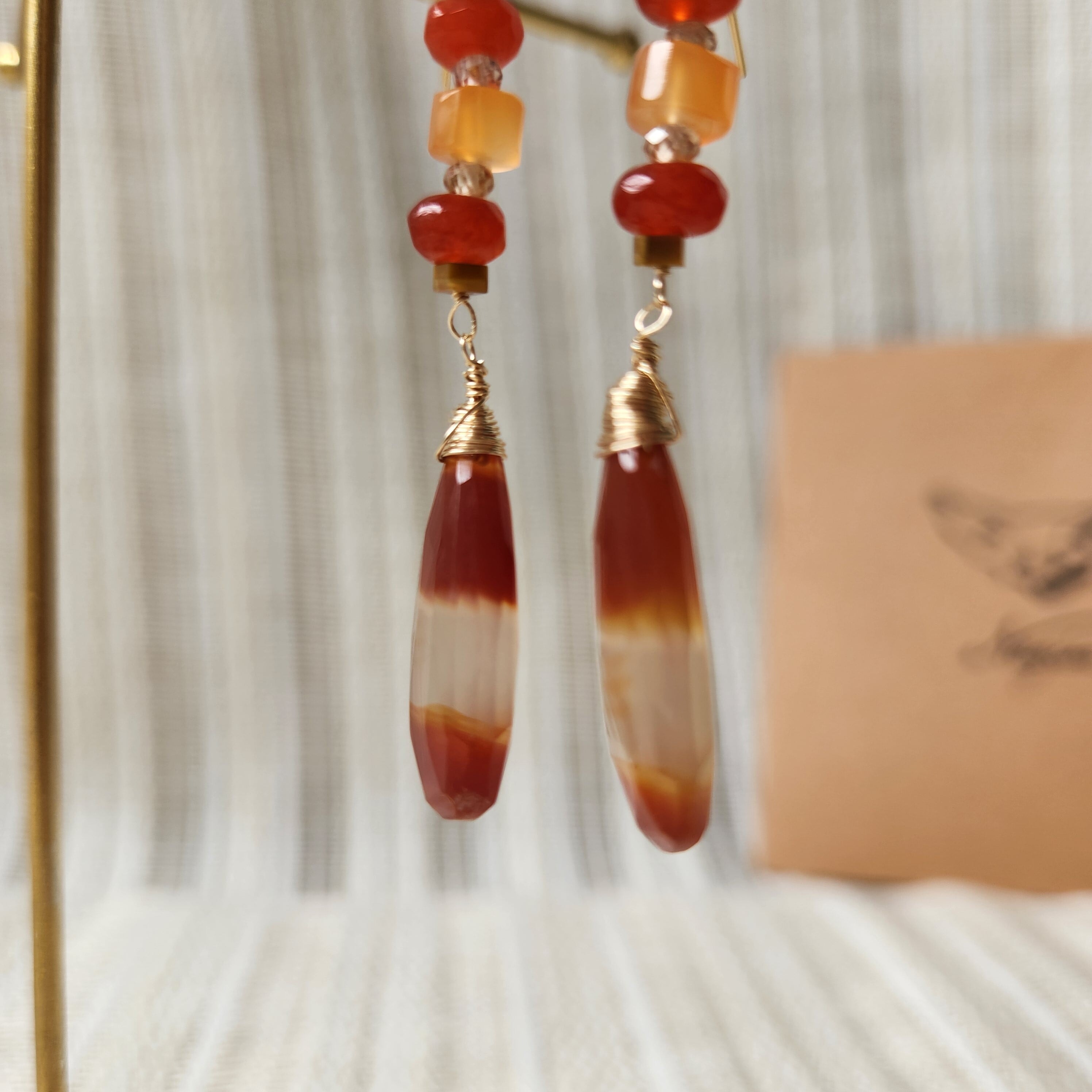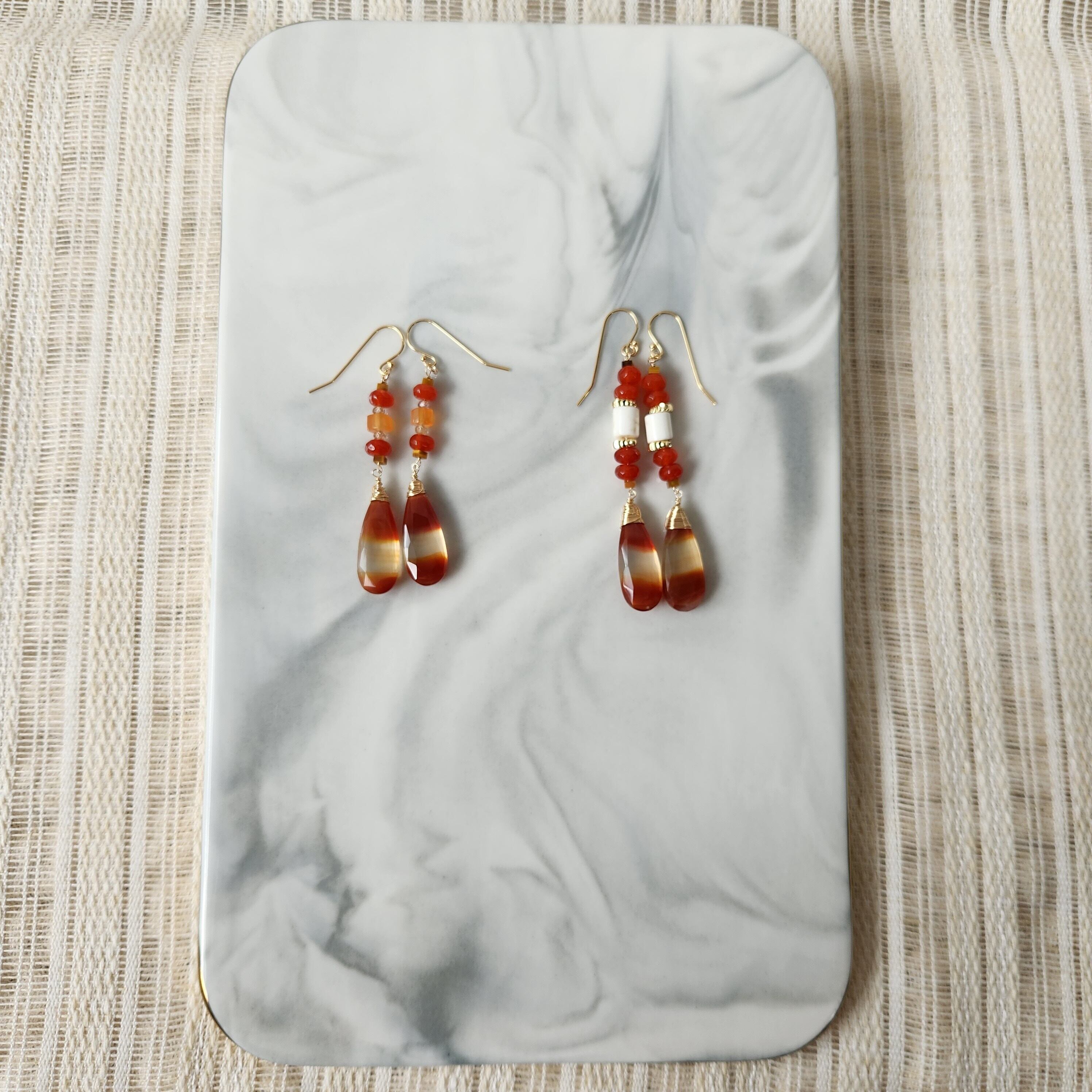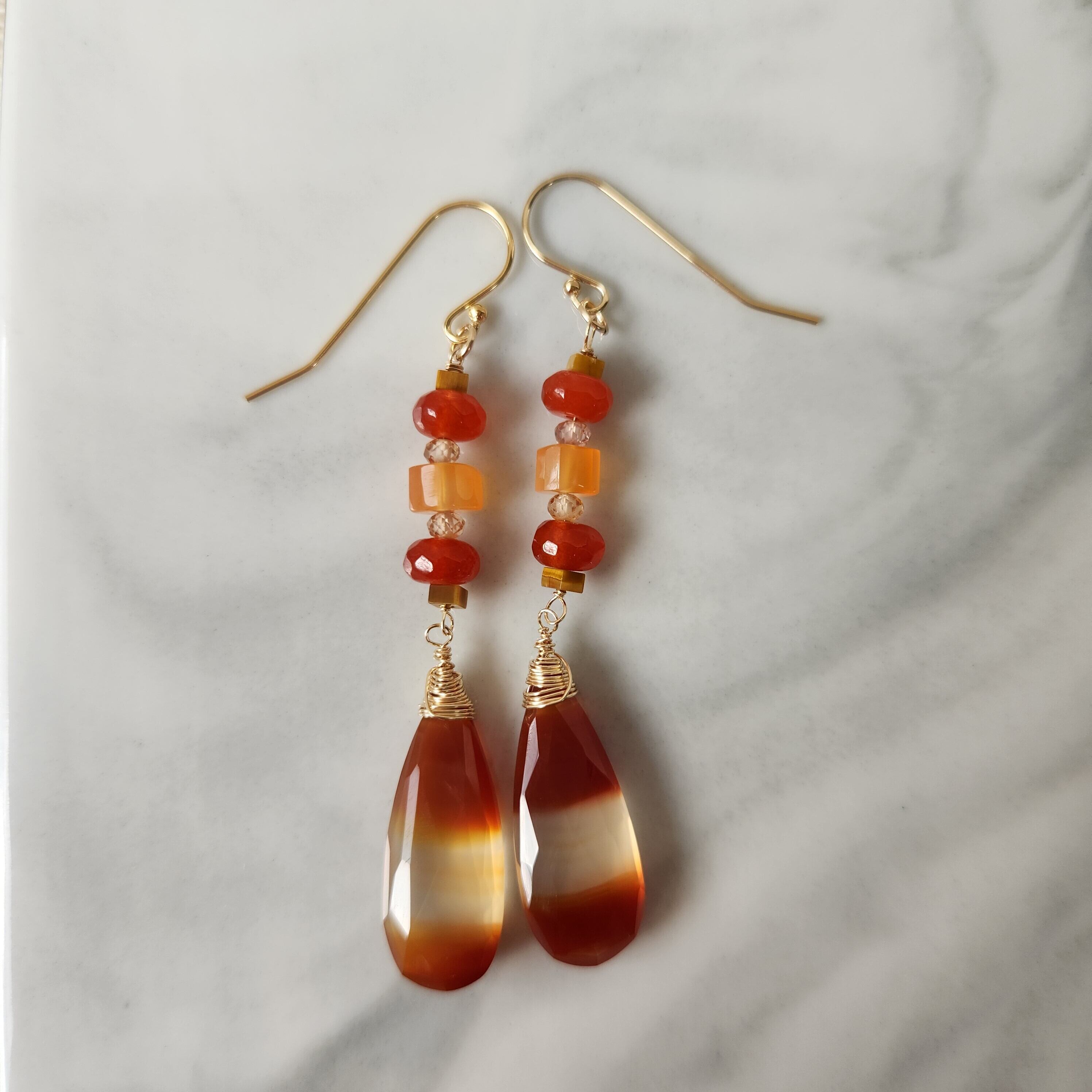 印象的なオレンジとホワイトのバンデッドアゲートをメインに、同色系カラーのレッドジェード、カーネリアンを使用し、イエロータイガーアイ、マルチカラースピネルを小さなポイントに使用したピアスです。