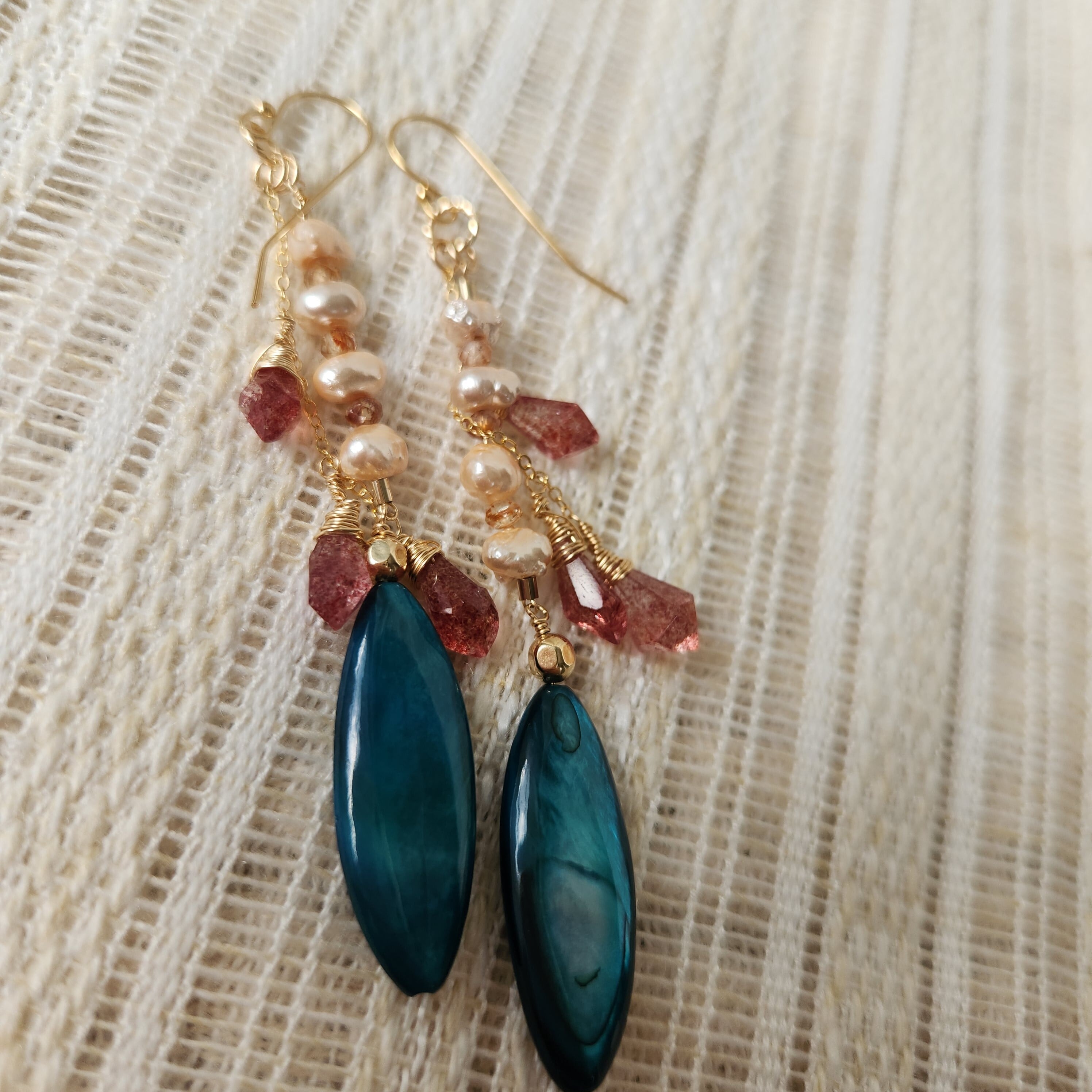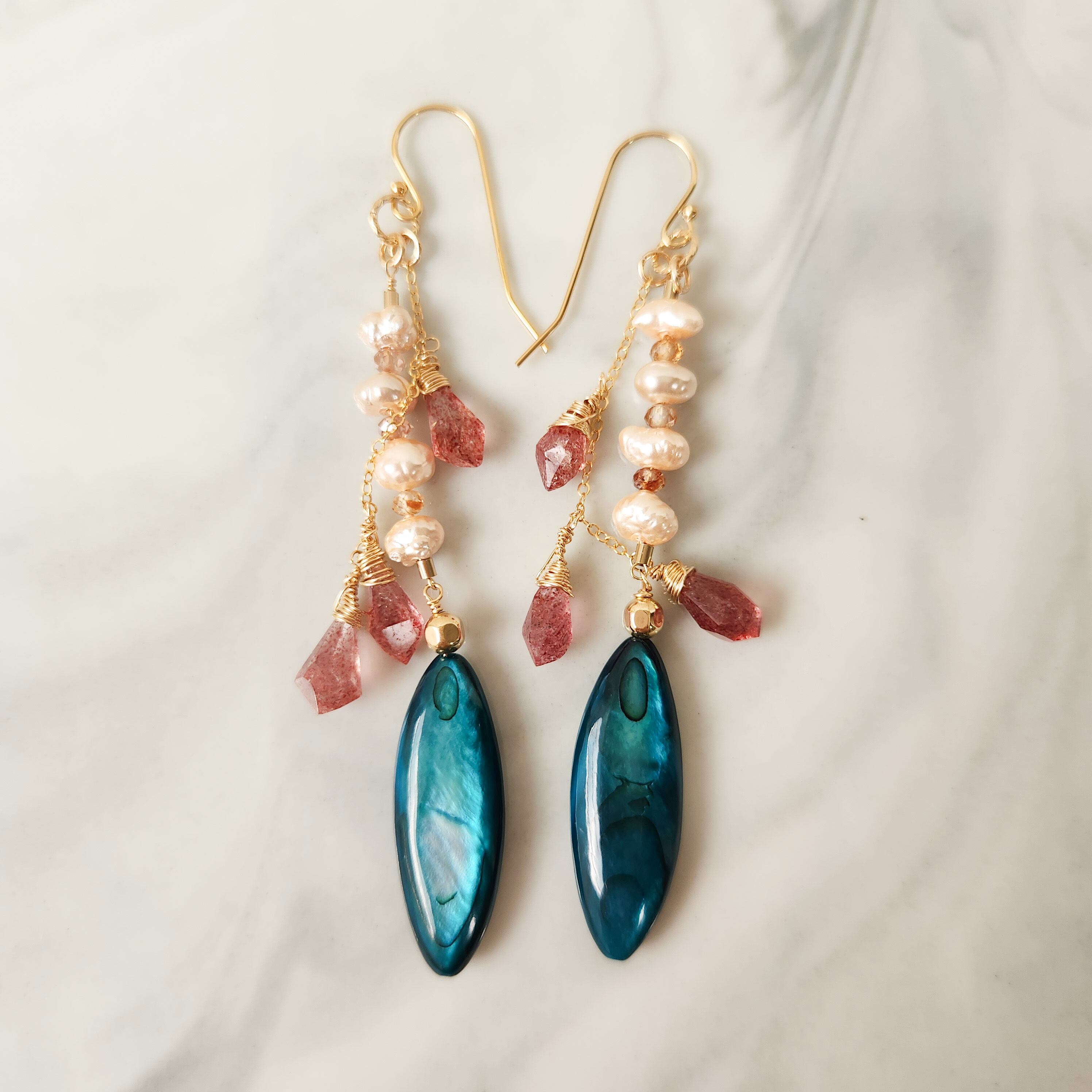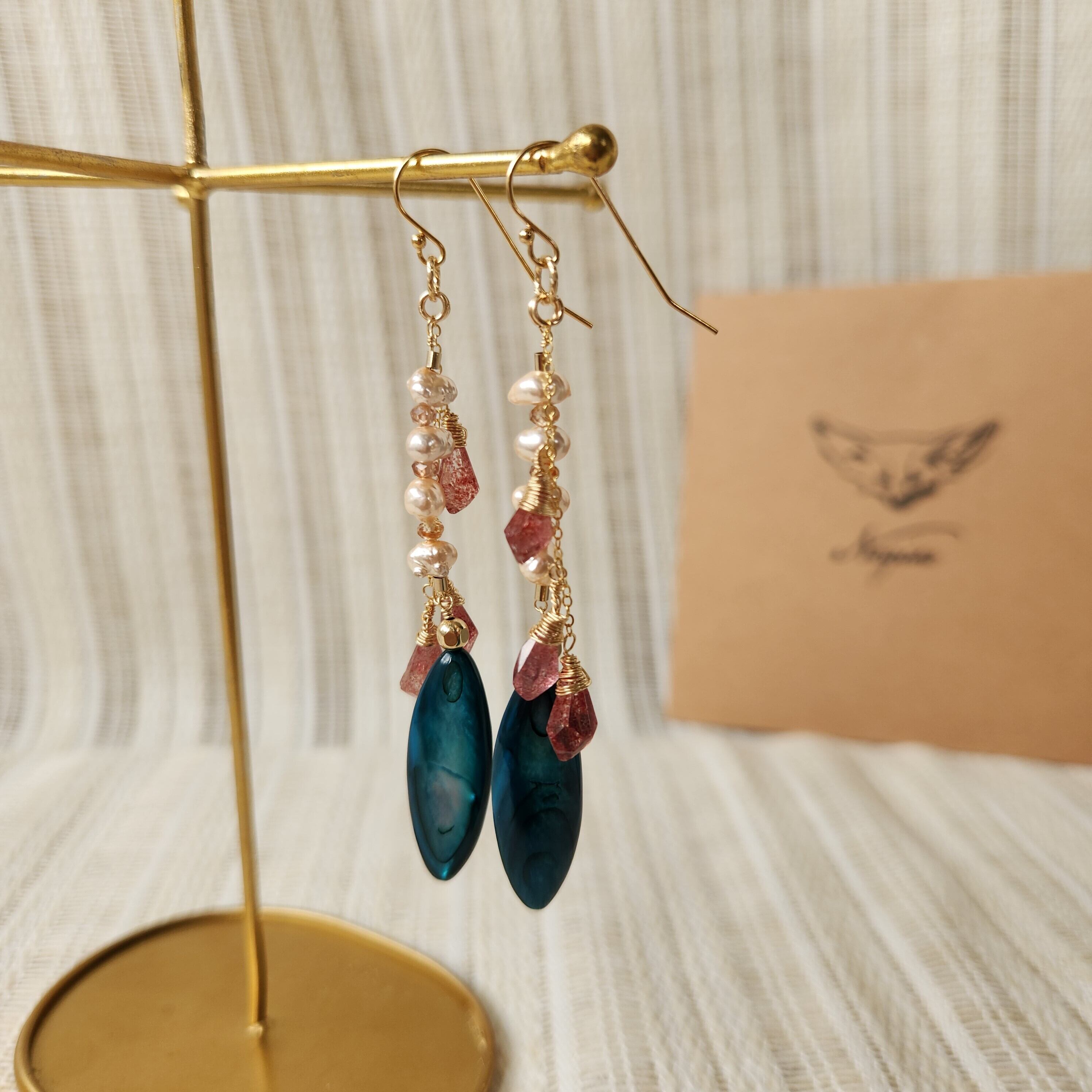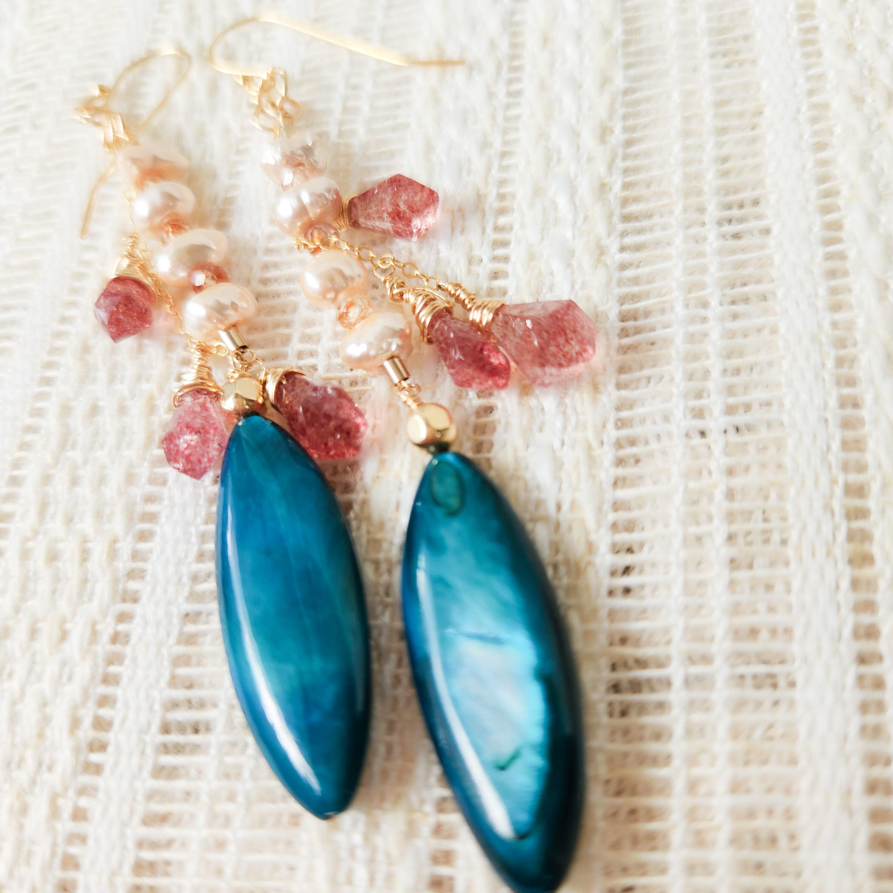 美しいインクルージョンのストロベリークォーツがキラキラと揺れるデザインのピアスです。