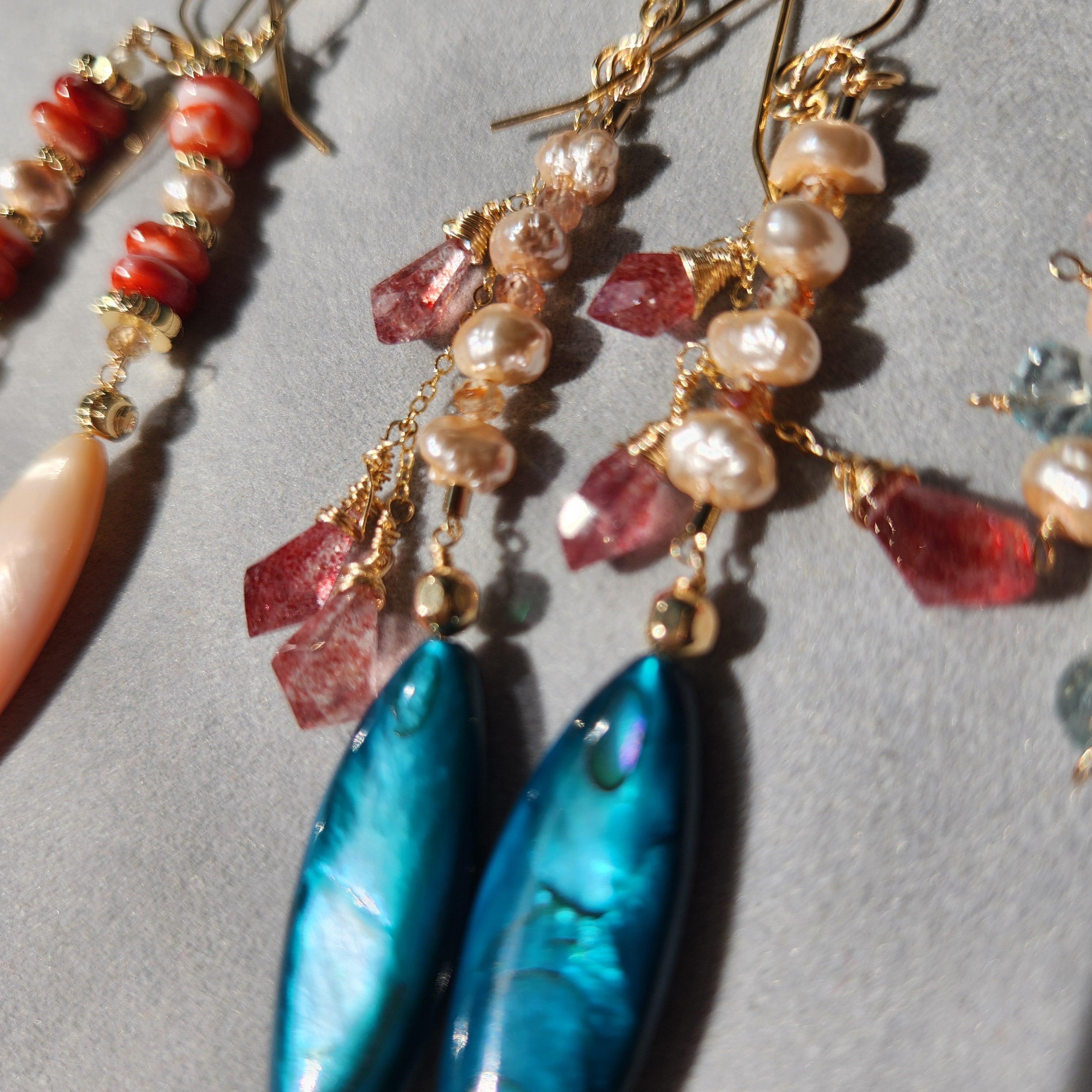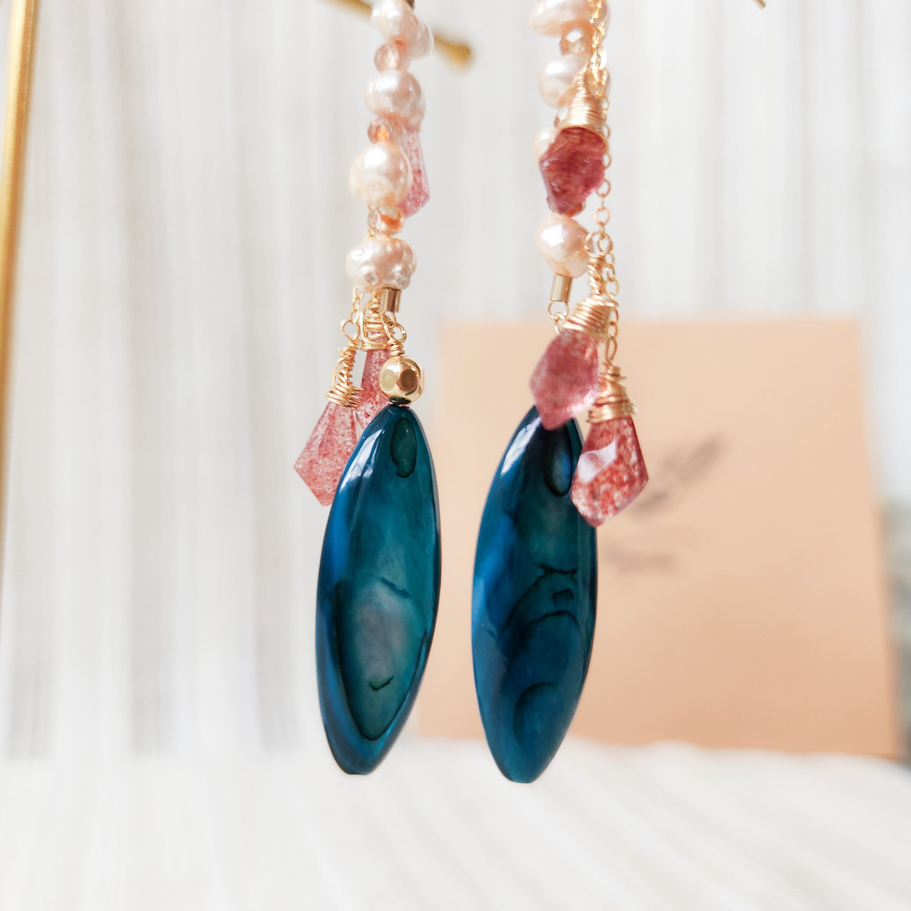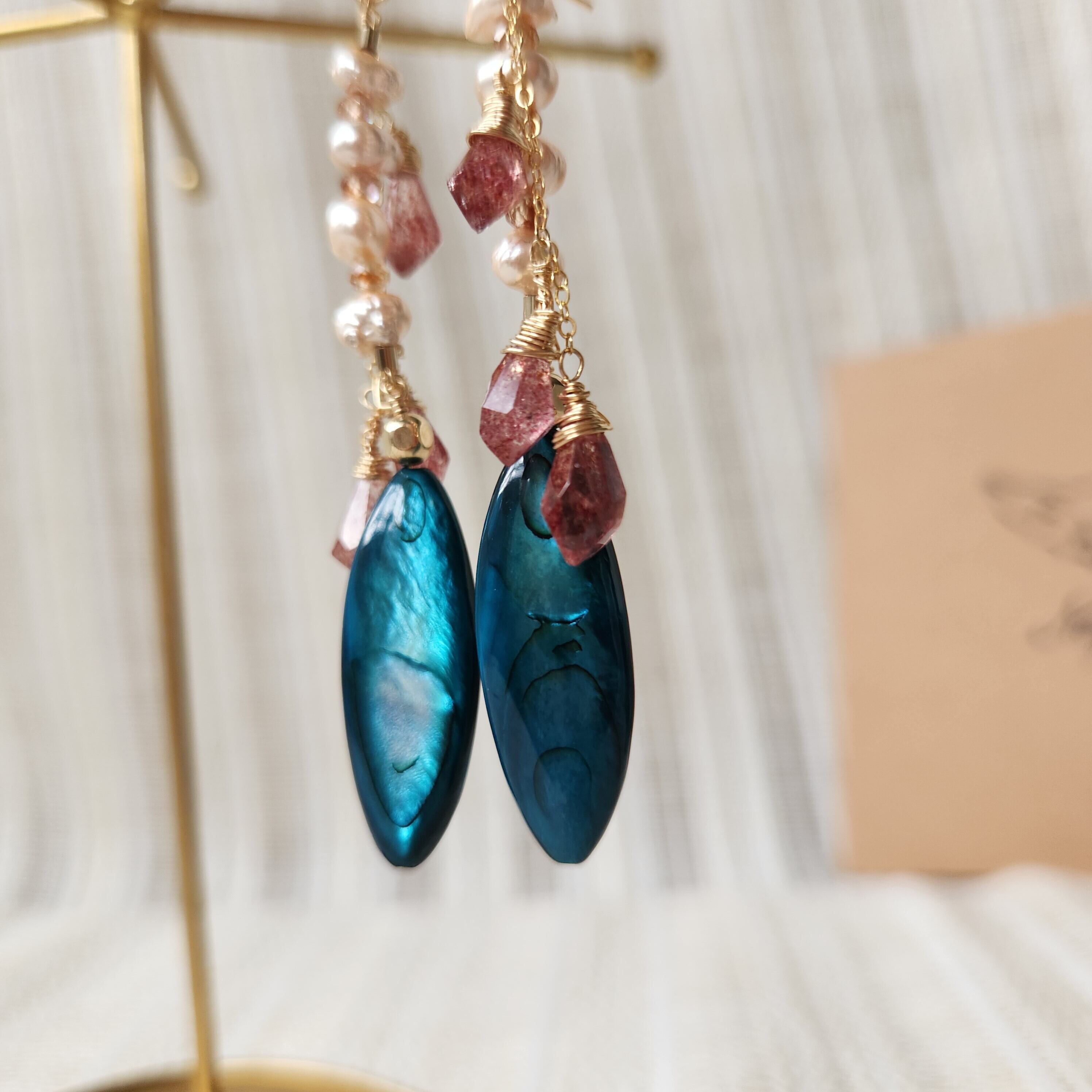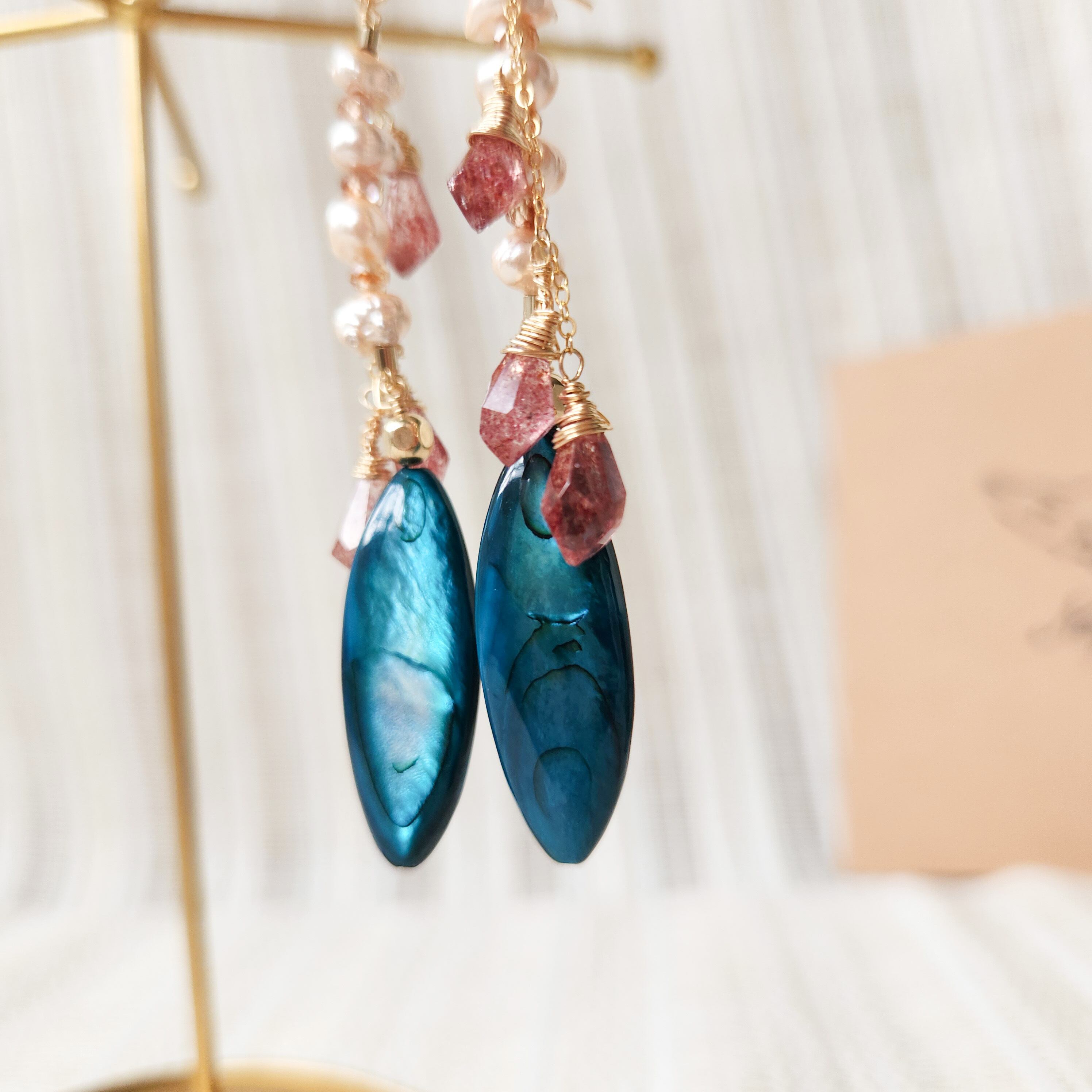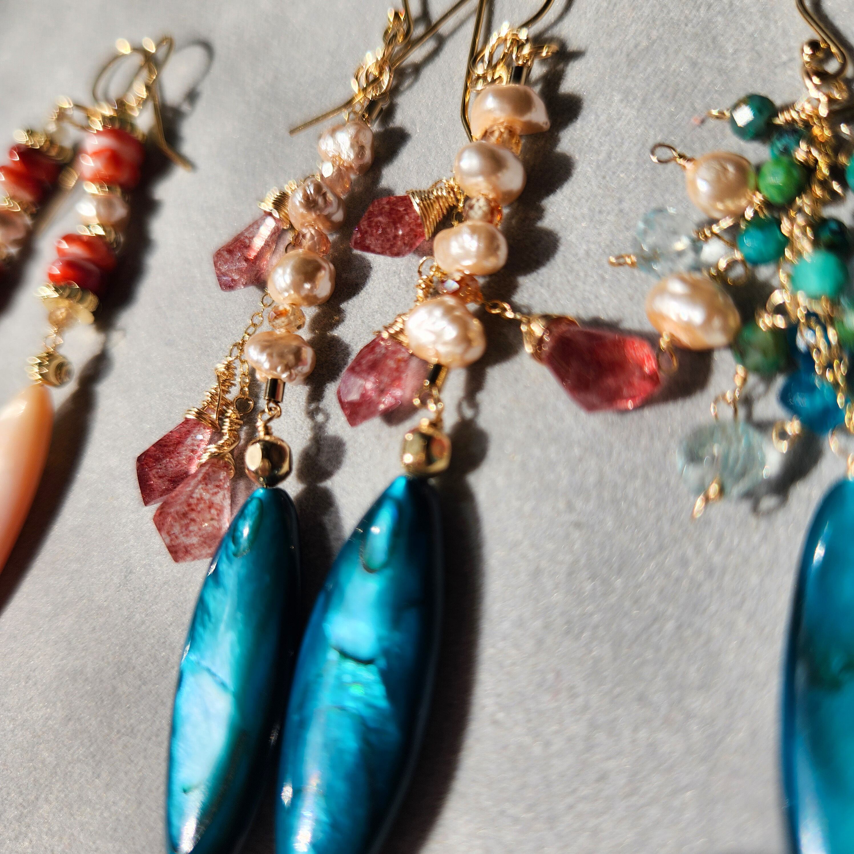 美しいインクルージョンのストロベリークォーツがキラキラと揺れるデザインのピアスです。