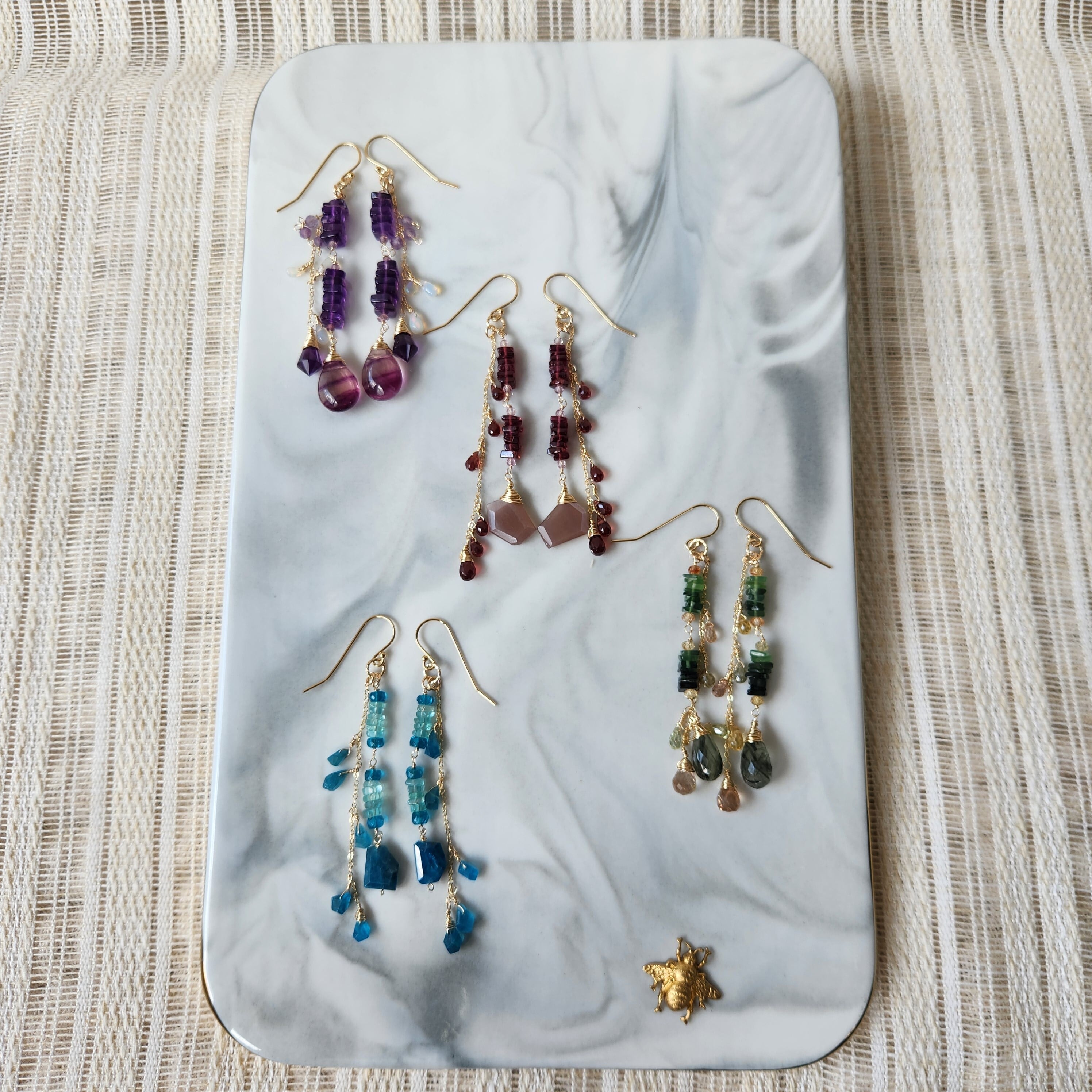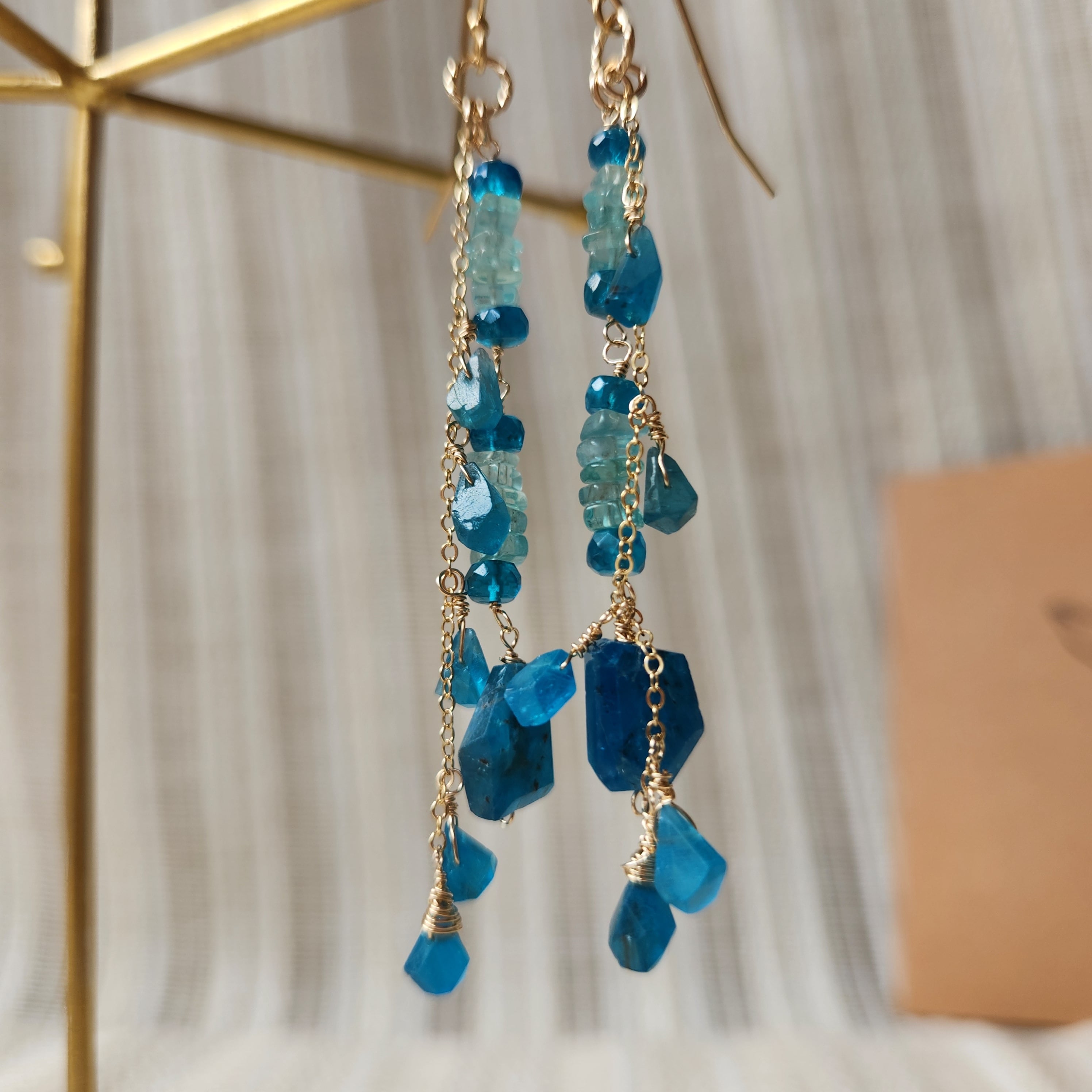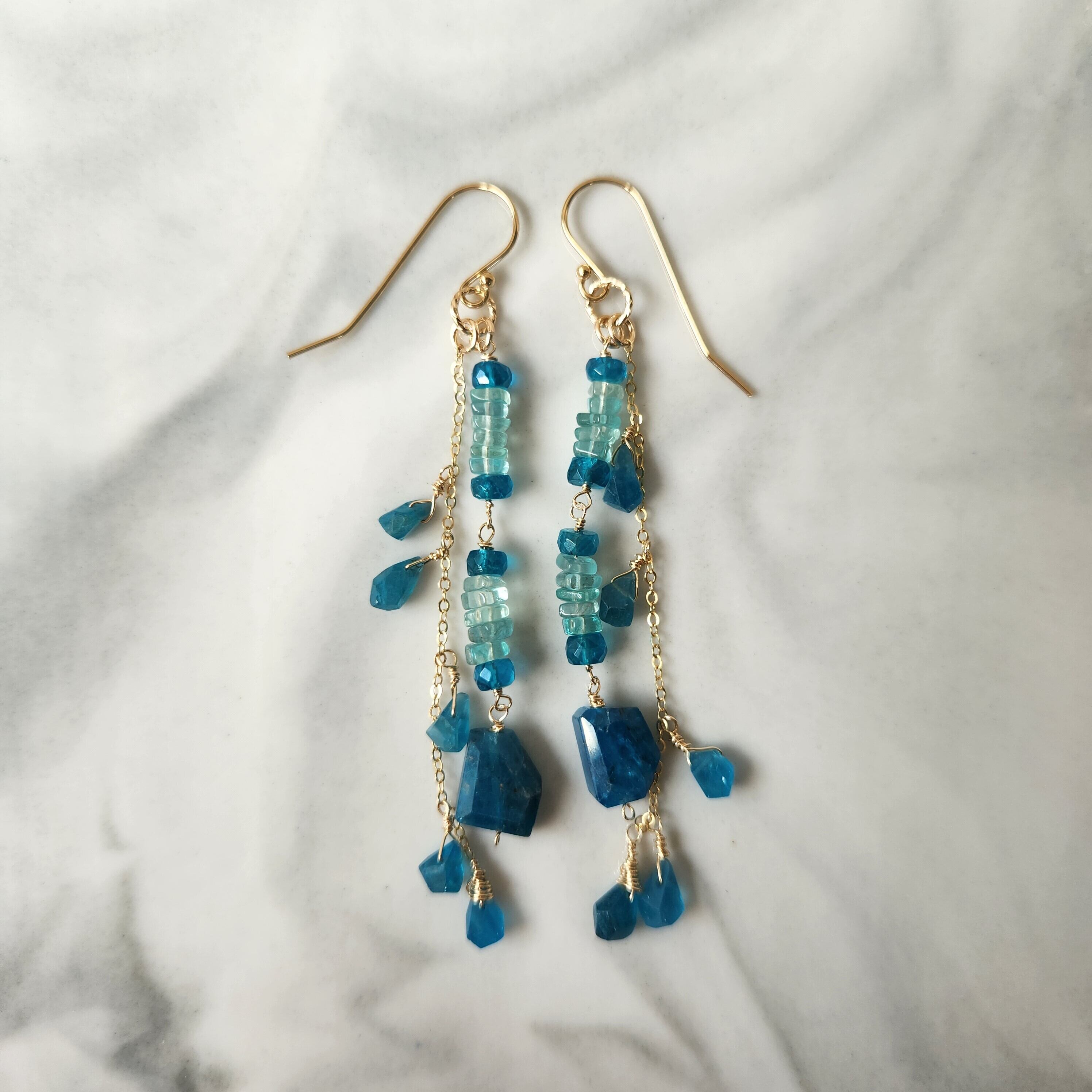 様々なブルーのアパタイトを組み合わせたピアスです。