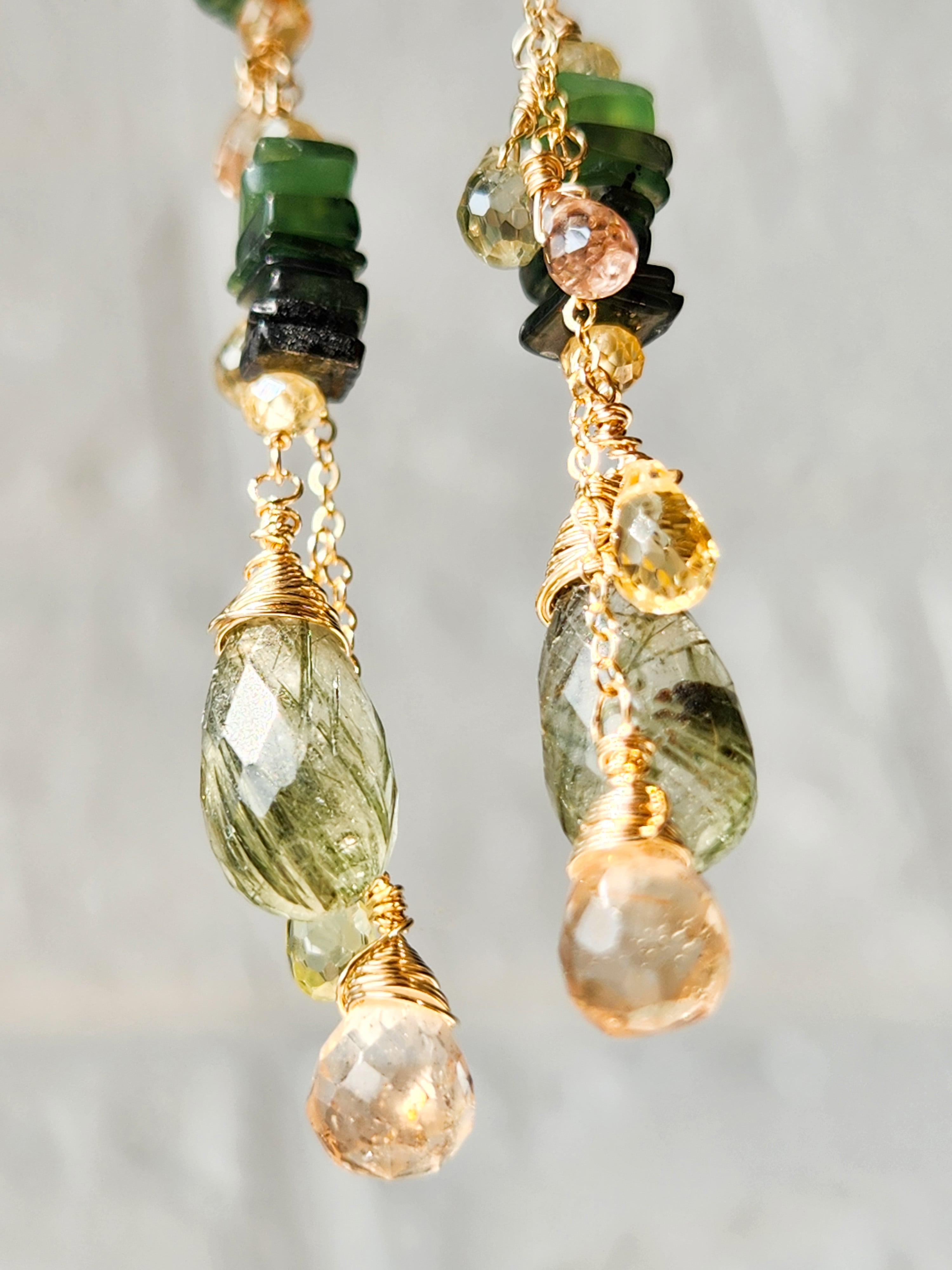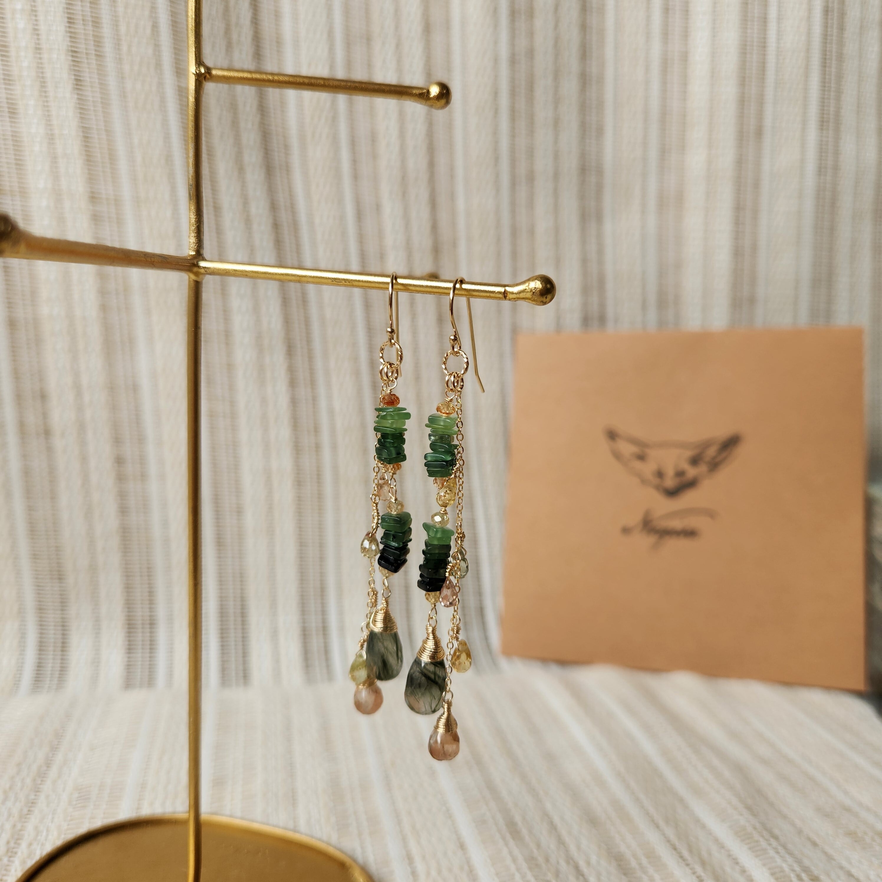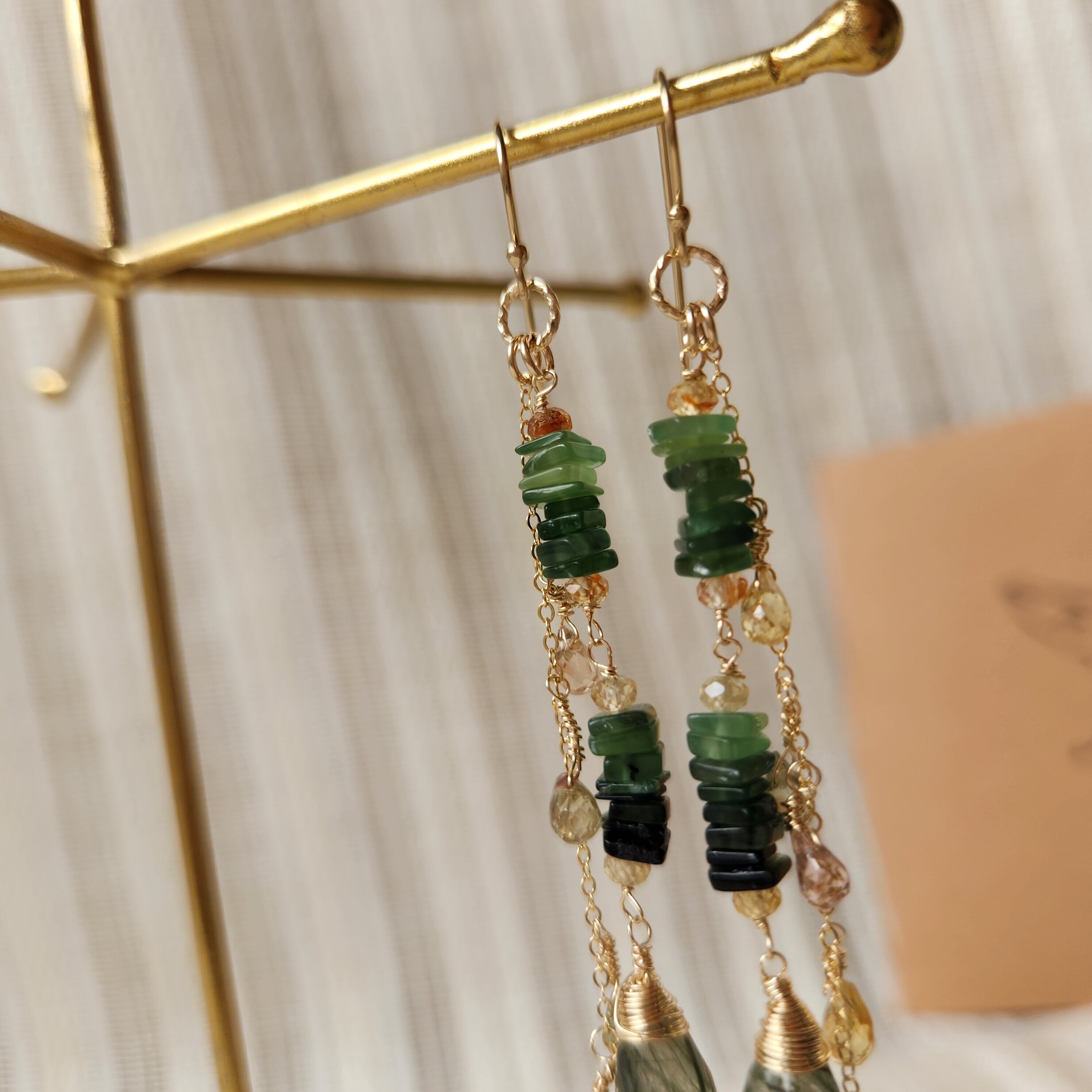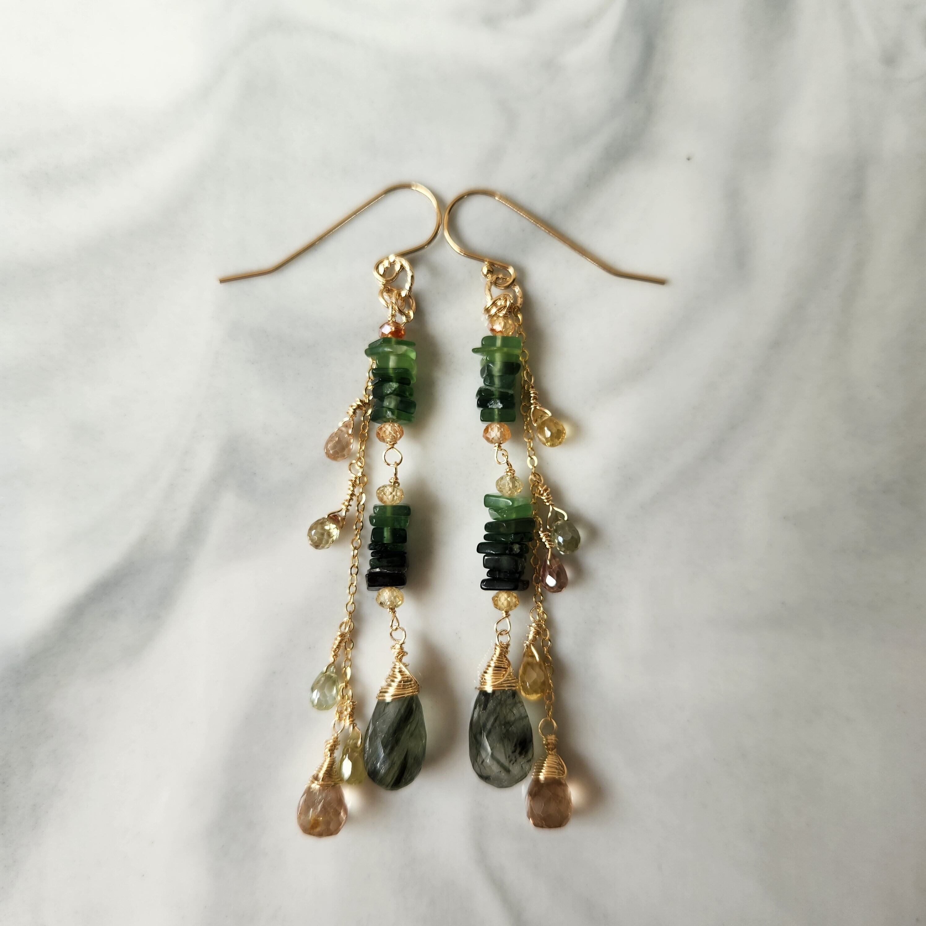 インクルージョンが美しいグリーンルチルクォーツ(アクチノライトインクォーツ)をメインに、透明感が美しいトパーズやジルコンを合わせた、ロングタイプのピアスです。