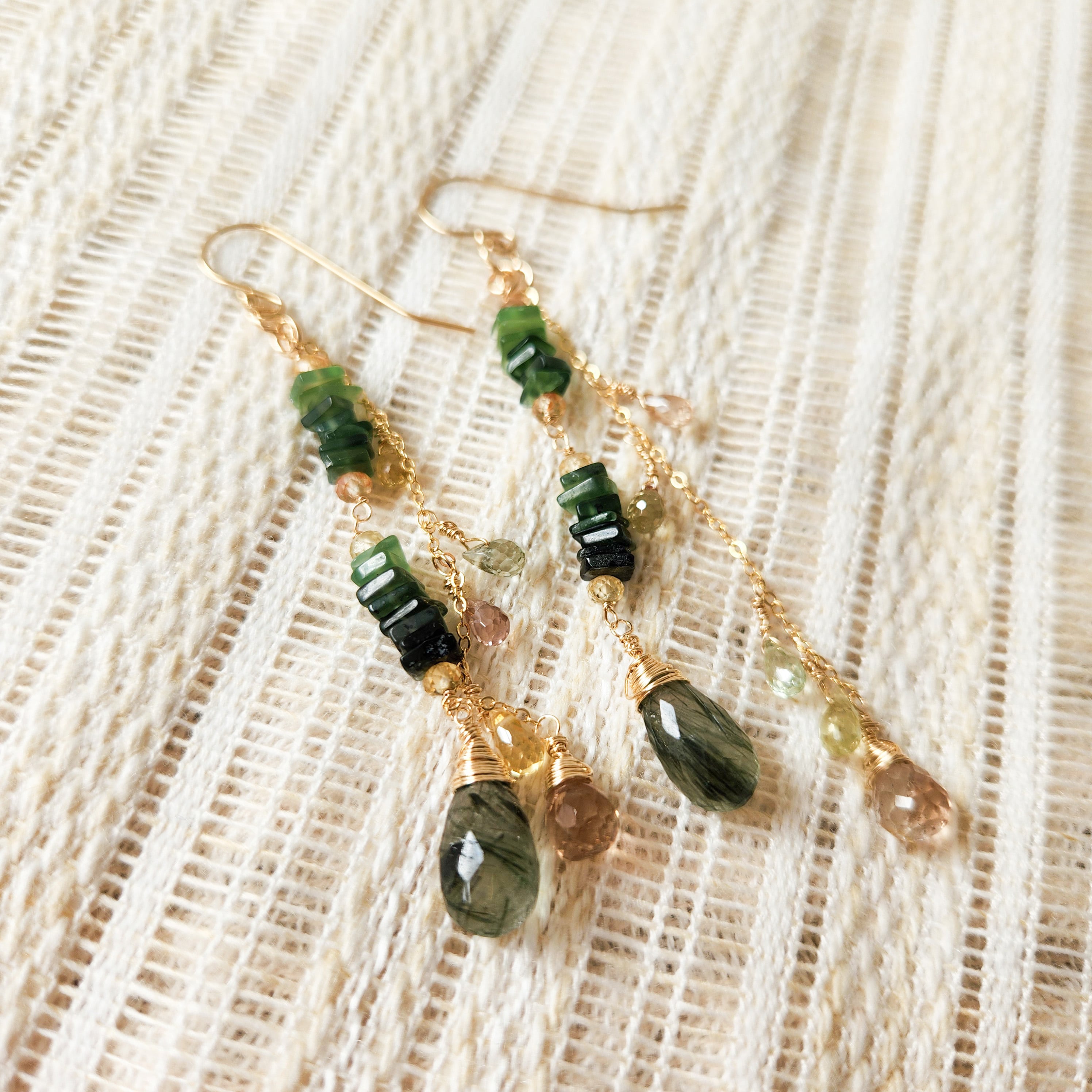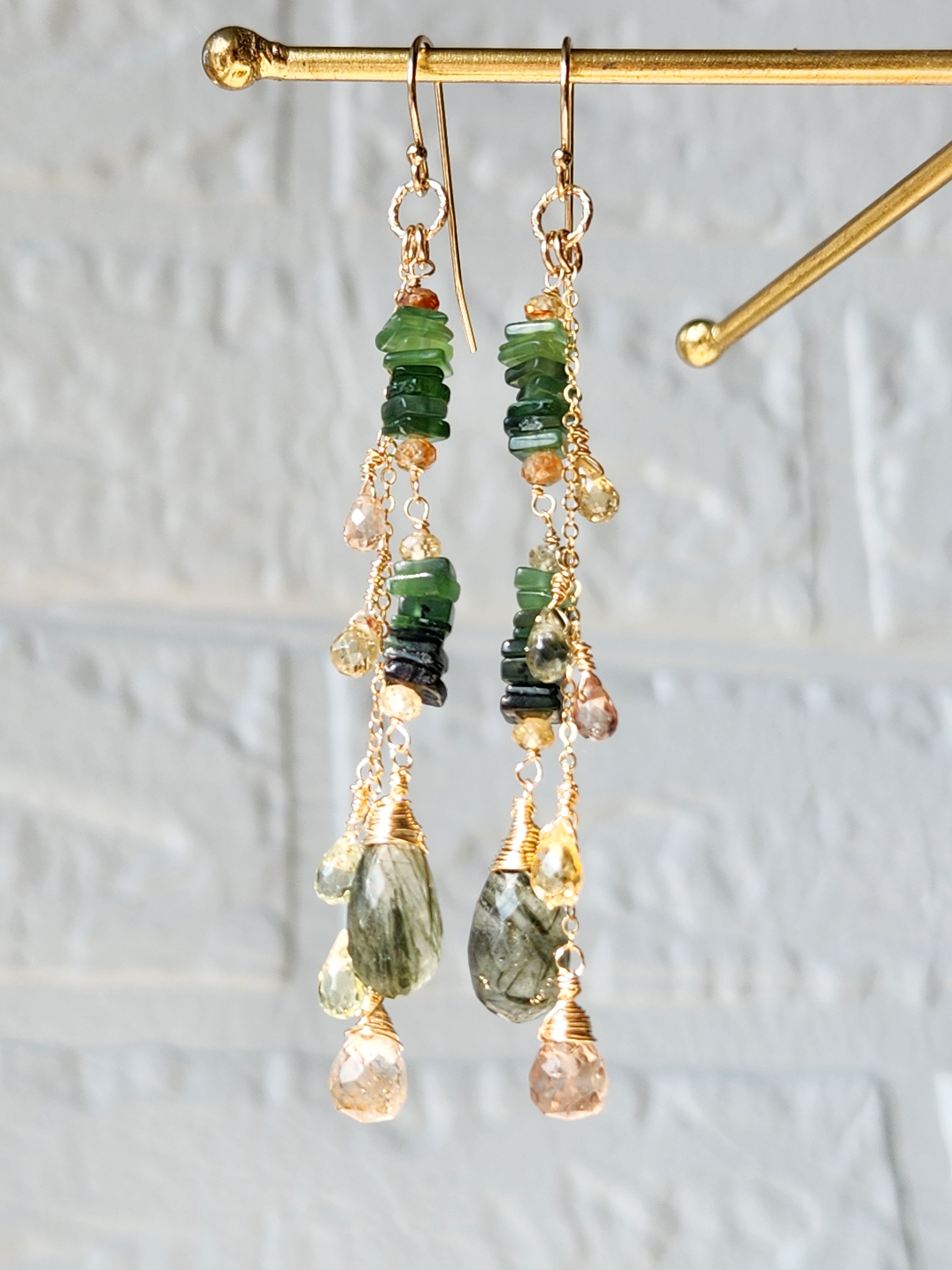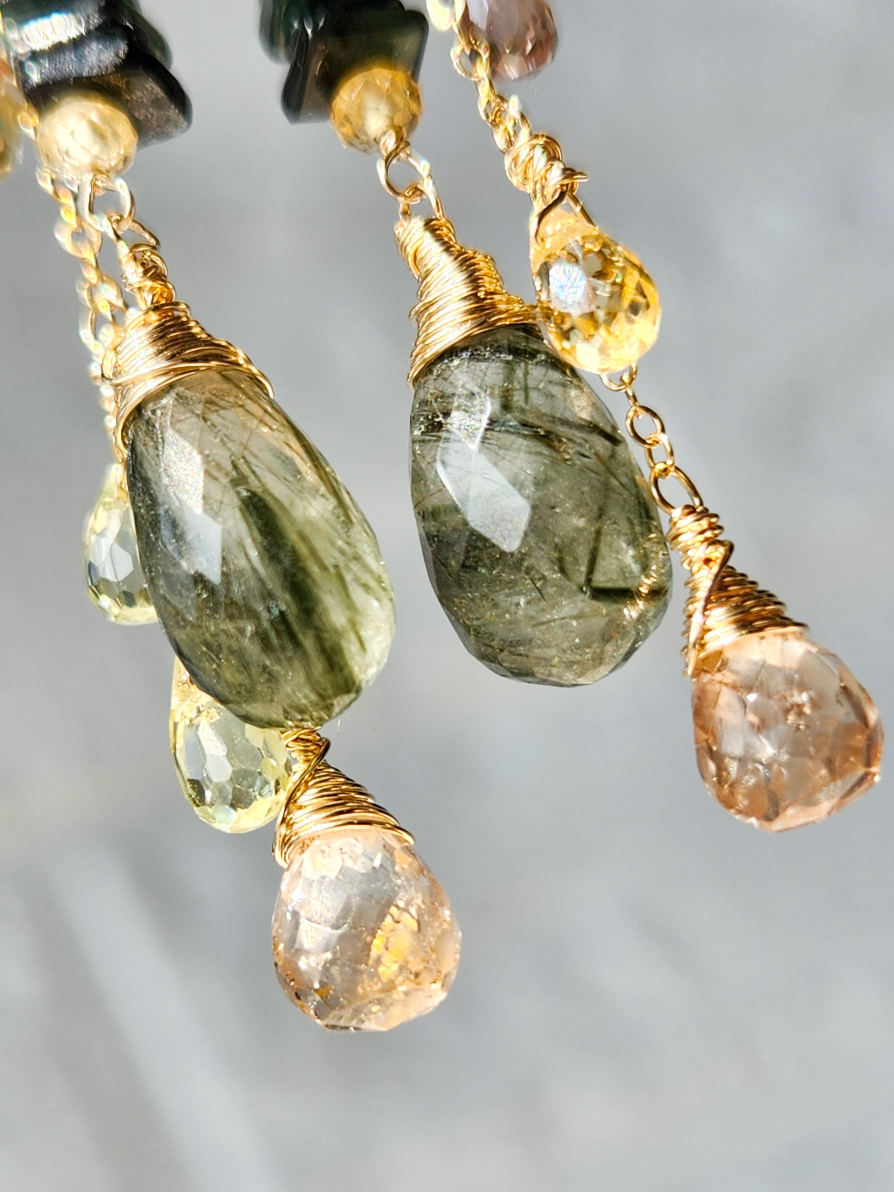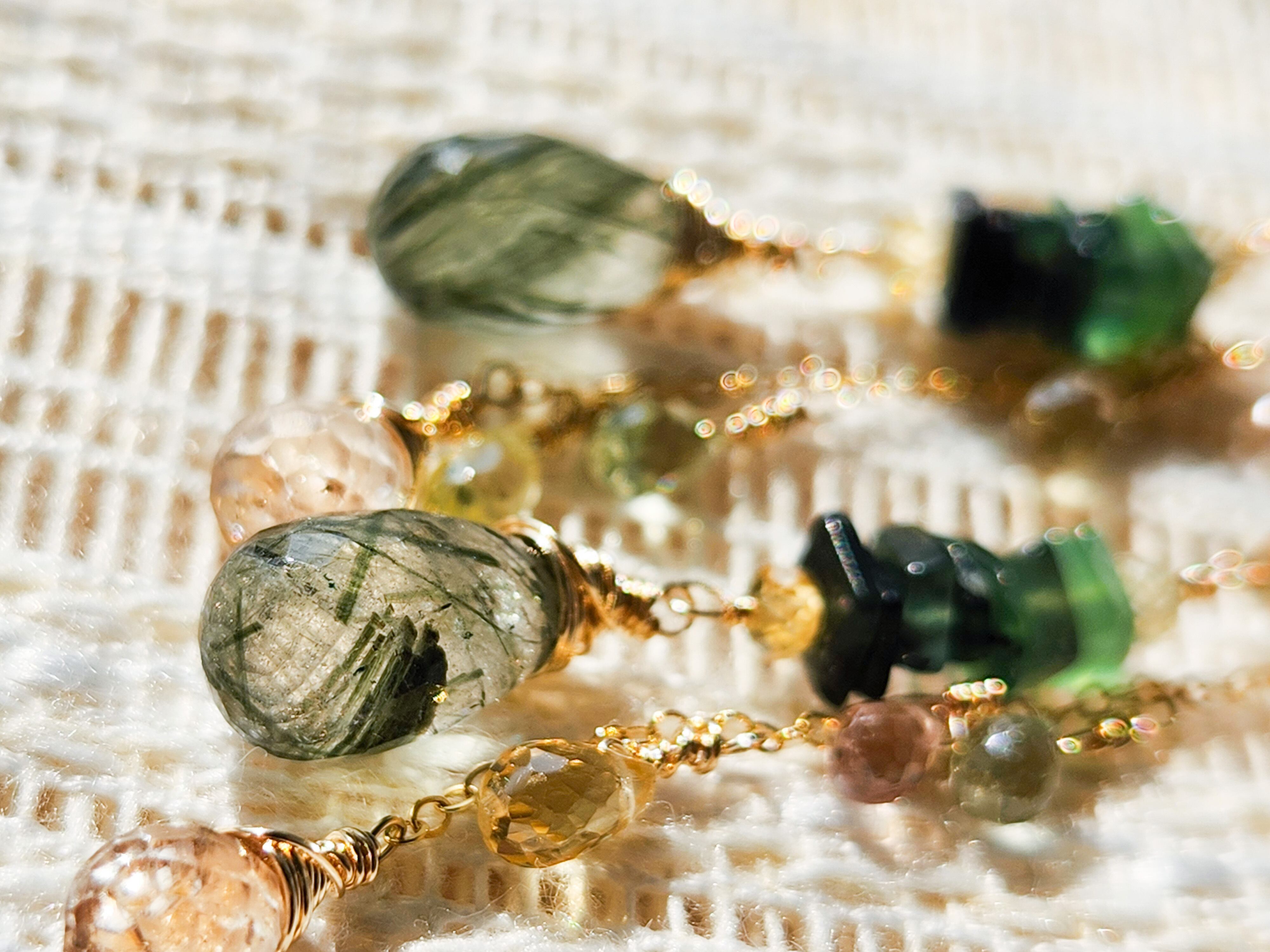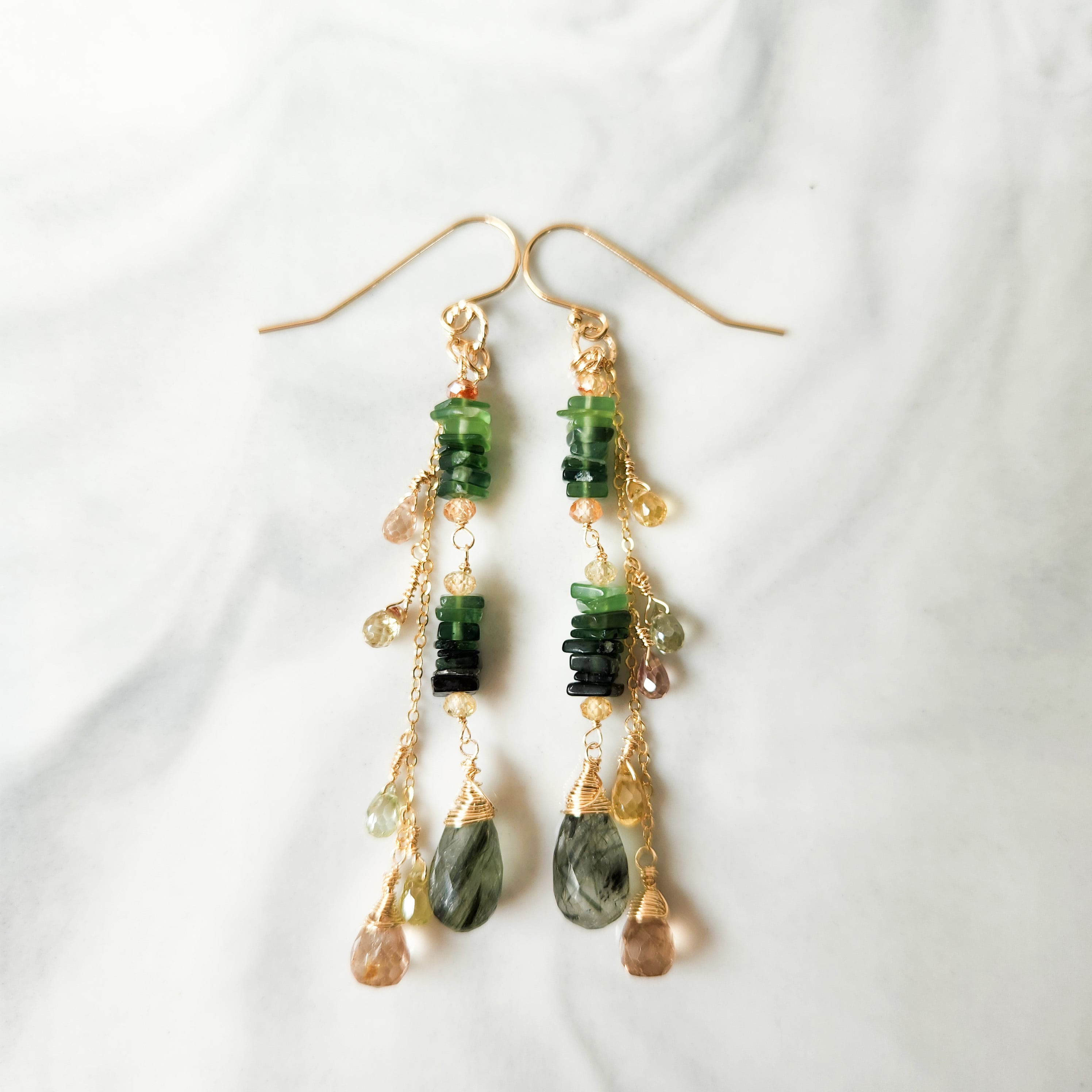 インクルージョンが美しいグリーンルチルクォーツ(アクチノライトインクォーツ)をメインに、透明感が美しいトパーズやジルコンを合わせた、ロングタイプのピアスです。
