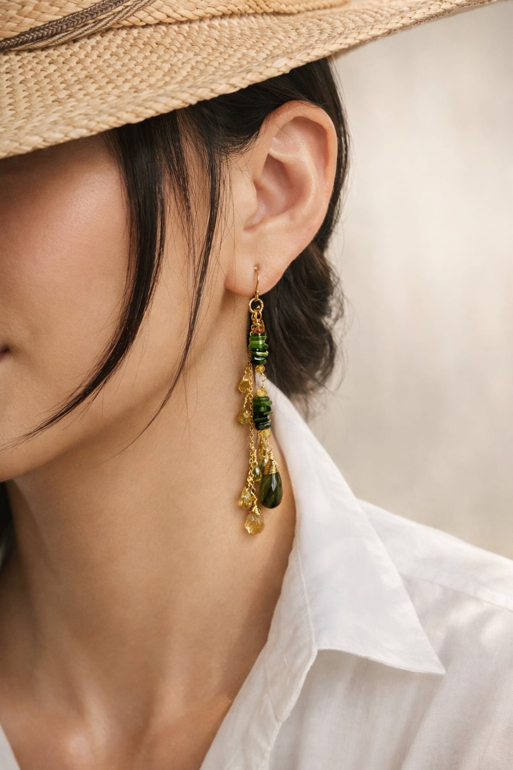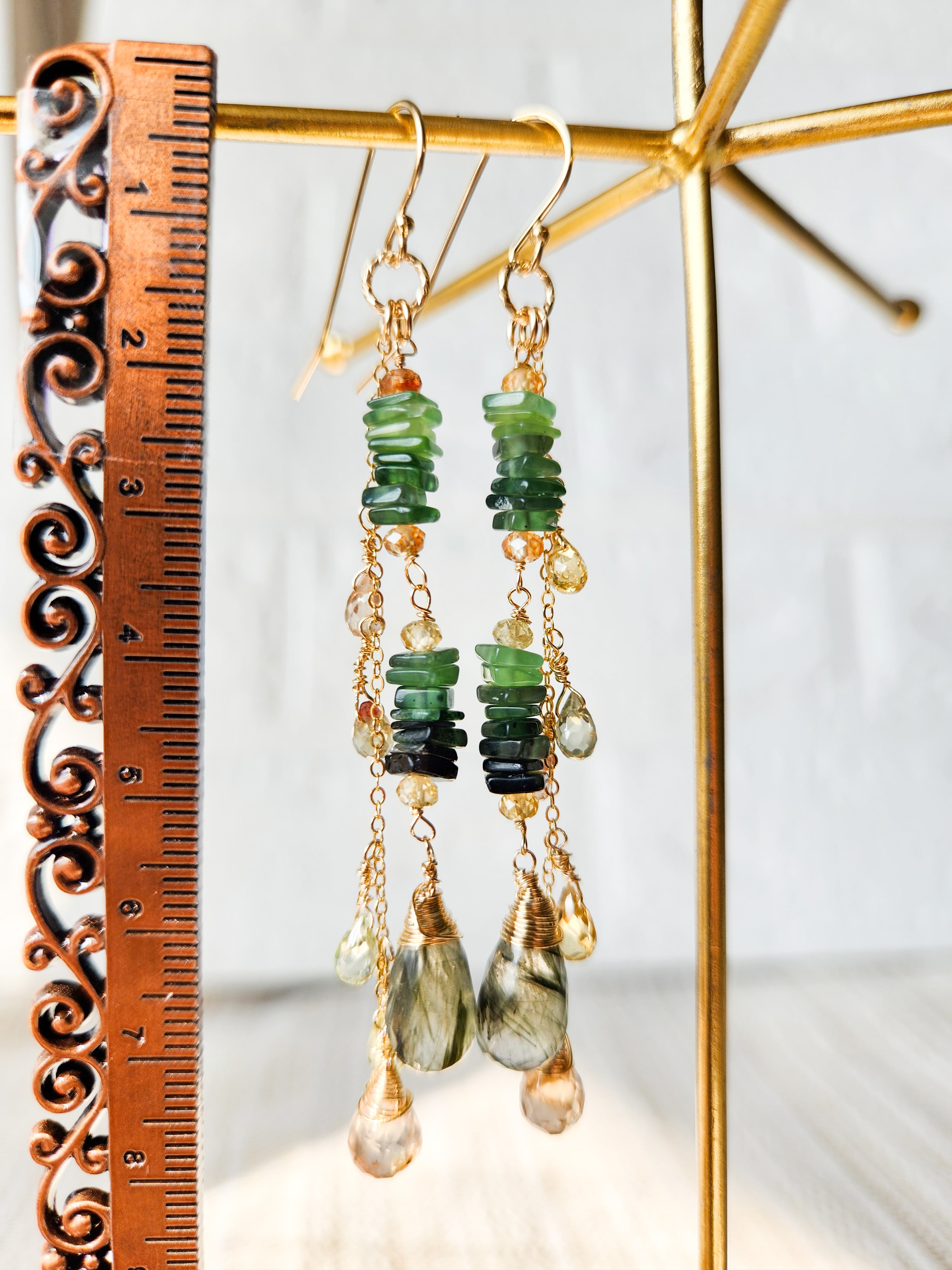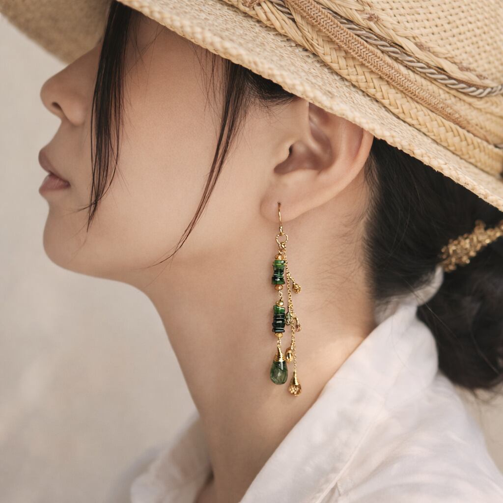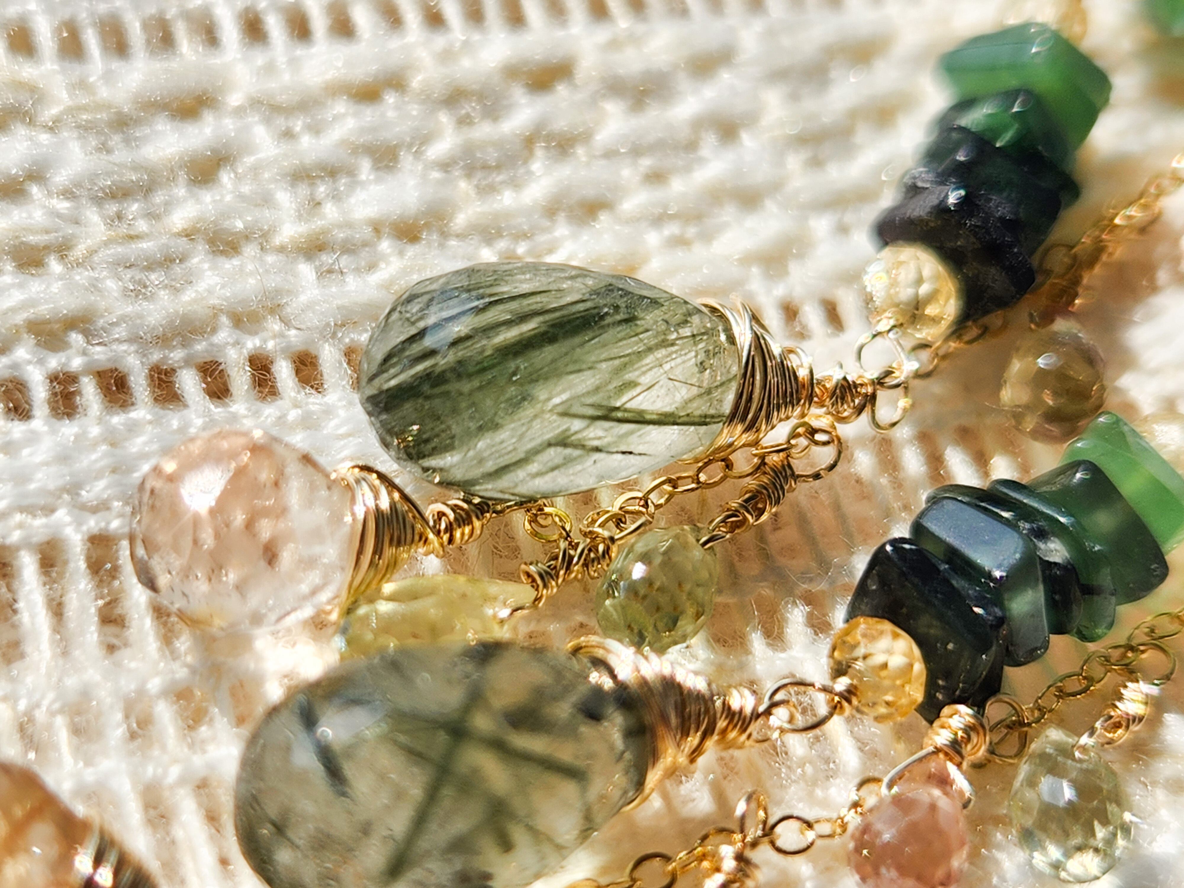 インクルージョンが美しいグリーンルチルクォーツ(アクチノライトインクォーツ)をメインに、透明感が美しいトパーズやジルコンを合わせた、ロングタイプのピアスです。