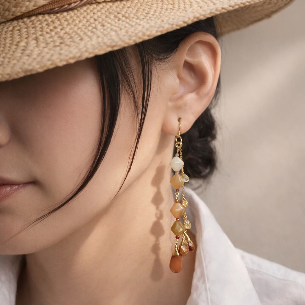 個性的なレディッシュブラウンジルコンが柔らかい色合いの中にアクセントとして煌めきます。