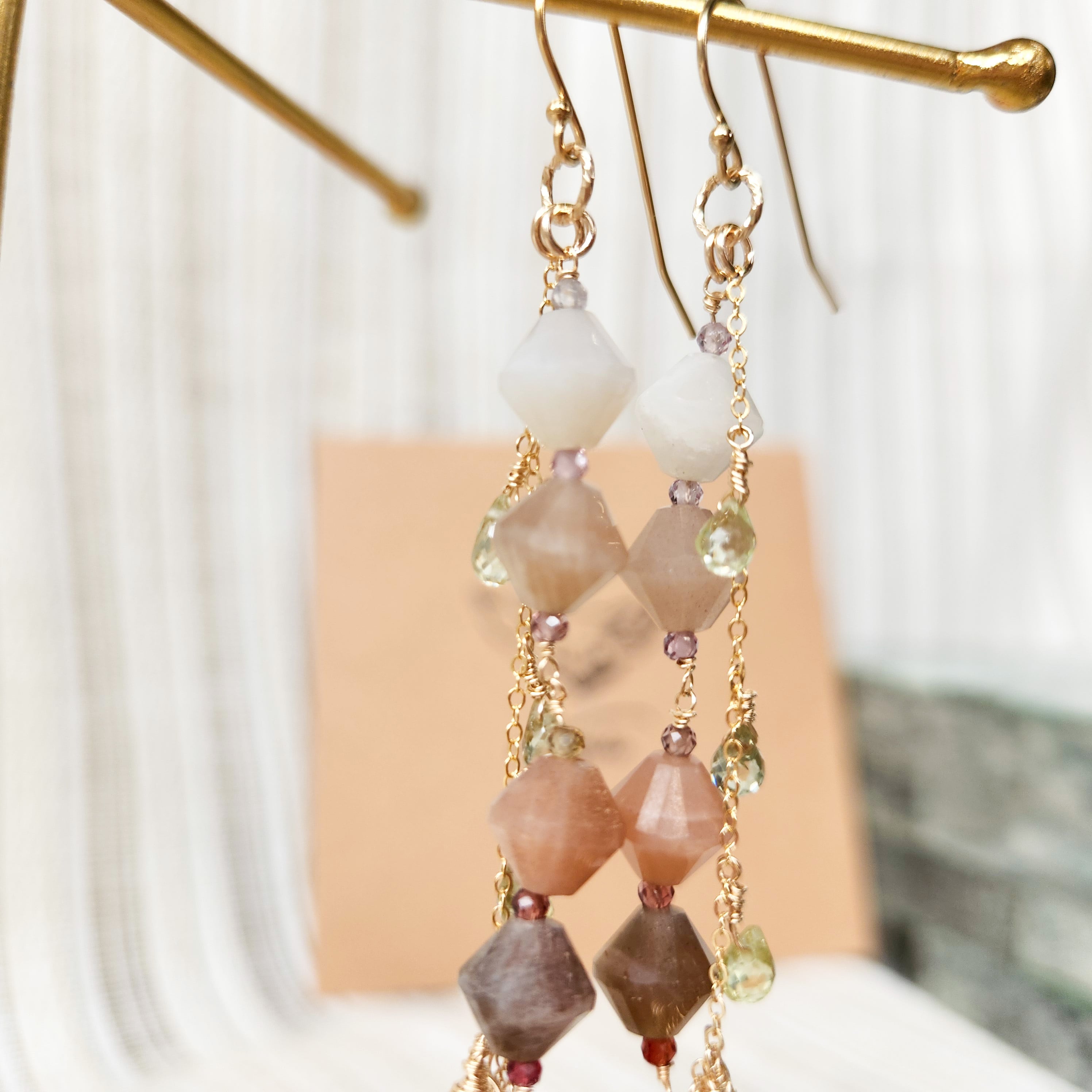 存在感のあるサイズのマルチカラーのムーンストーンが揺れる度に表情を変えて輝きます。