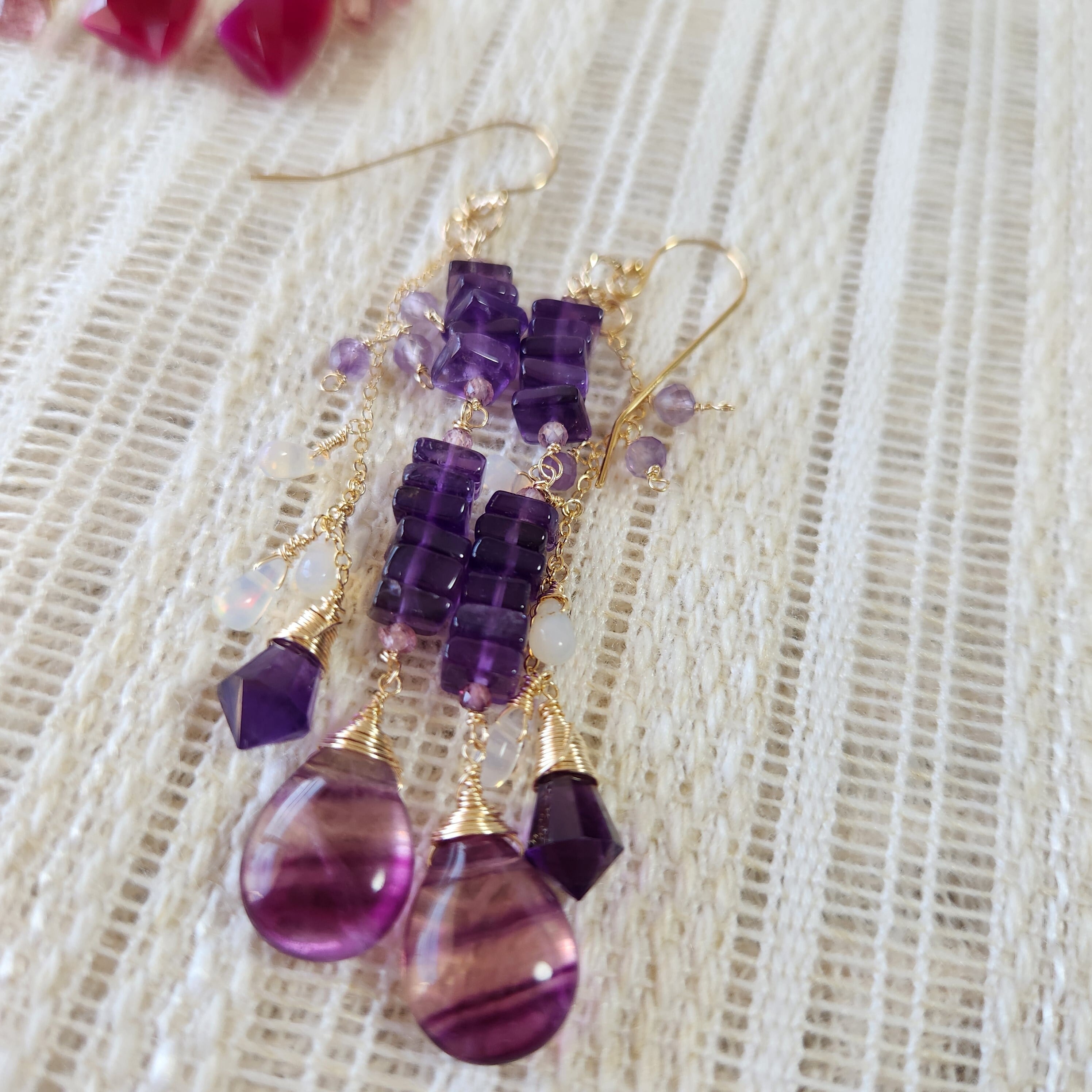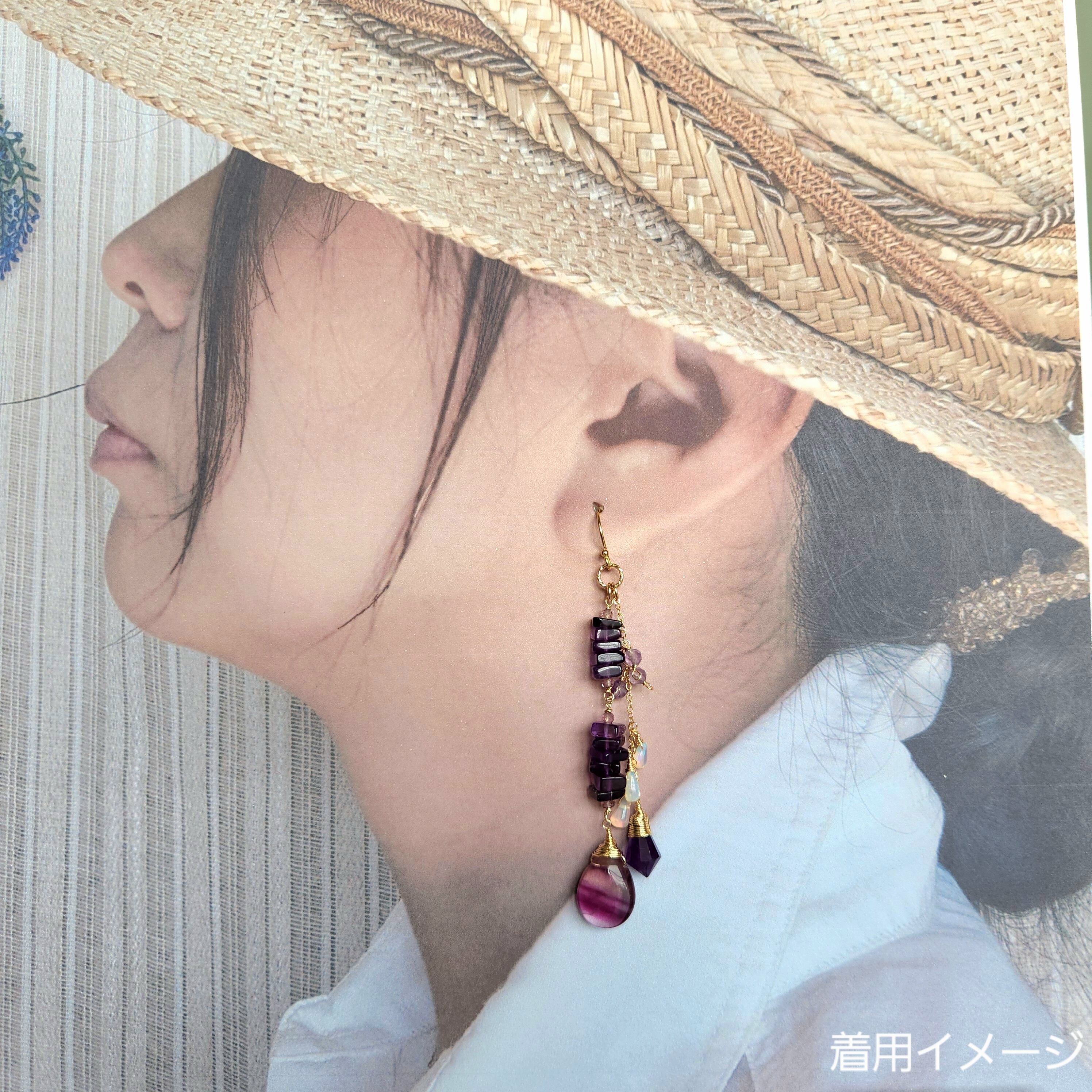 原石由来の縞模様が美しいフローライトをメインに、発色の良いアメシストを組み合わせたピアスです。