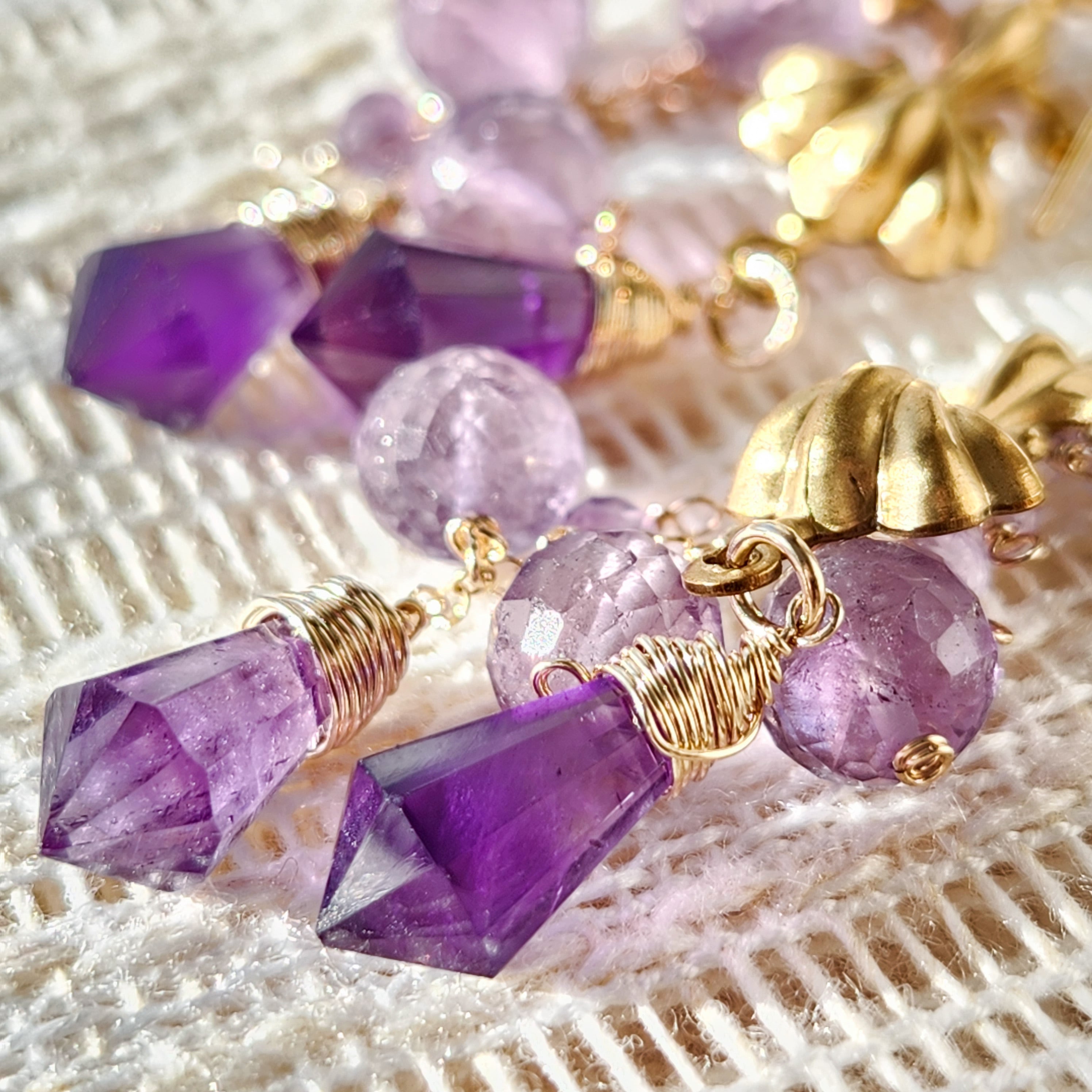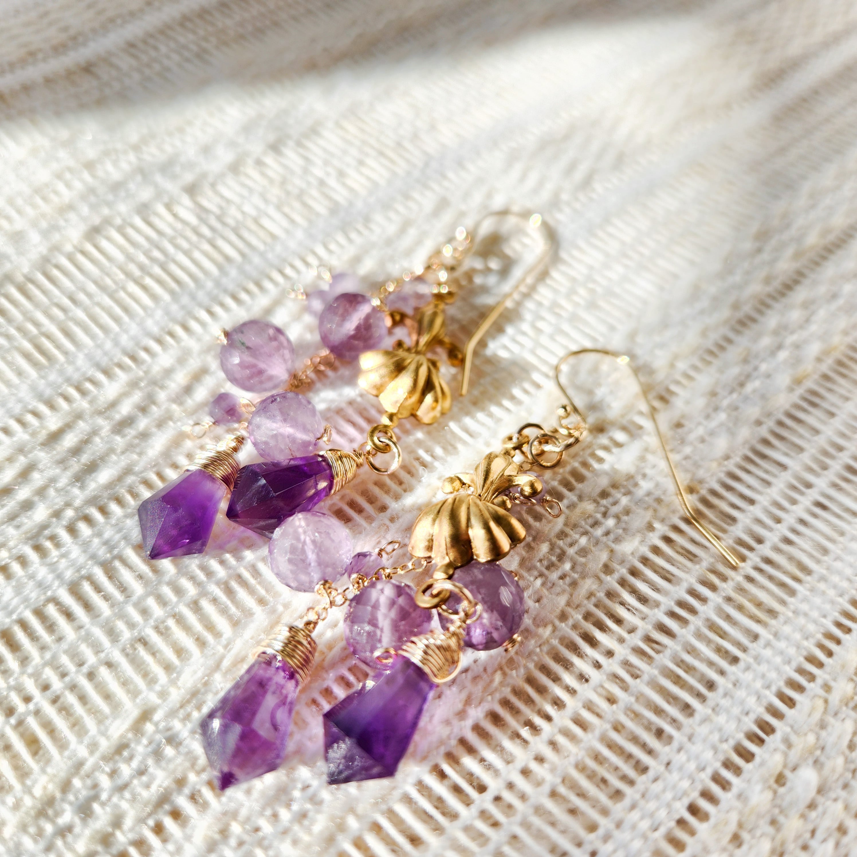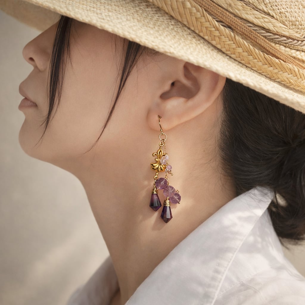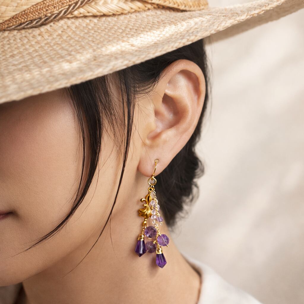 3種類のアメシストビーズと真鍮オーナメントを組み合わせたピアスです。