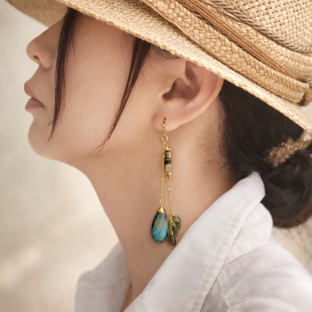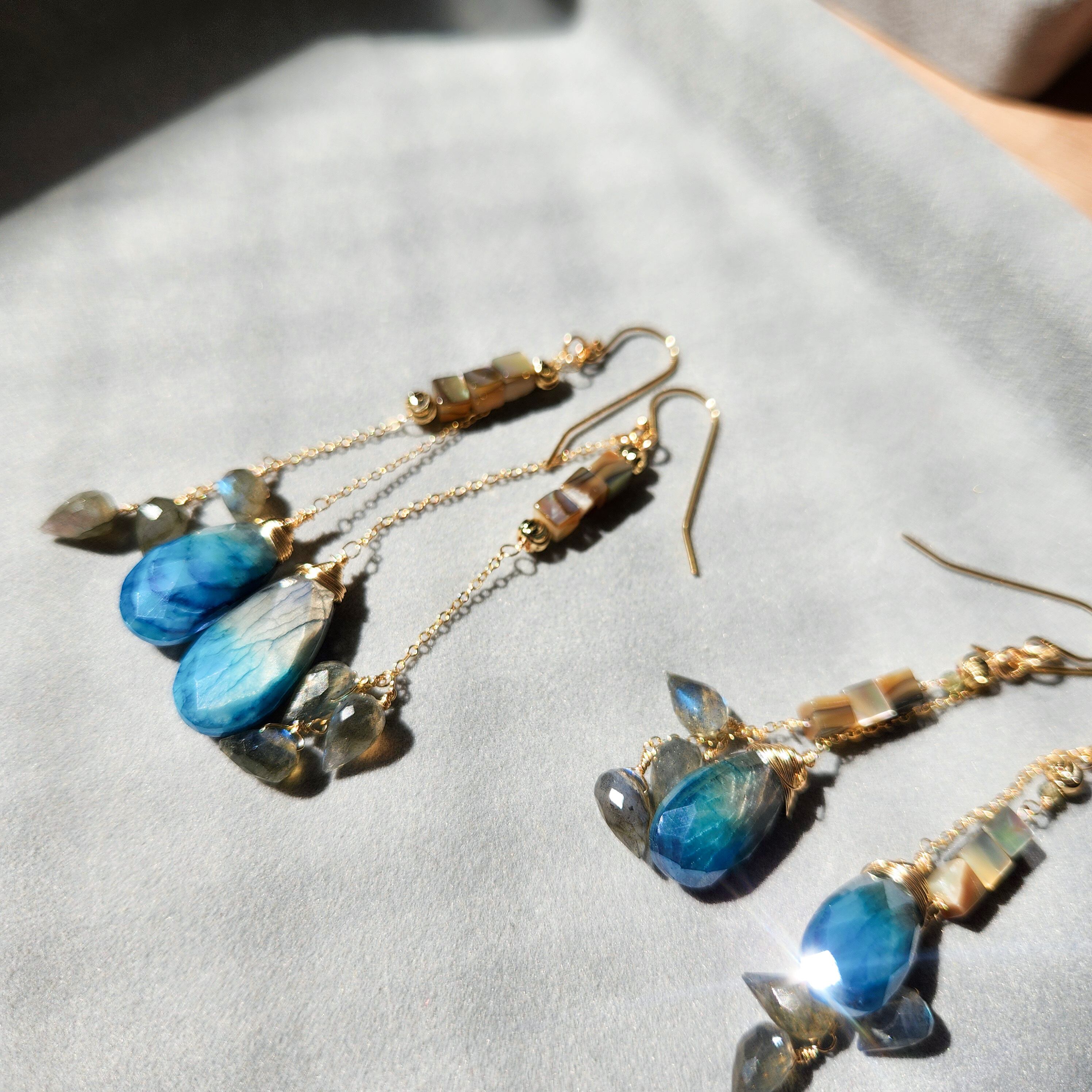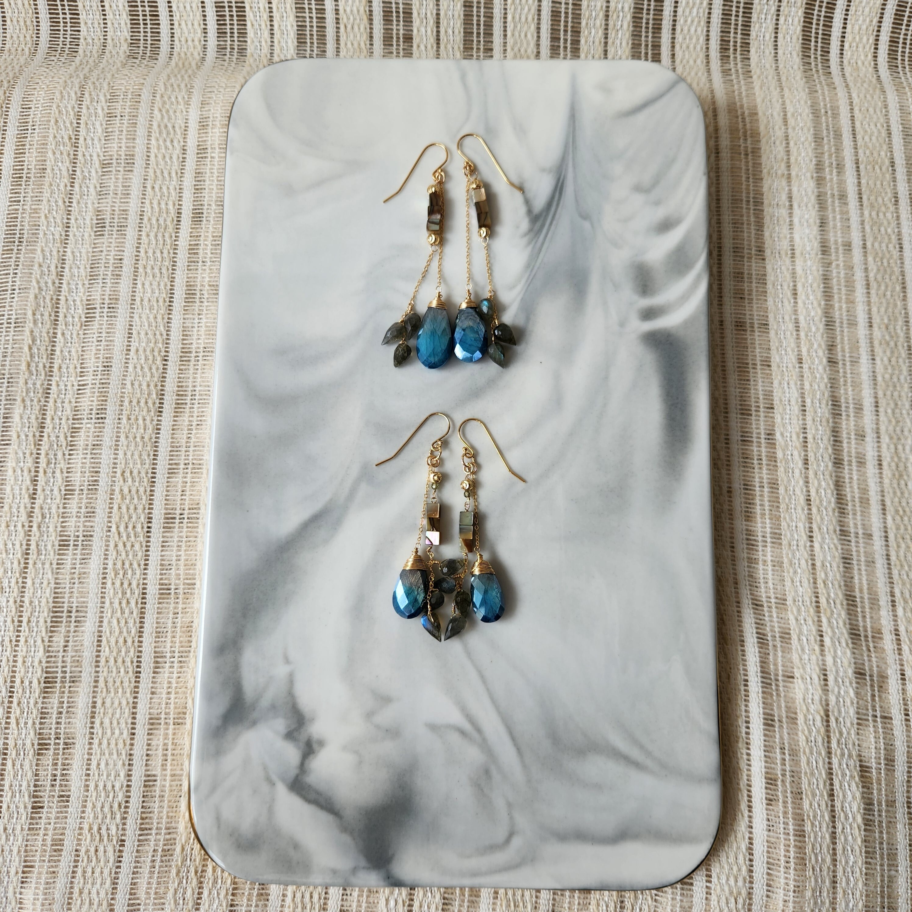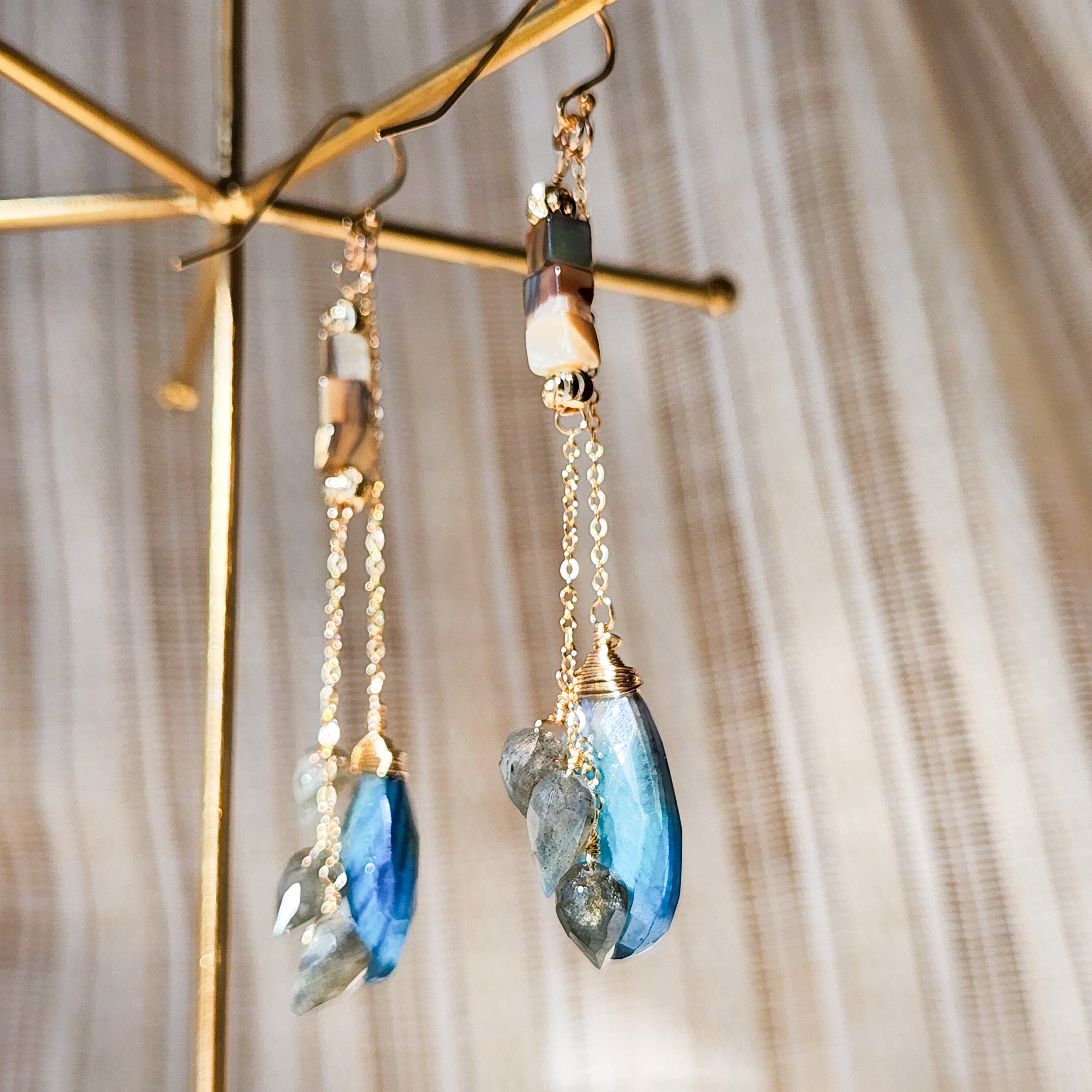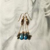 スモーキーなブルーとグレーのバイカラームーンストーンをメインに使用した、落ち着いた大人の印象のピアスです。
