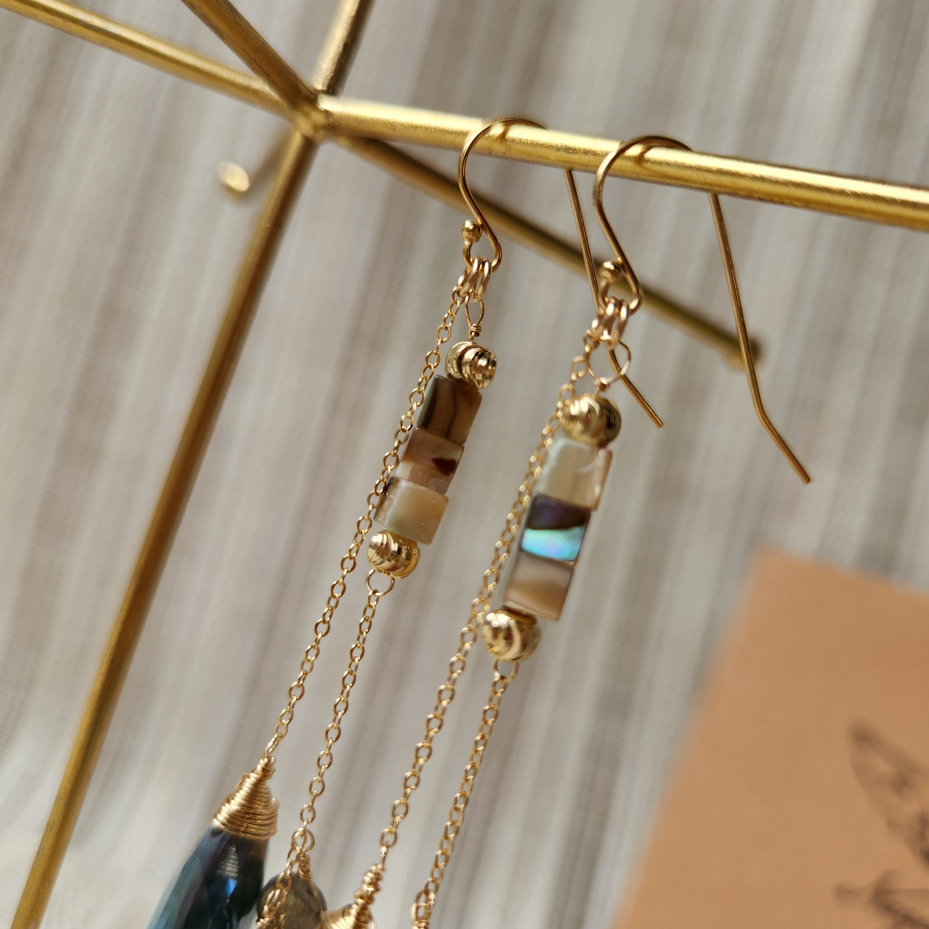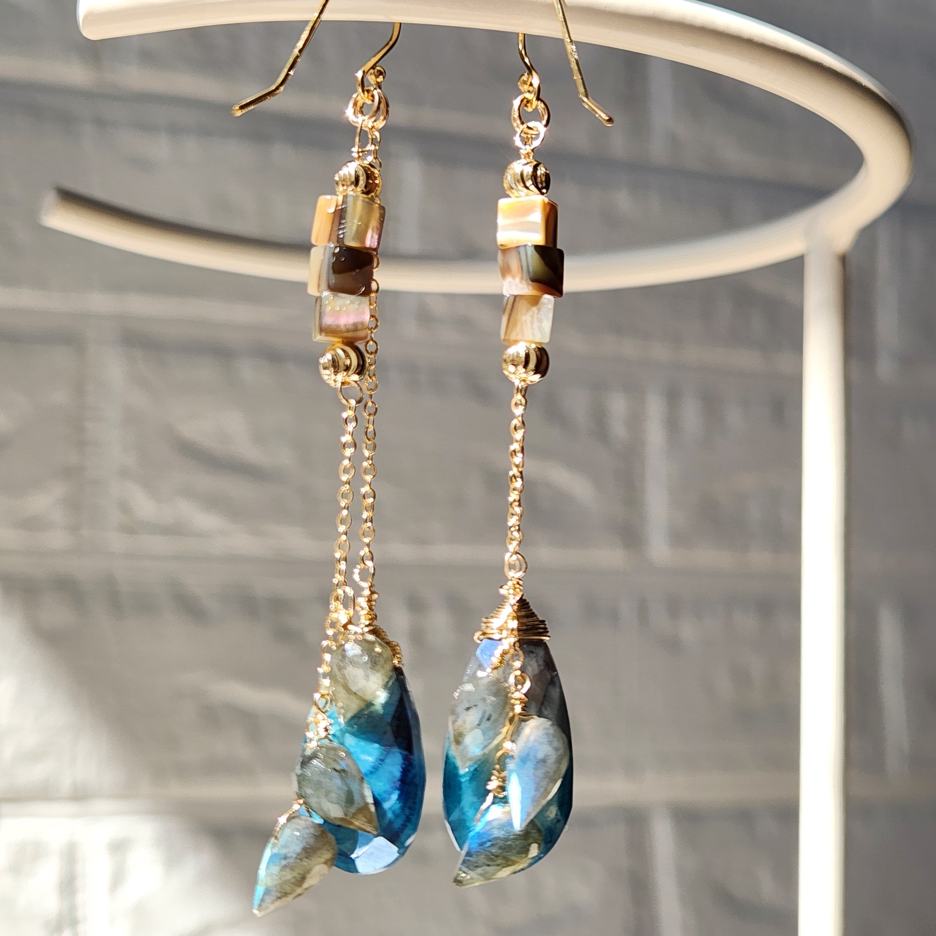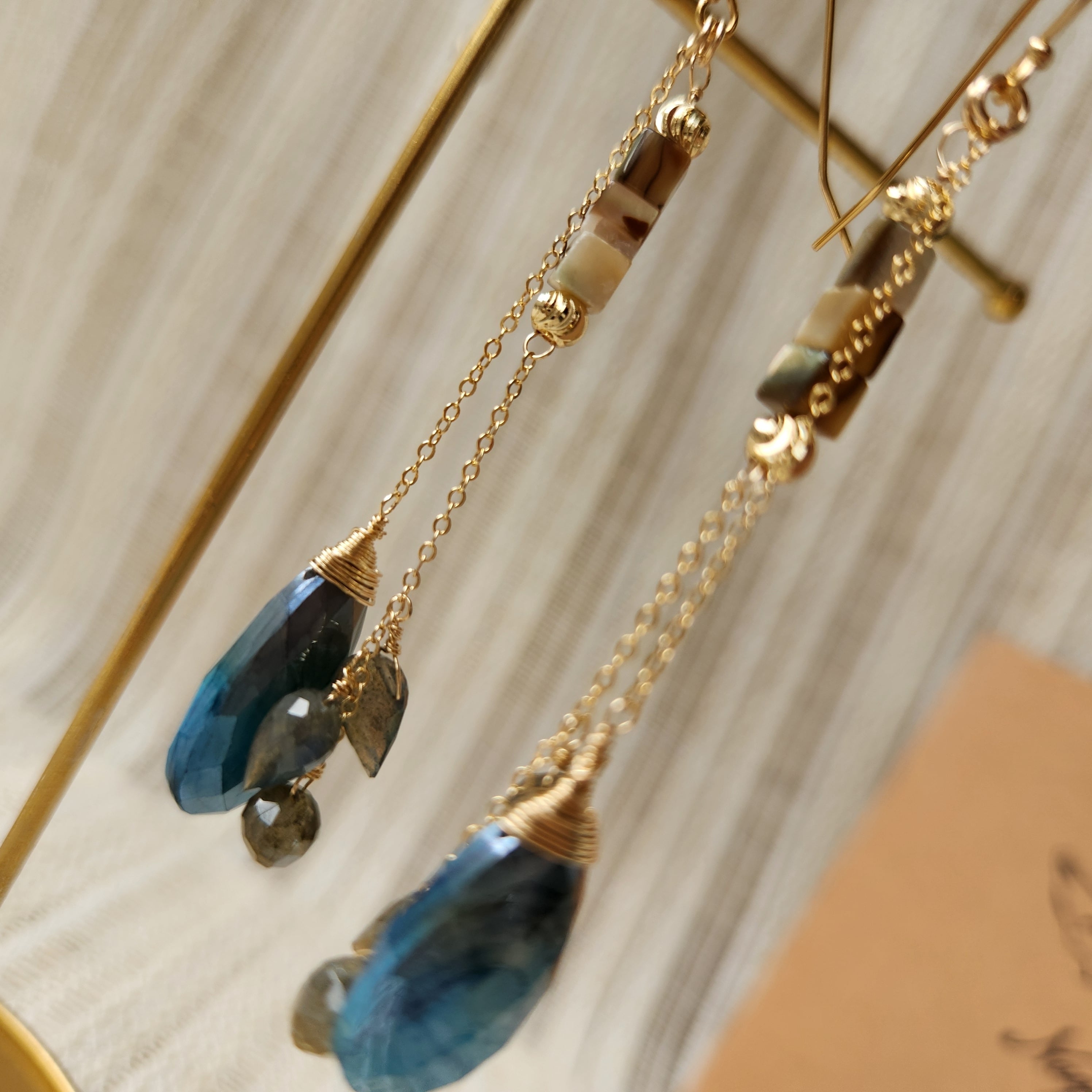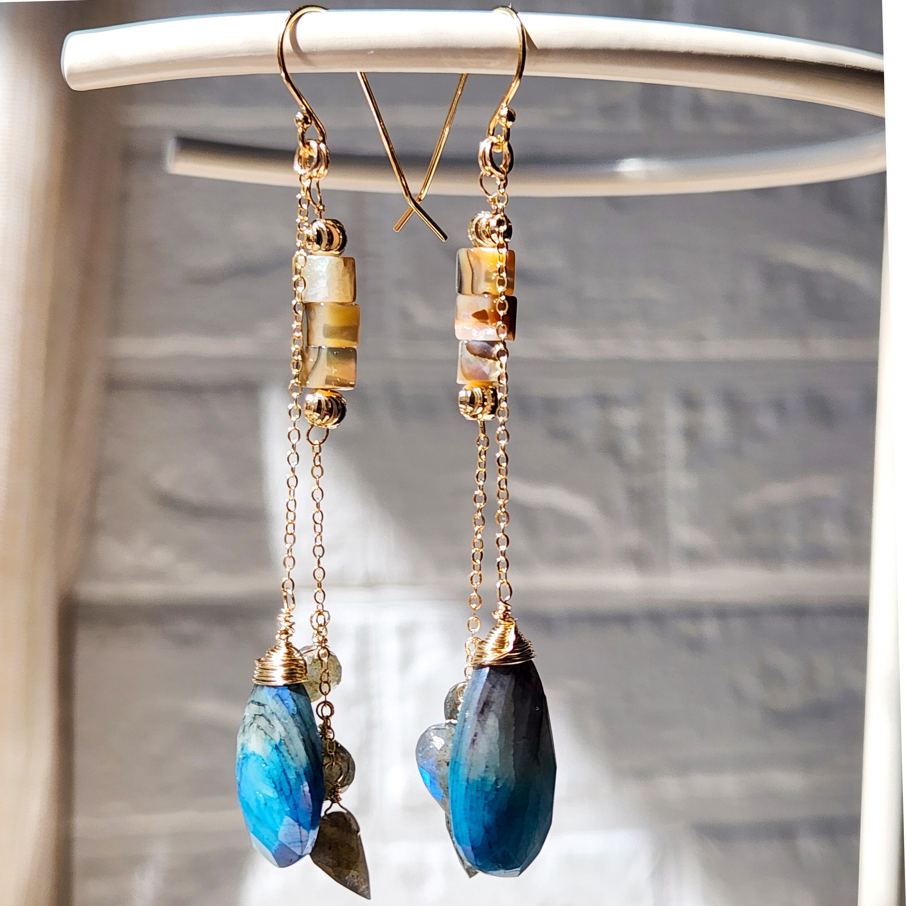 シラーの美しいラブラドライトと虹色に輝くアバロンシェルを合わせ、華やかさをプラスしました。