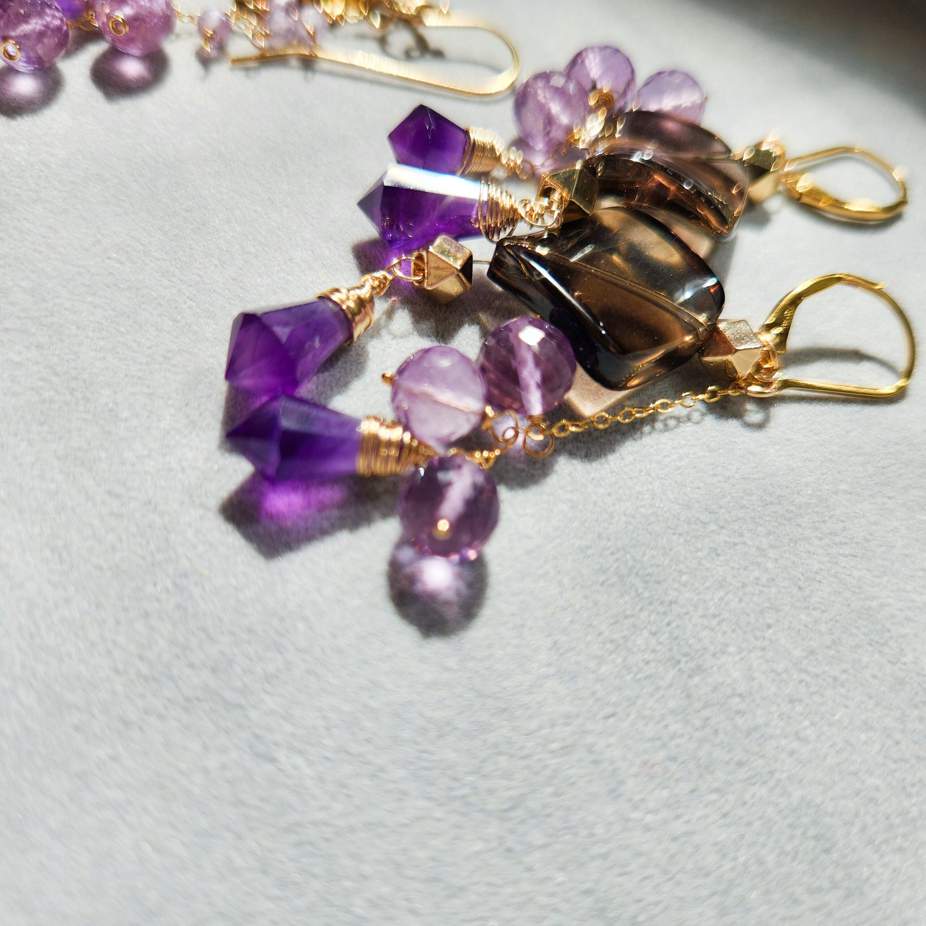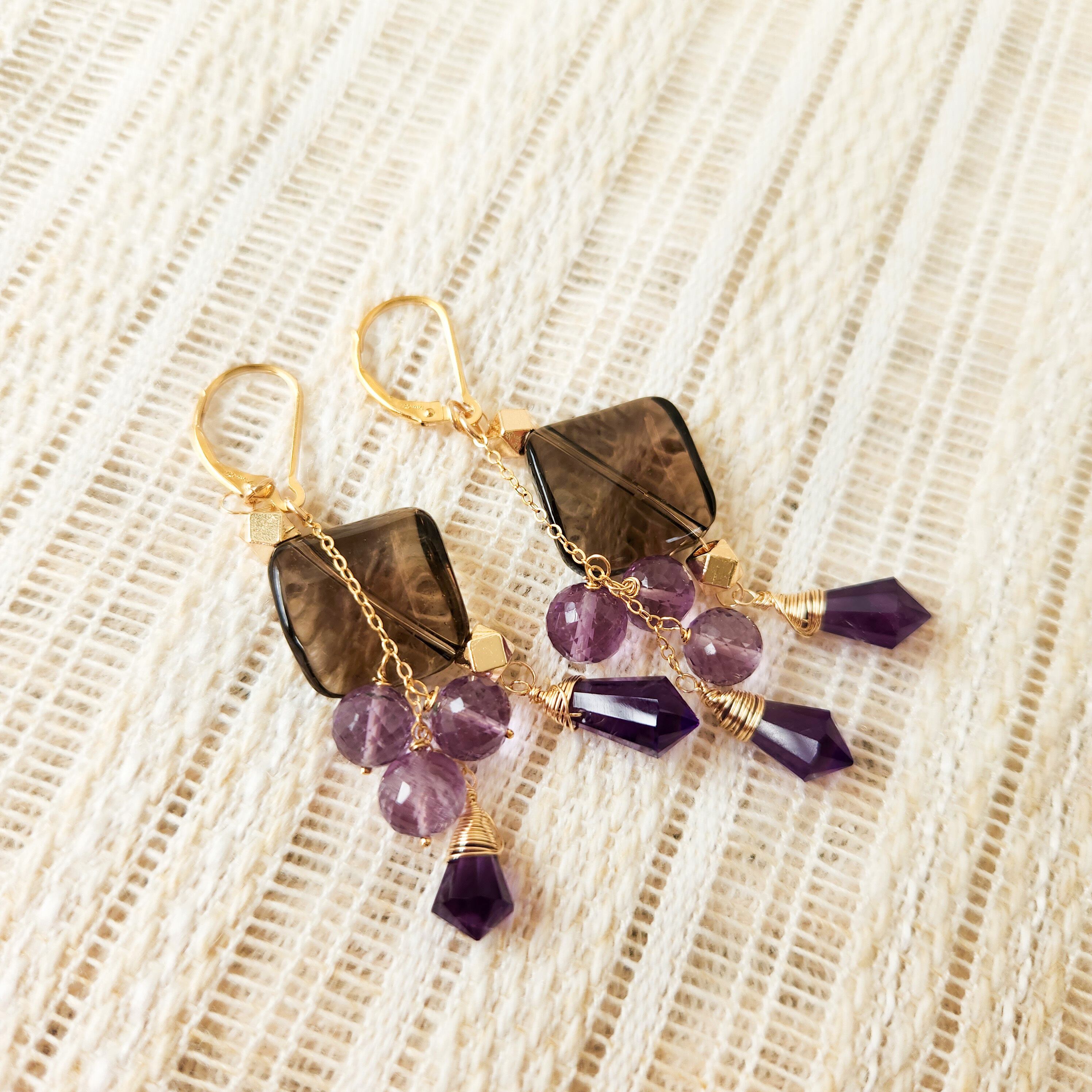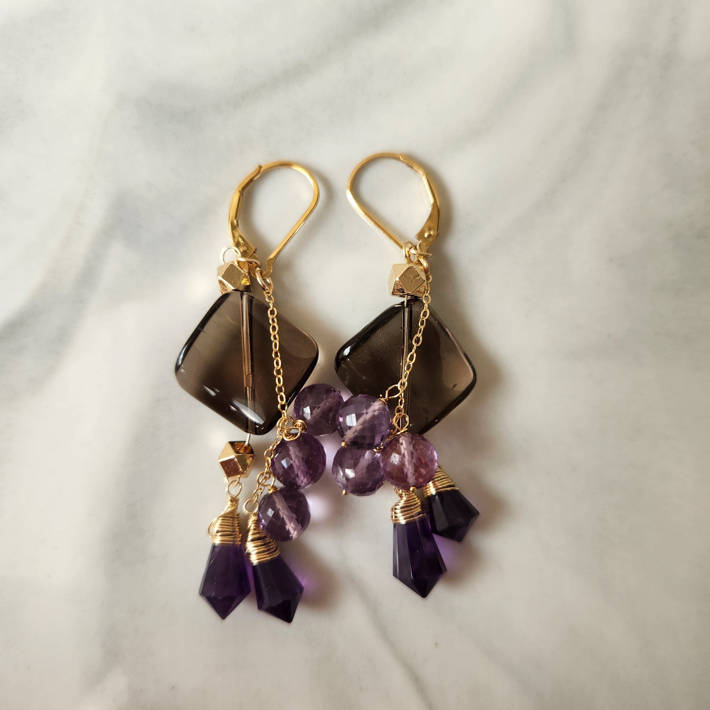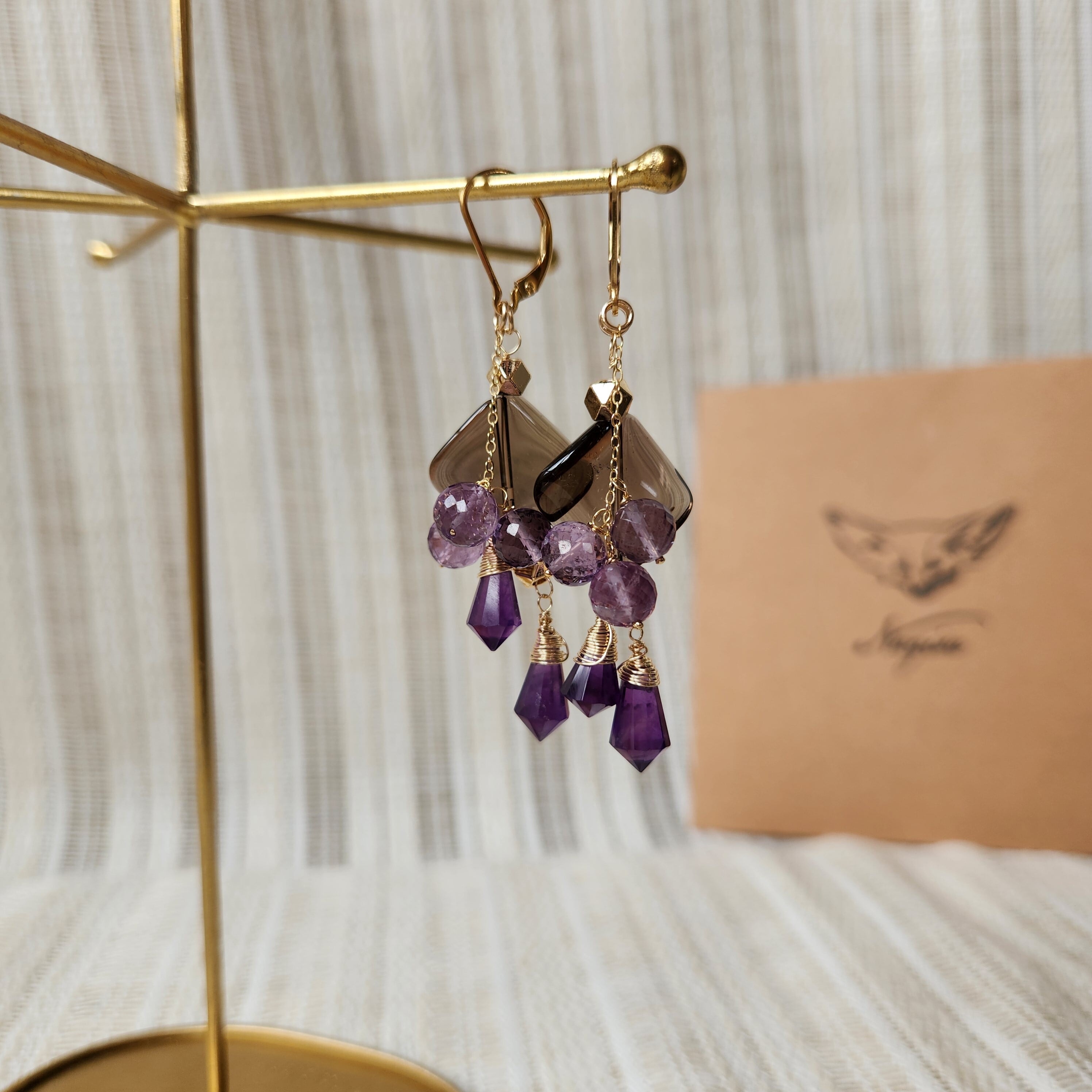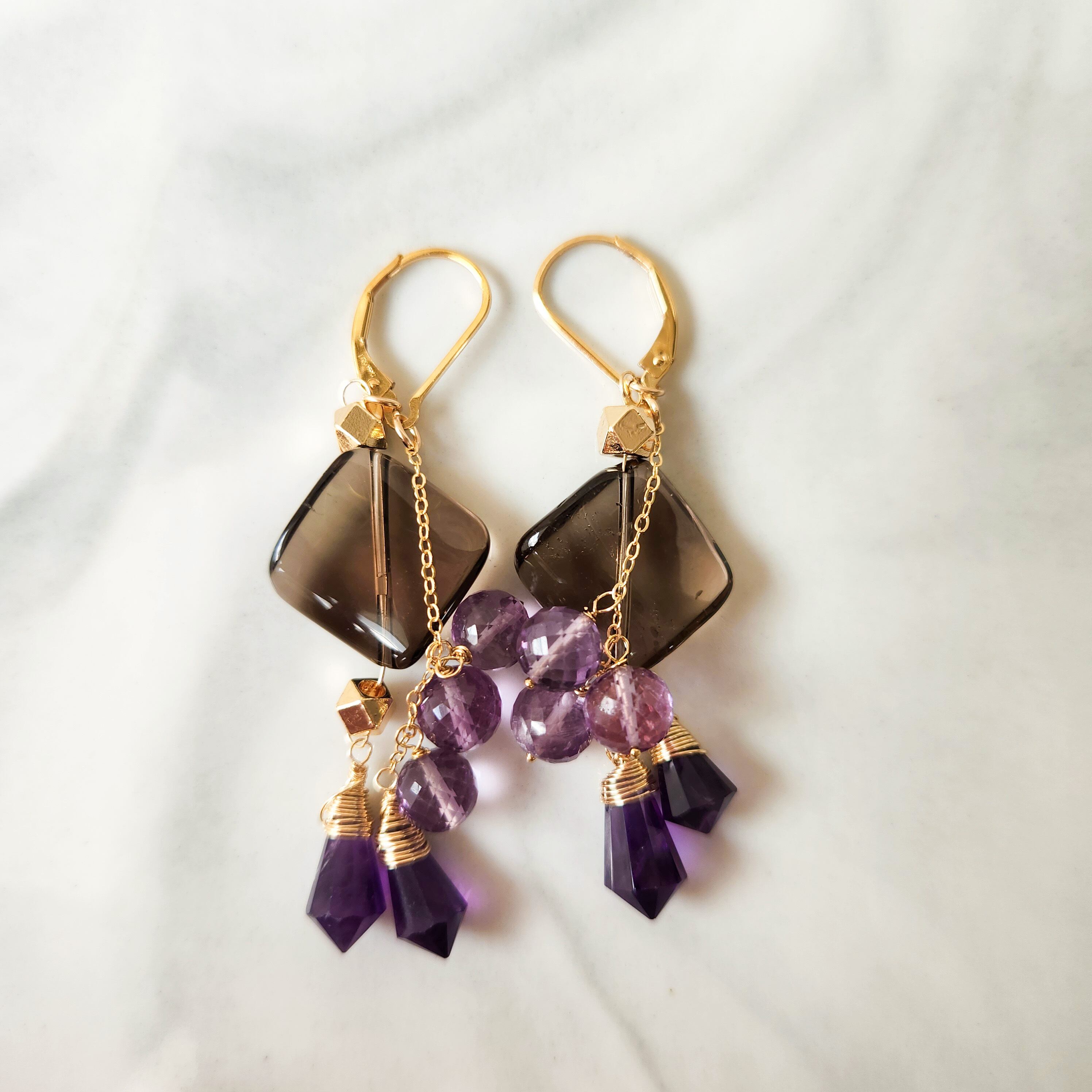 大ぶりサイズのスモーキークォーツに、二種類のアメシストを組み合わせたピアスです。