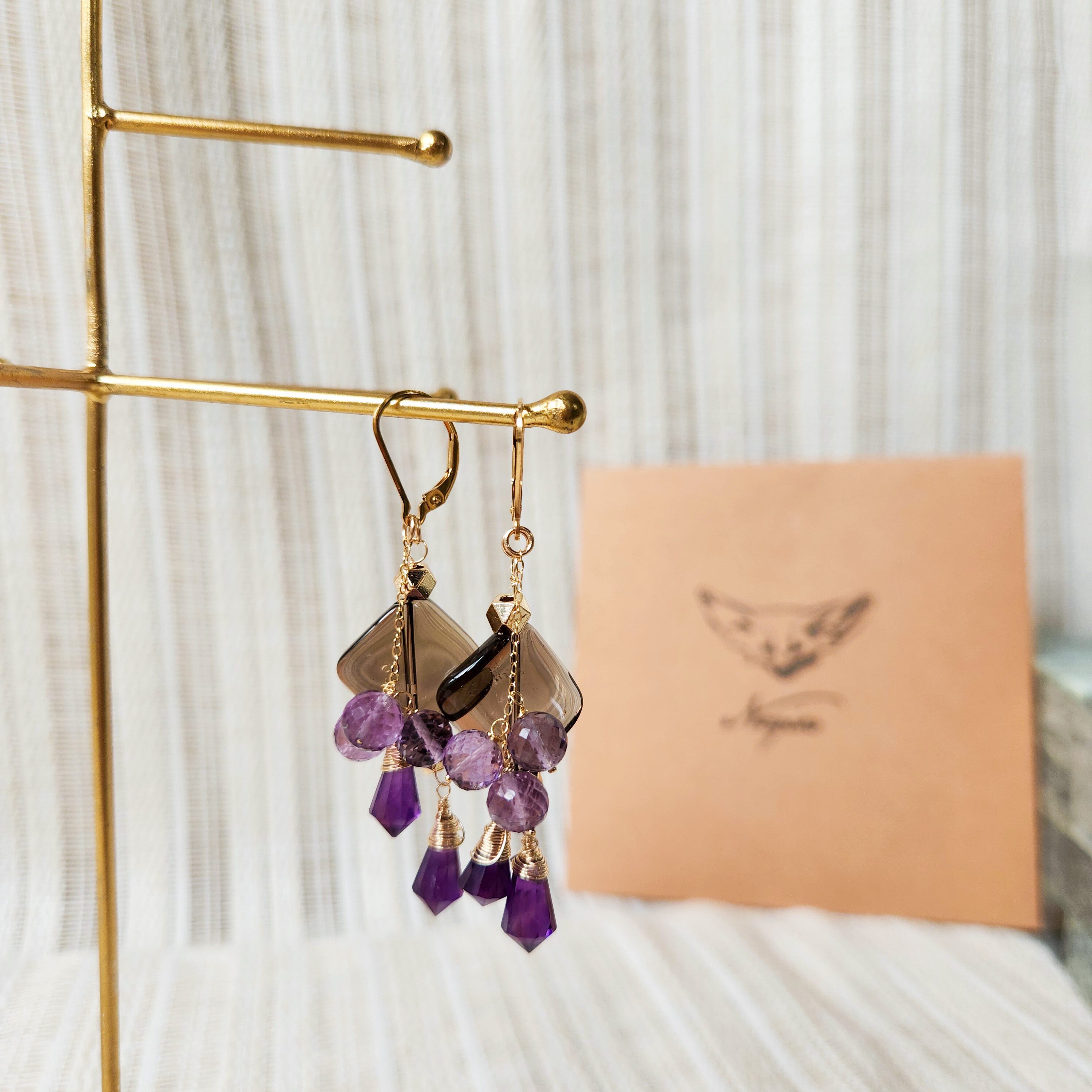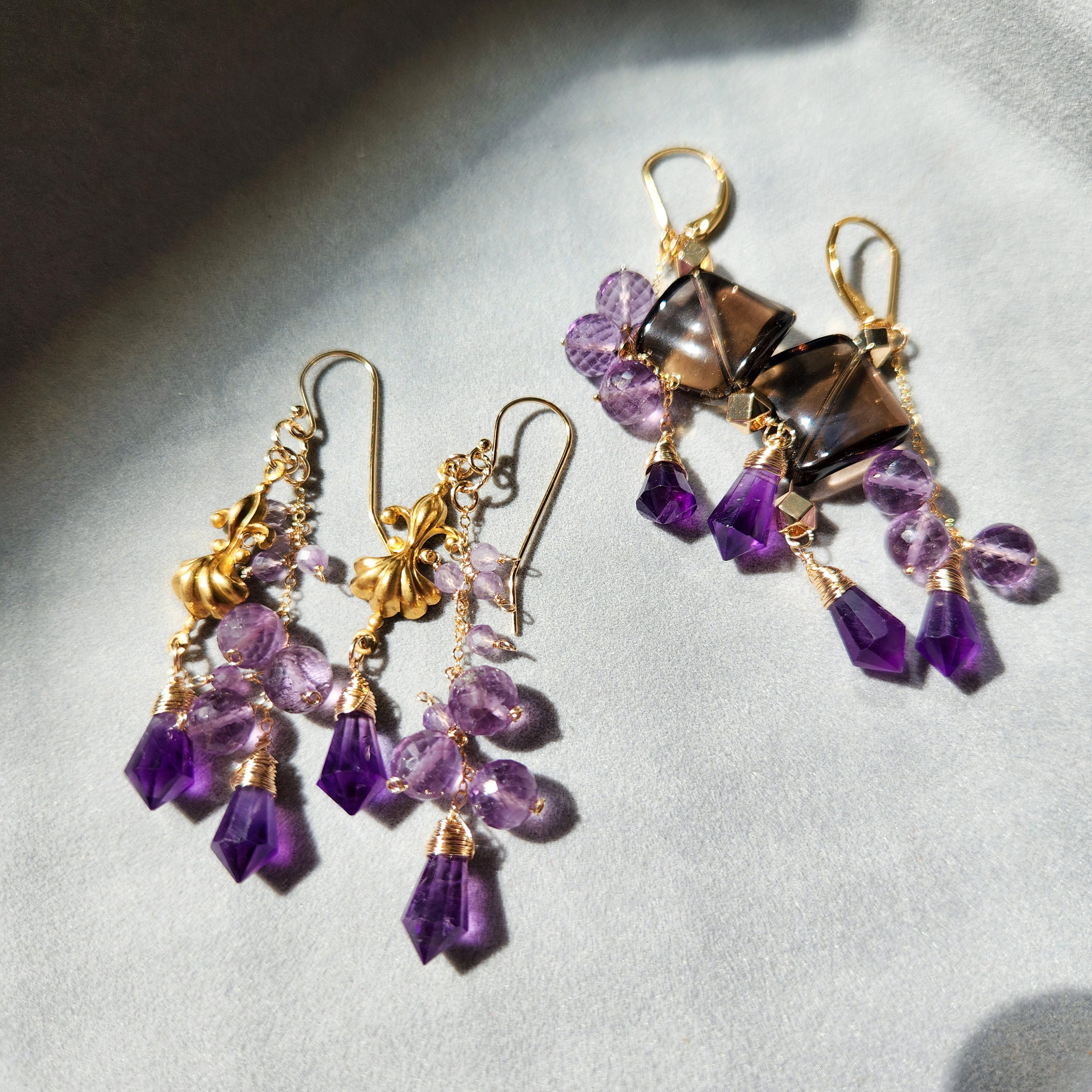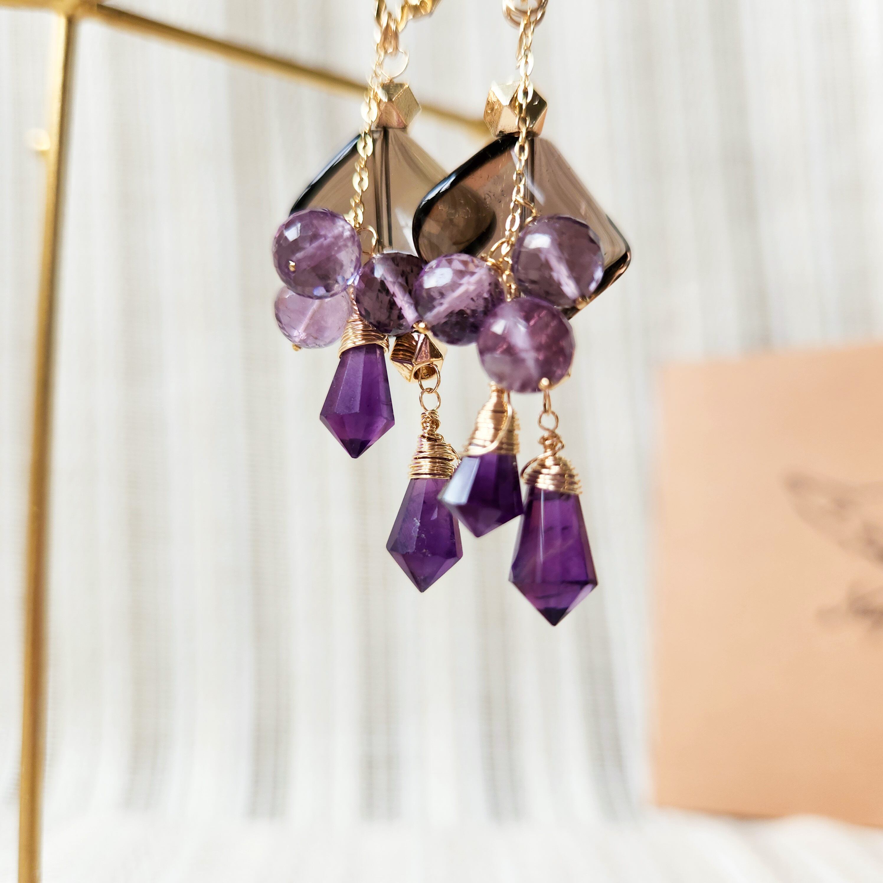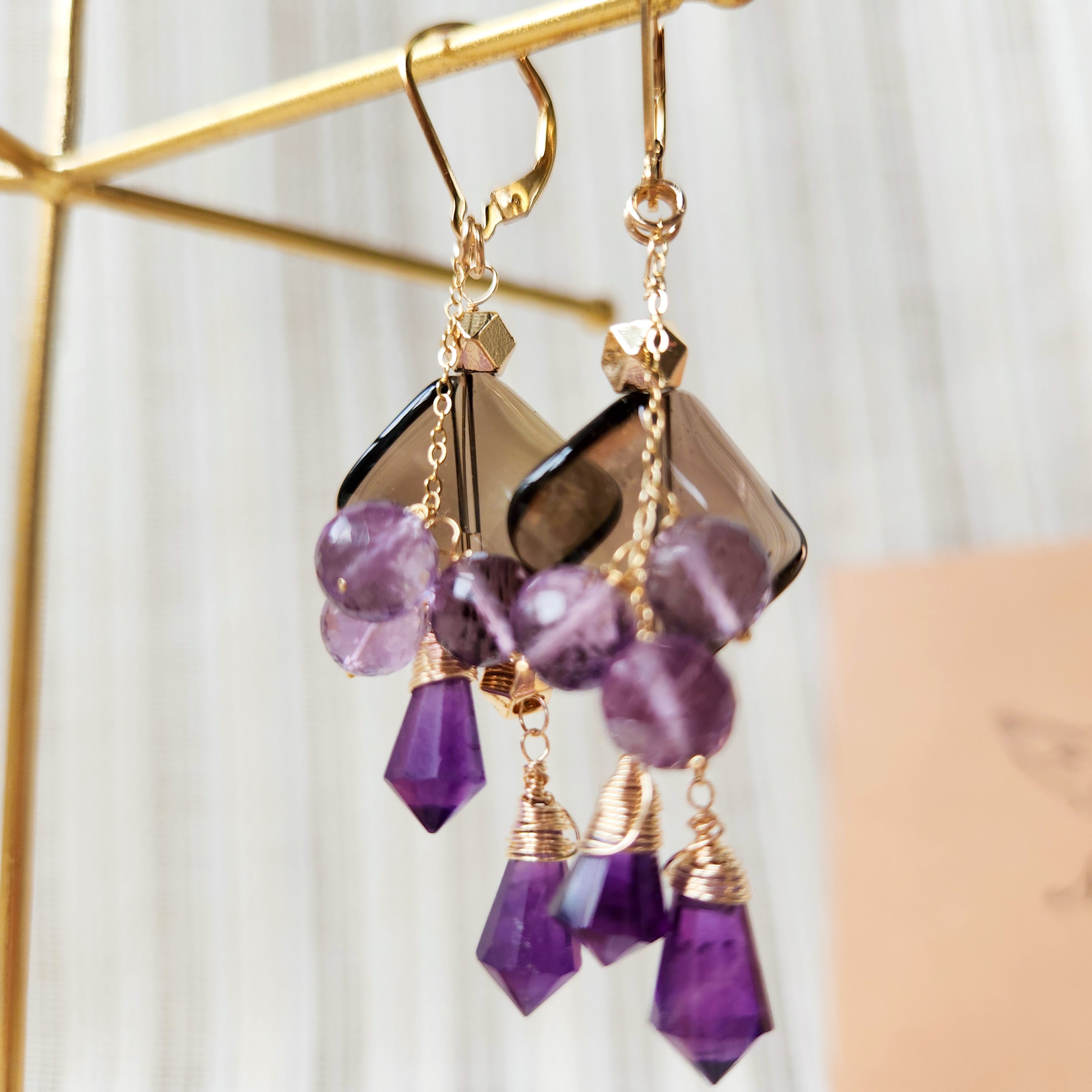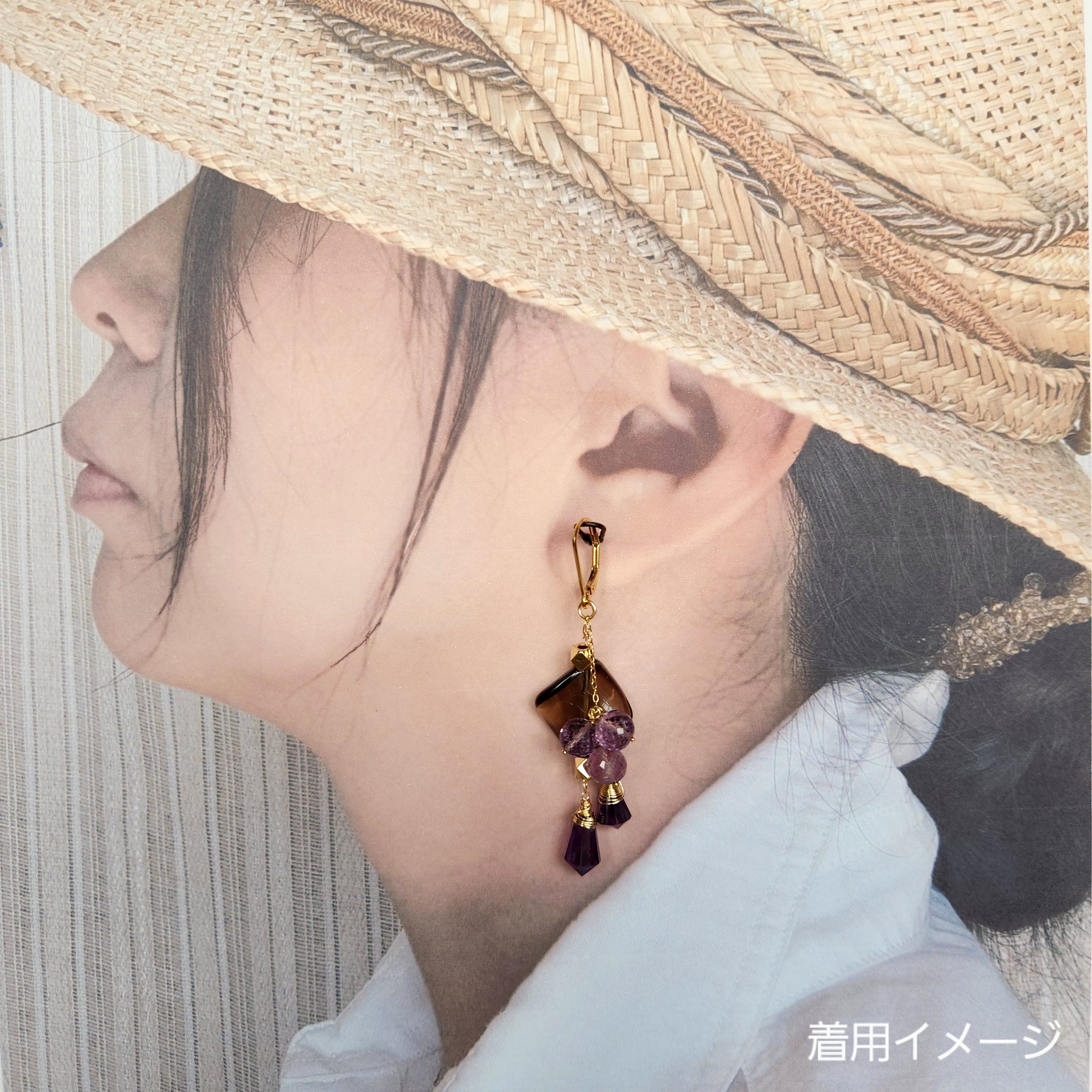 大ぶりサイズのスモーキークォーツに、二種類のアメシストを組み合わせたピアスです。