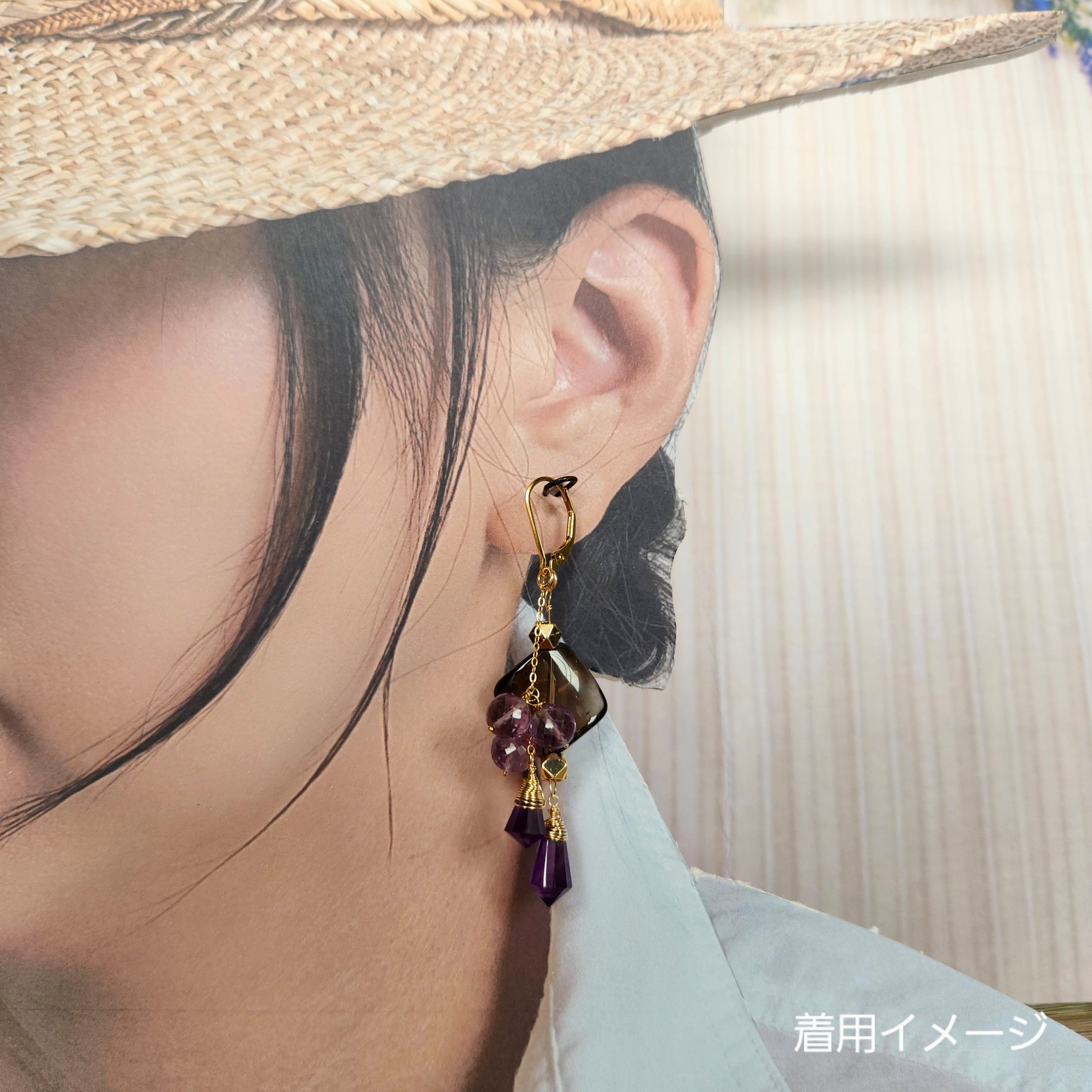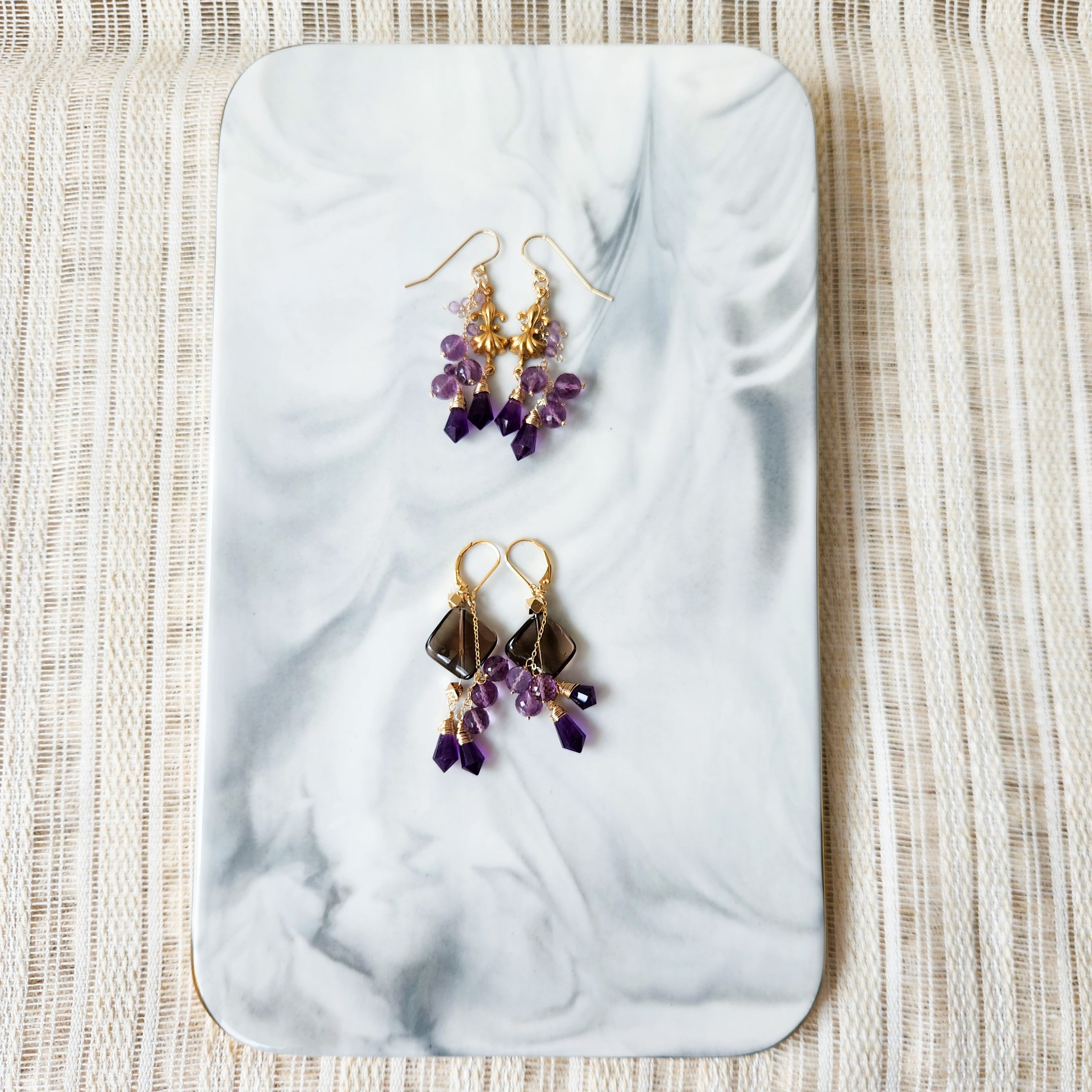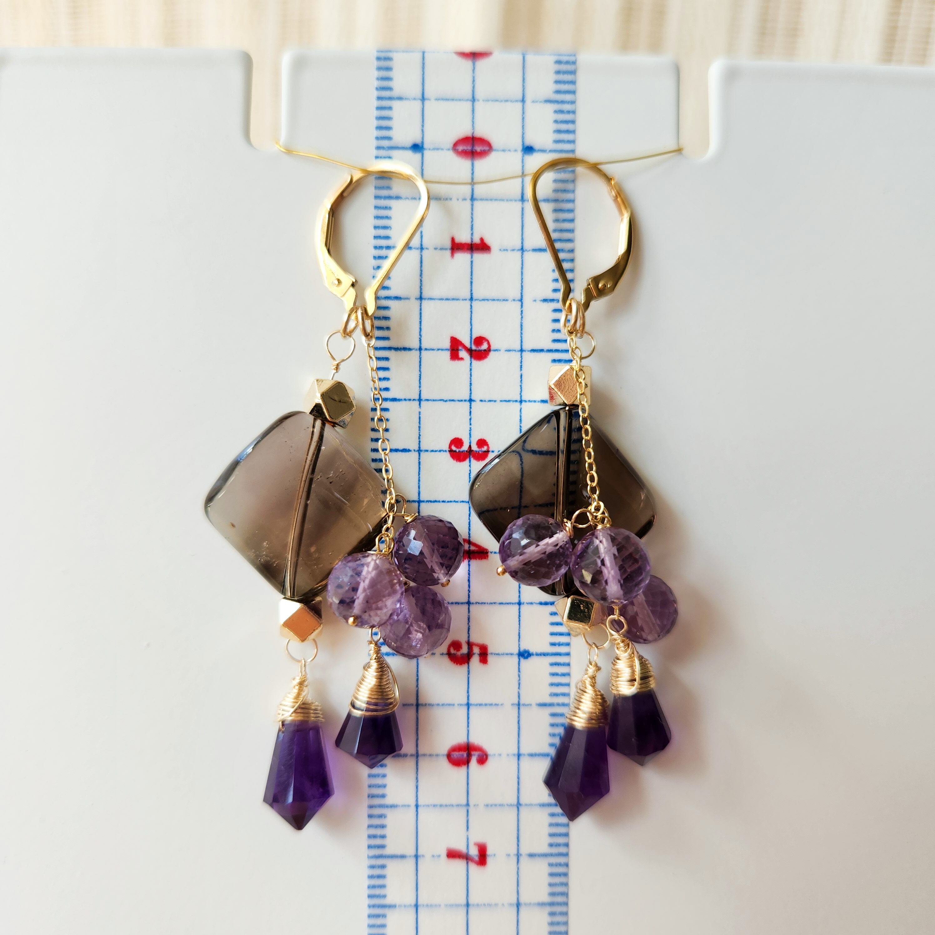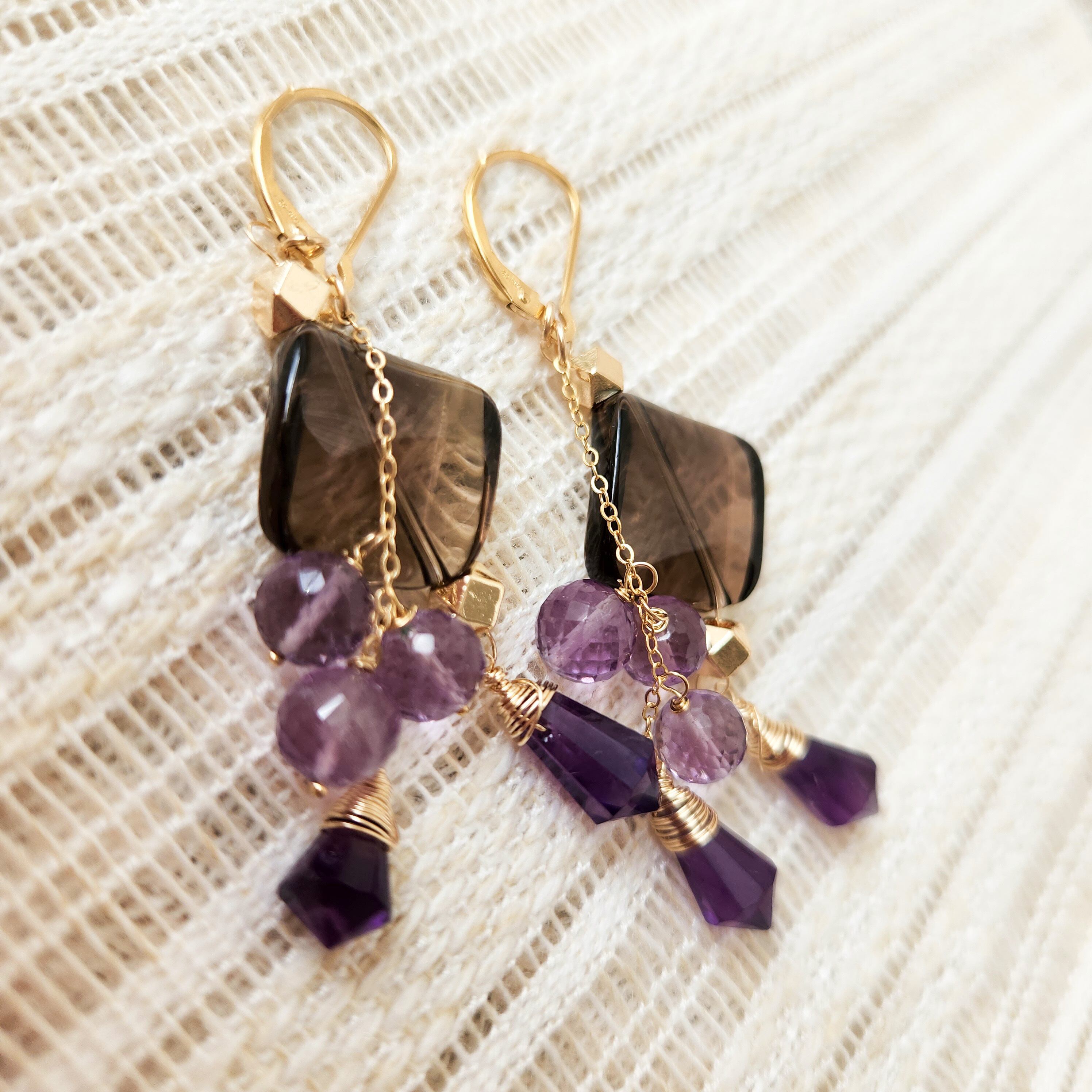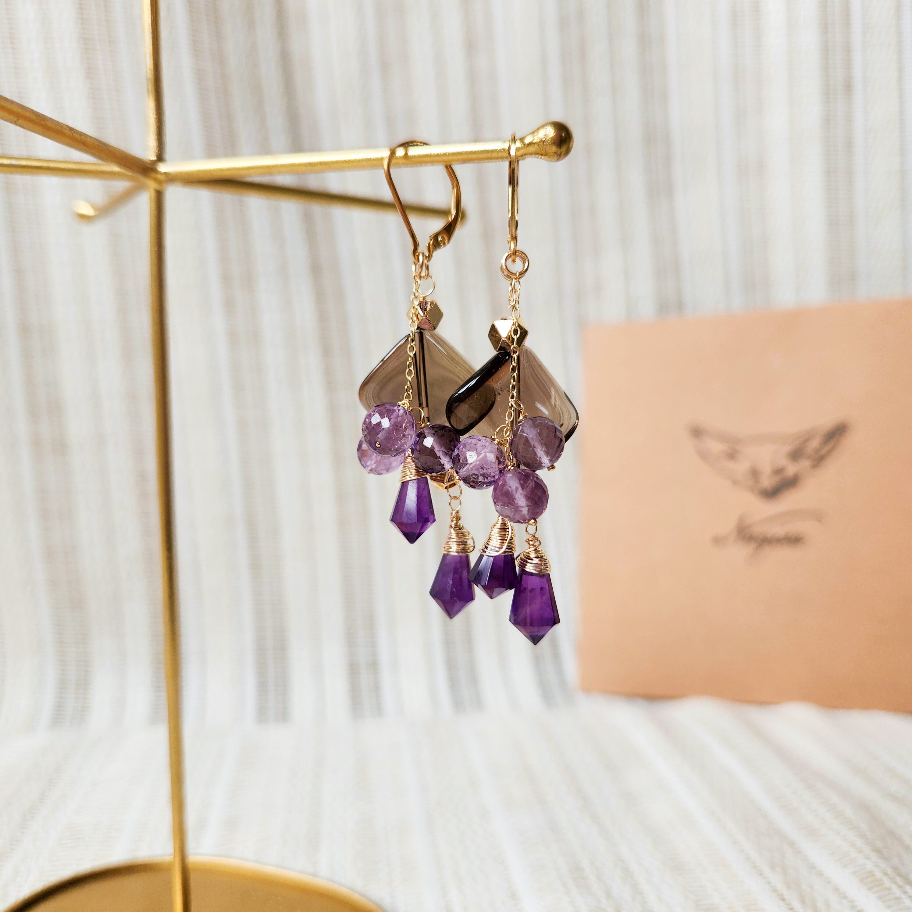 大ぶりサイズのスモーキークォーツに、二種類のアメシストを組み合わせたピアスです。