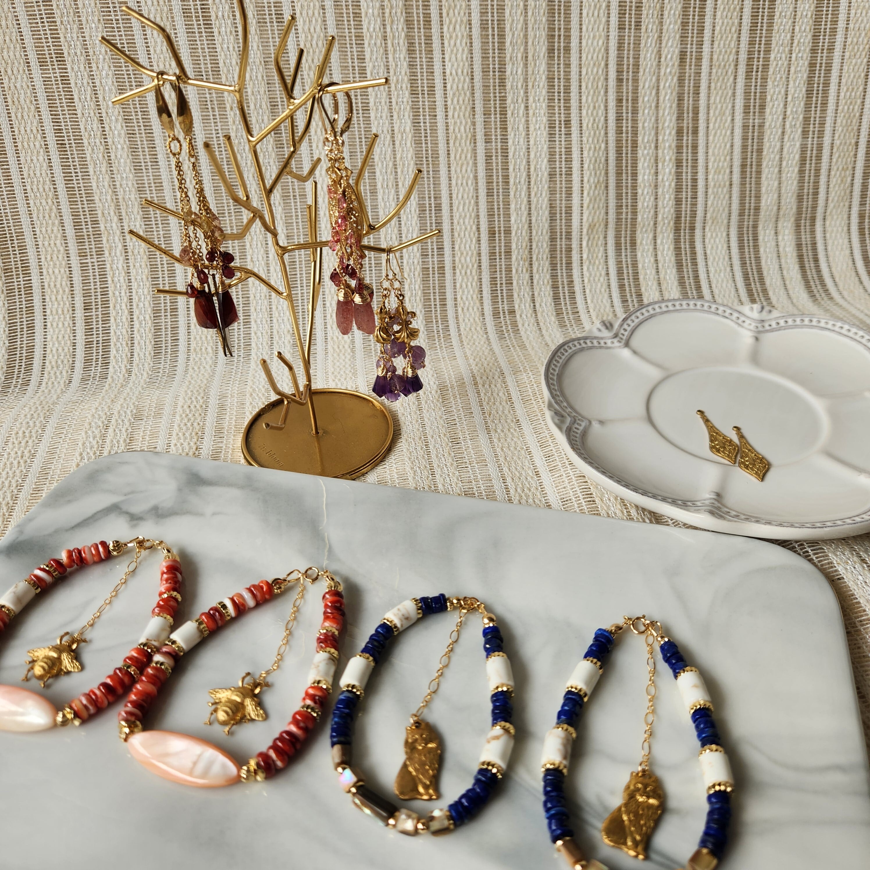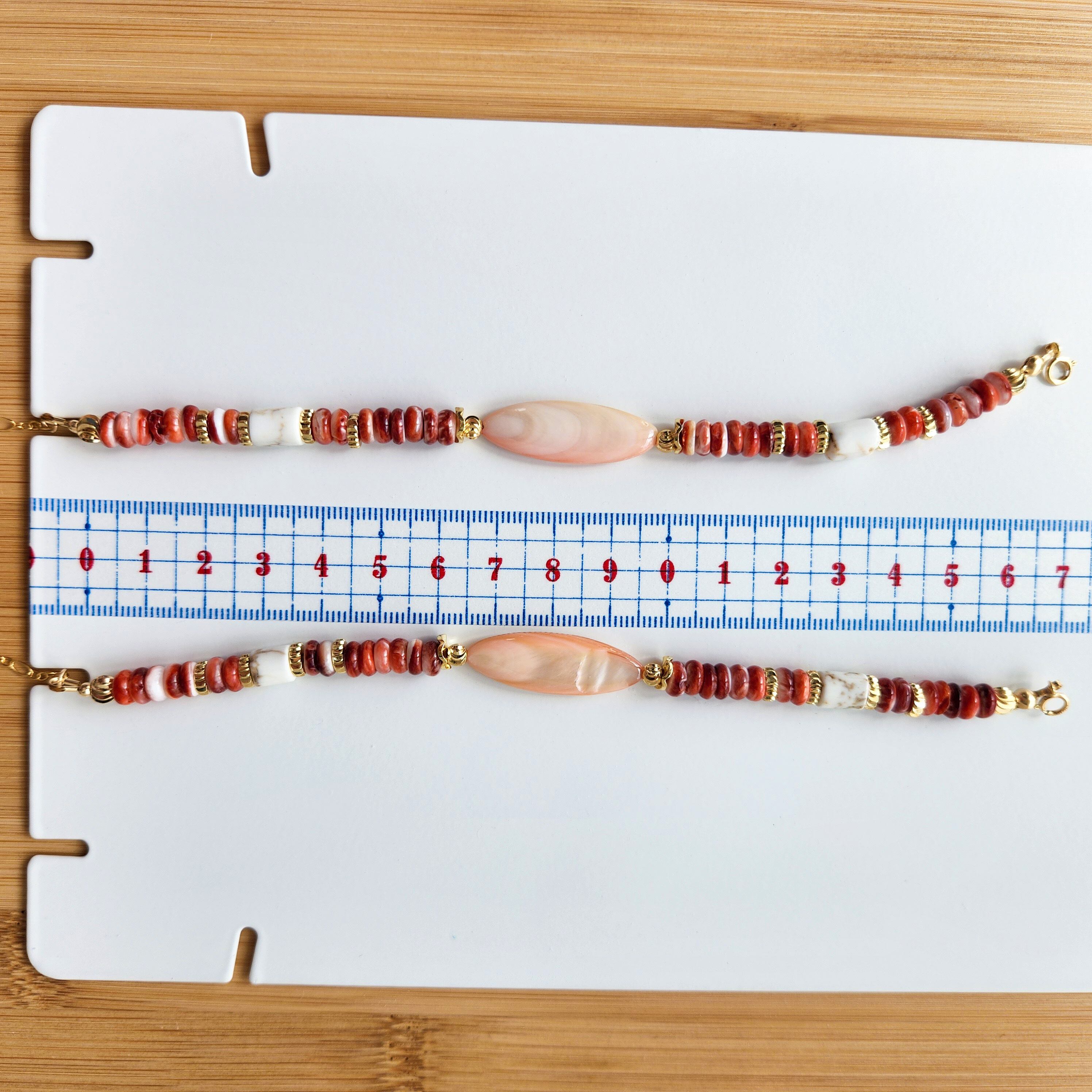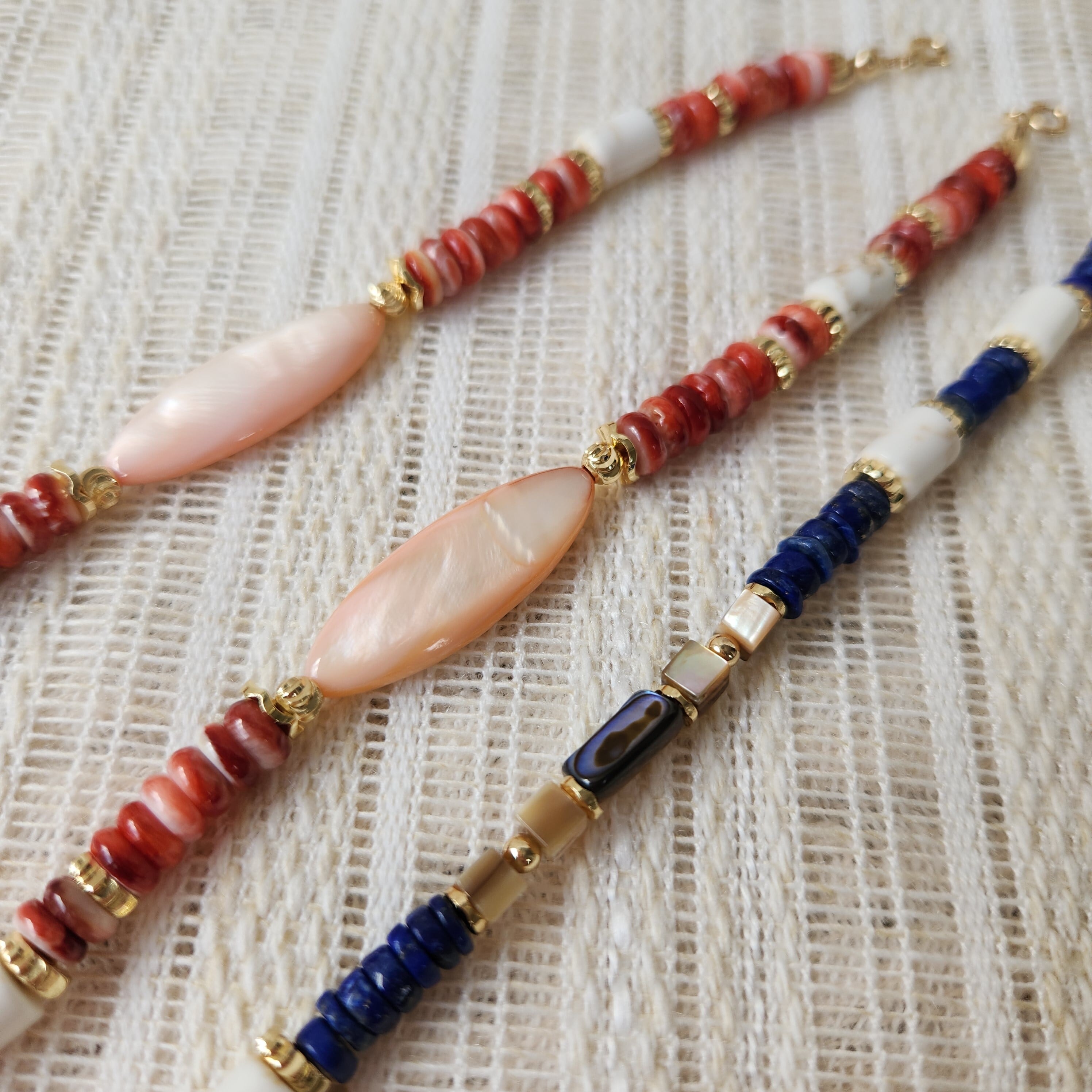 スパイニーオイスターシェルとマグネサイトとゴールドのロンデルの組み合わせが、エキゾチックな印象です。