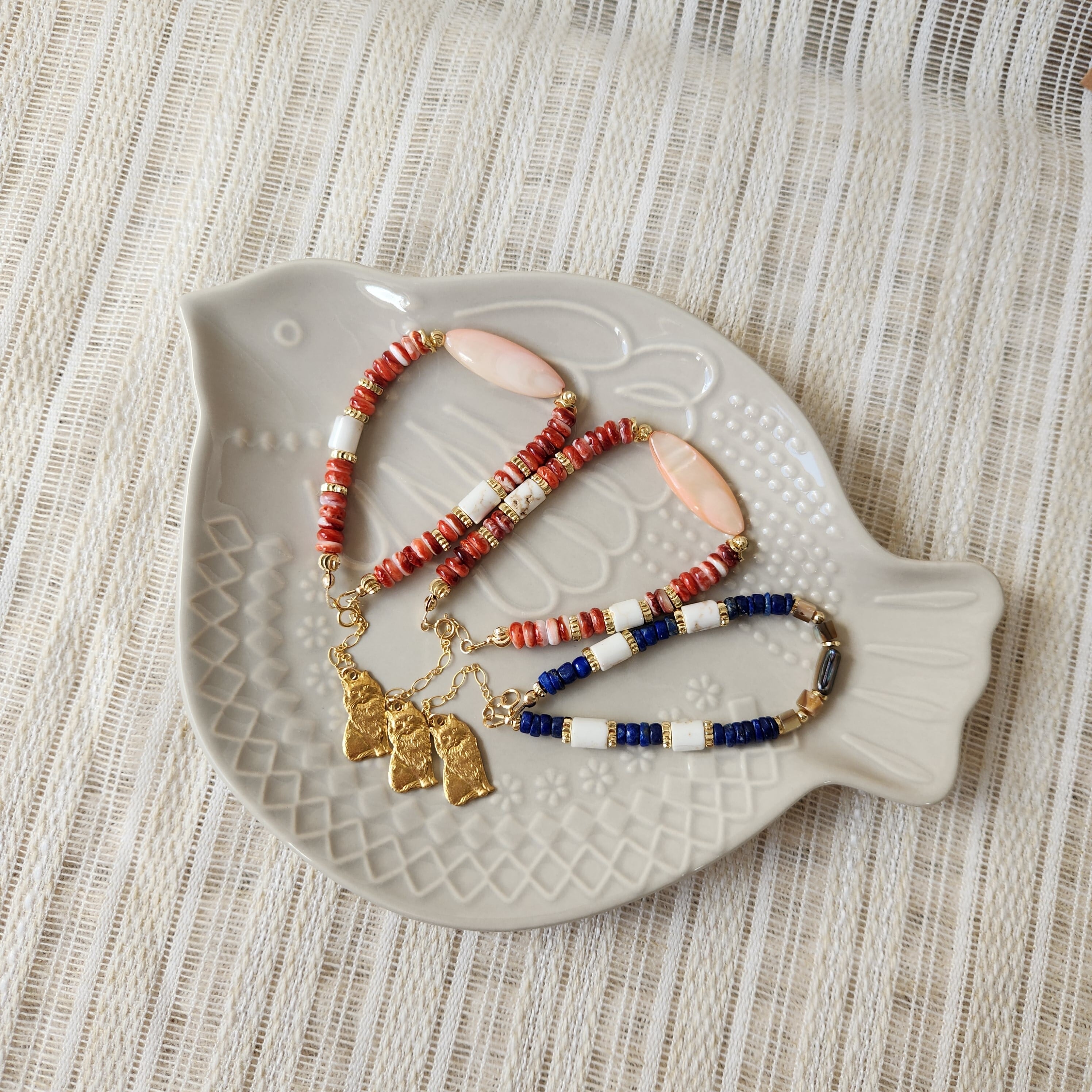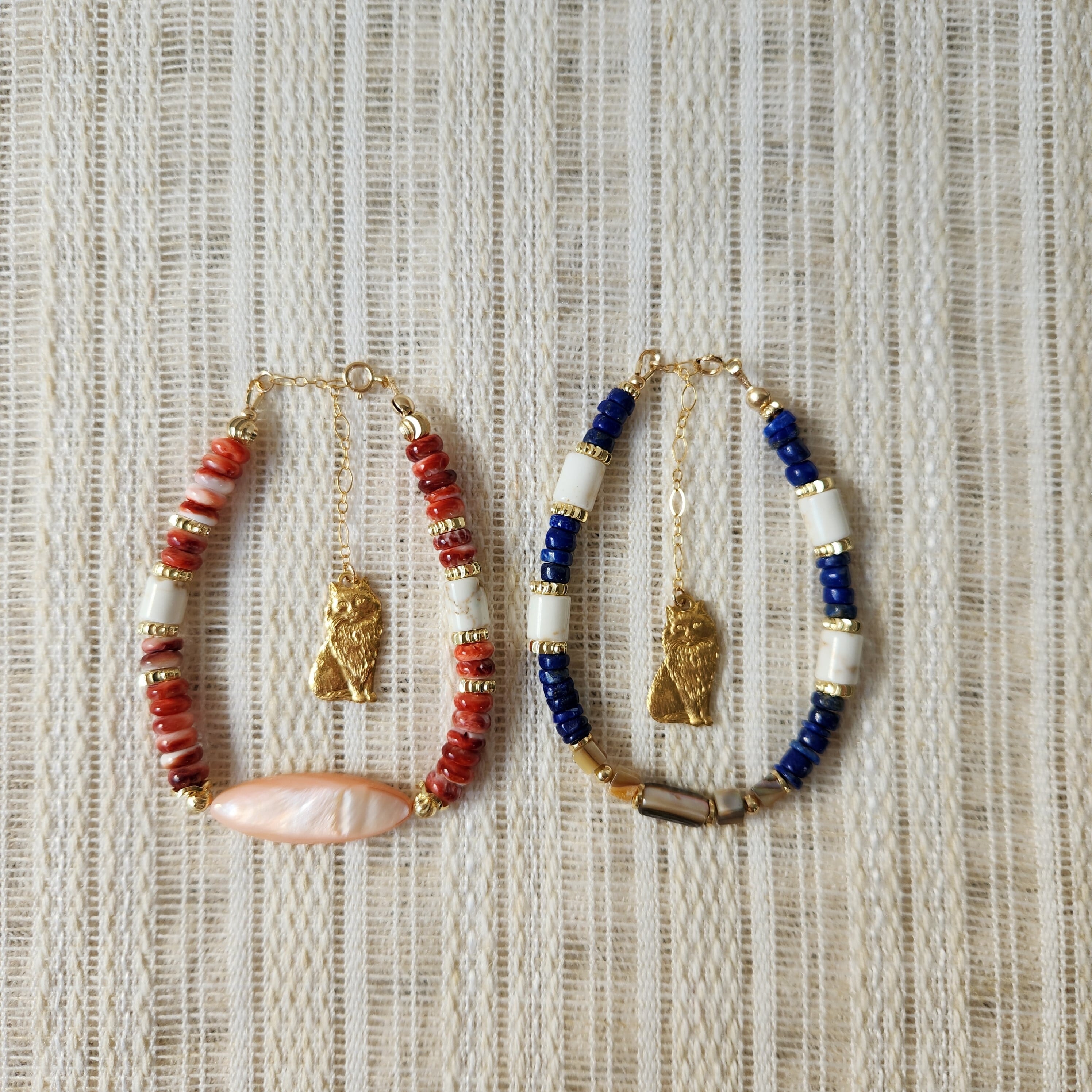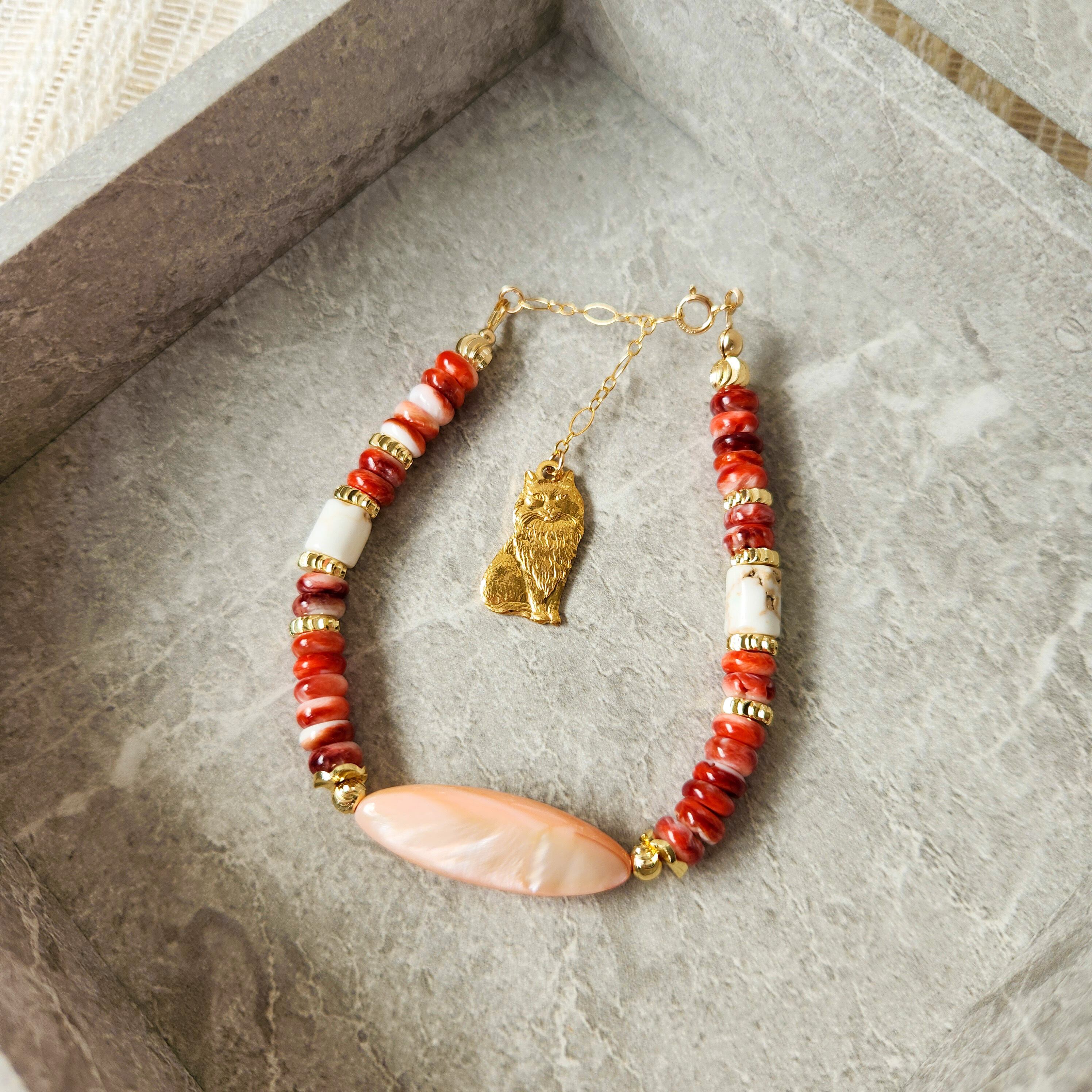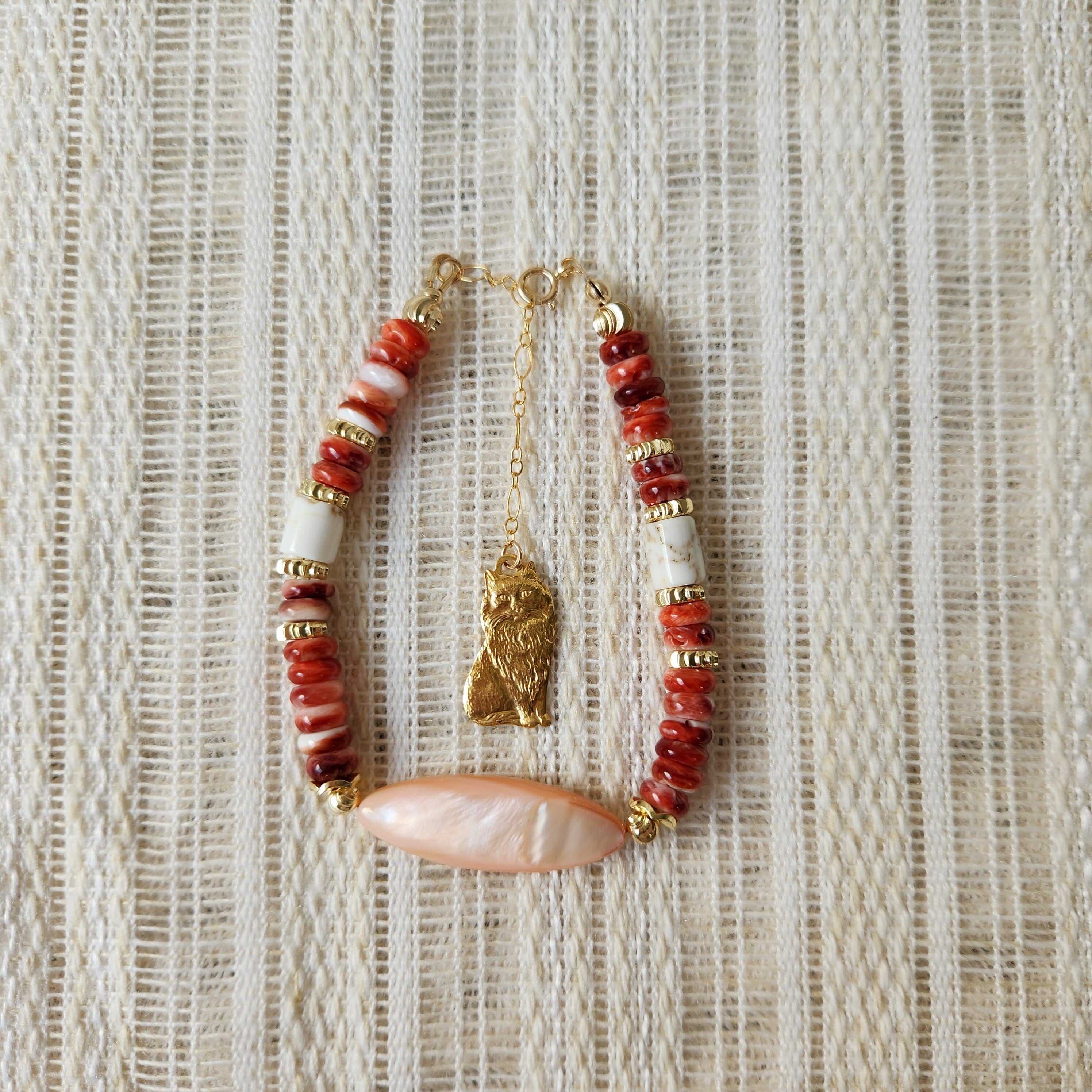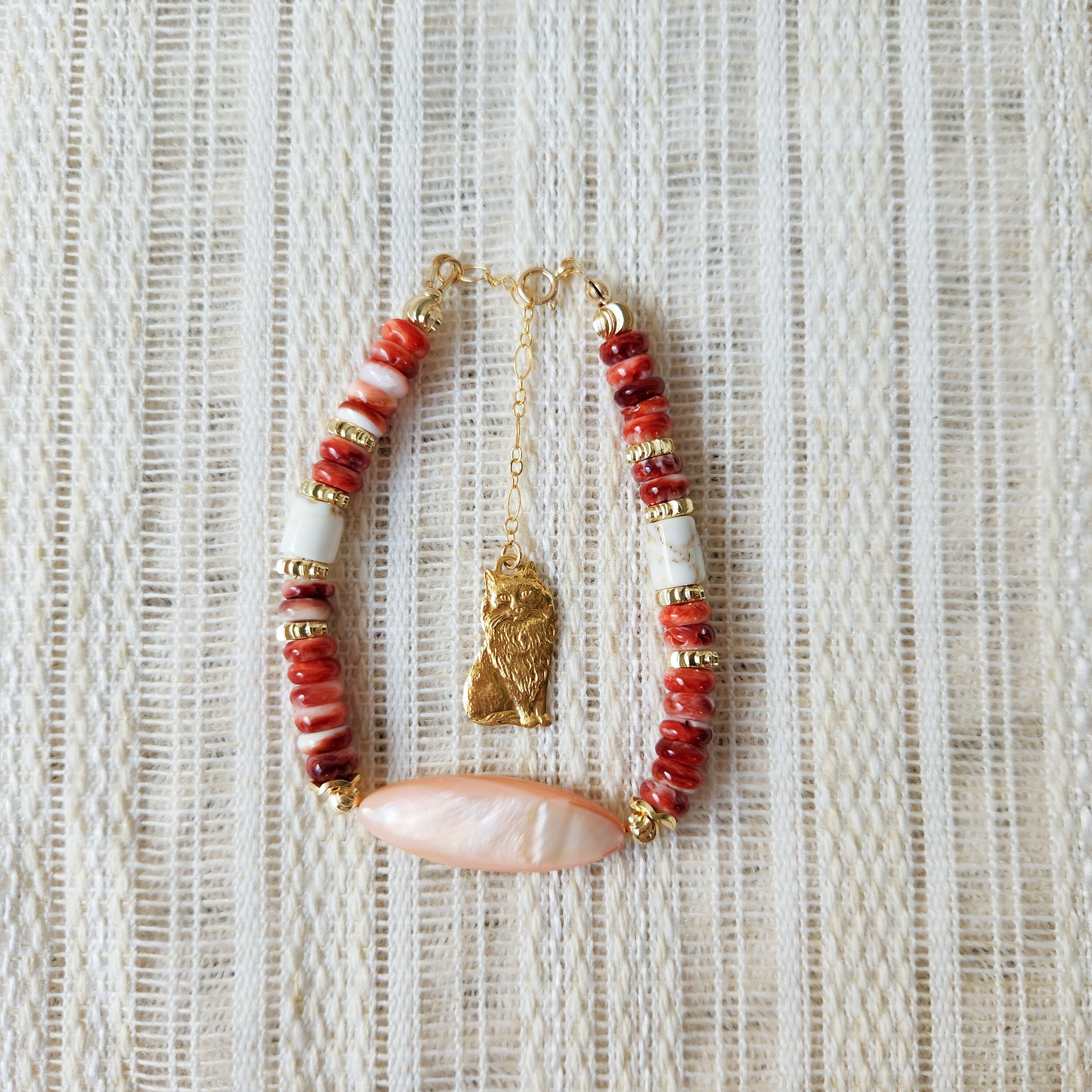 スパイニーオイスターシェル×マザーオブパール×マグネサイト×真鍮パーツねこ ブレスレット 25021B