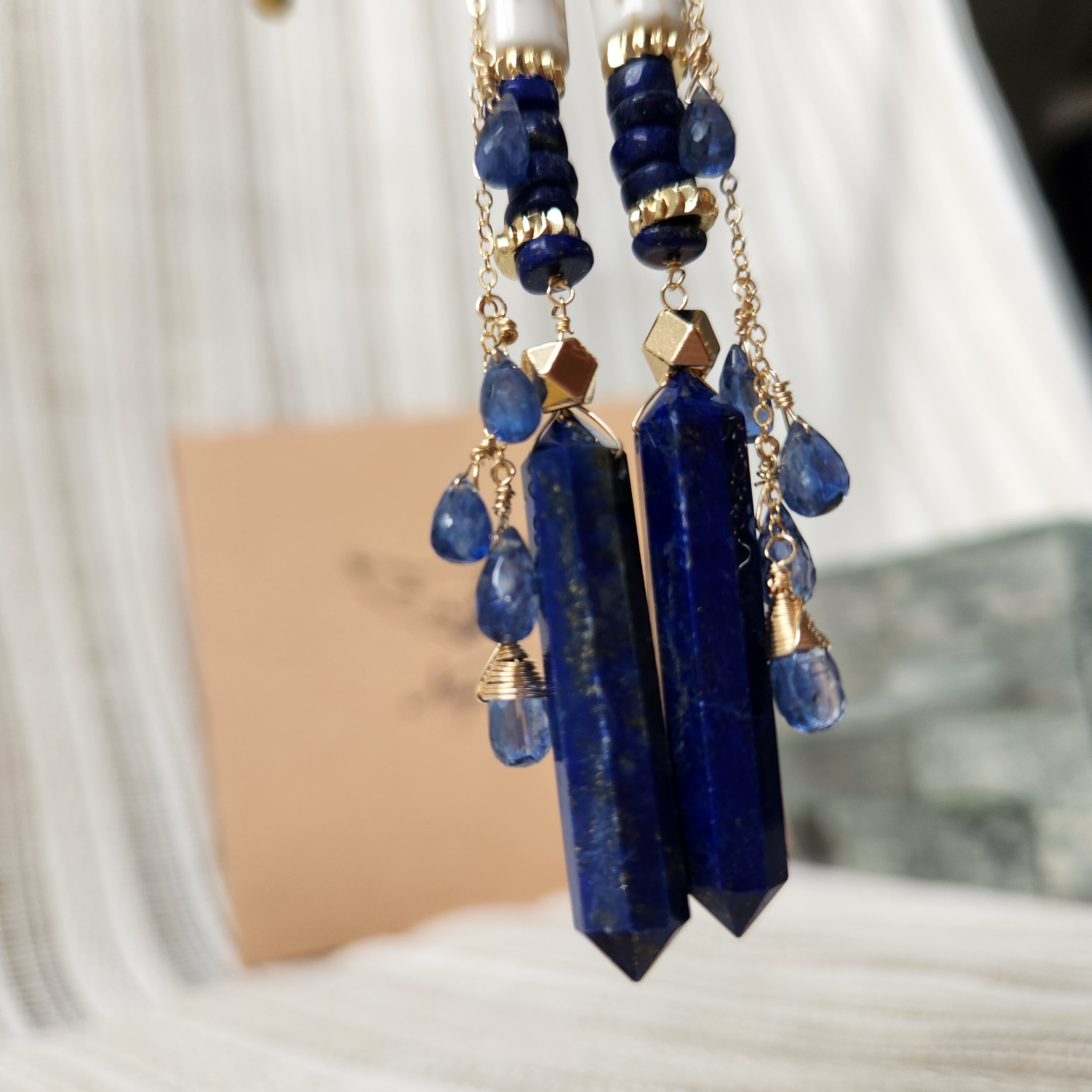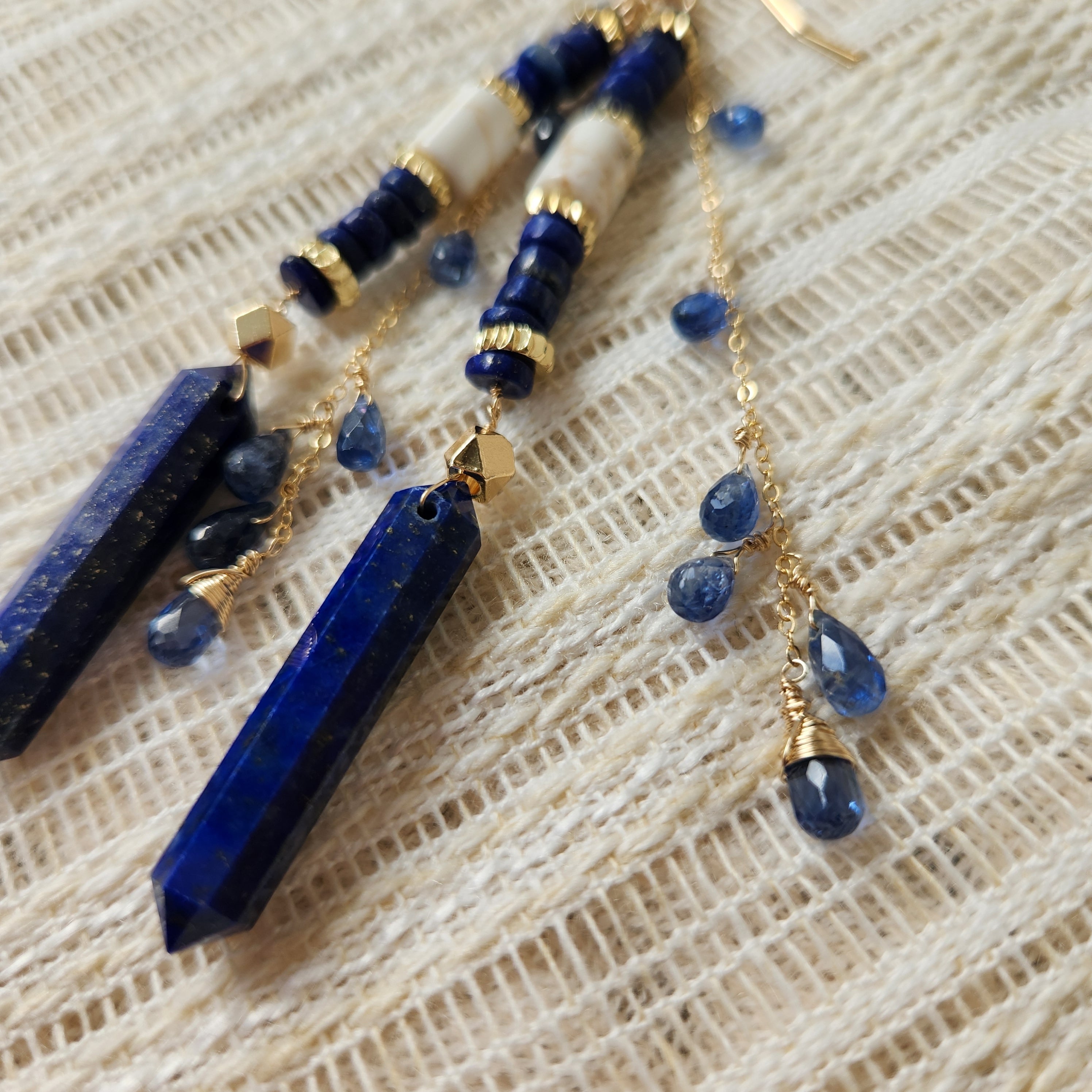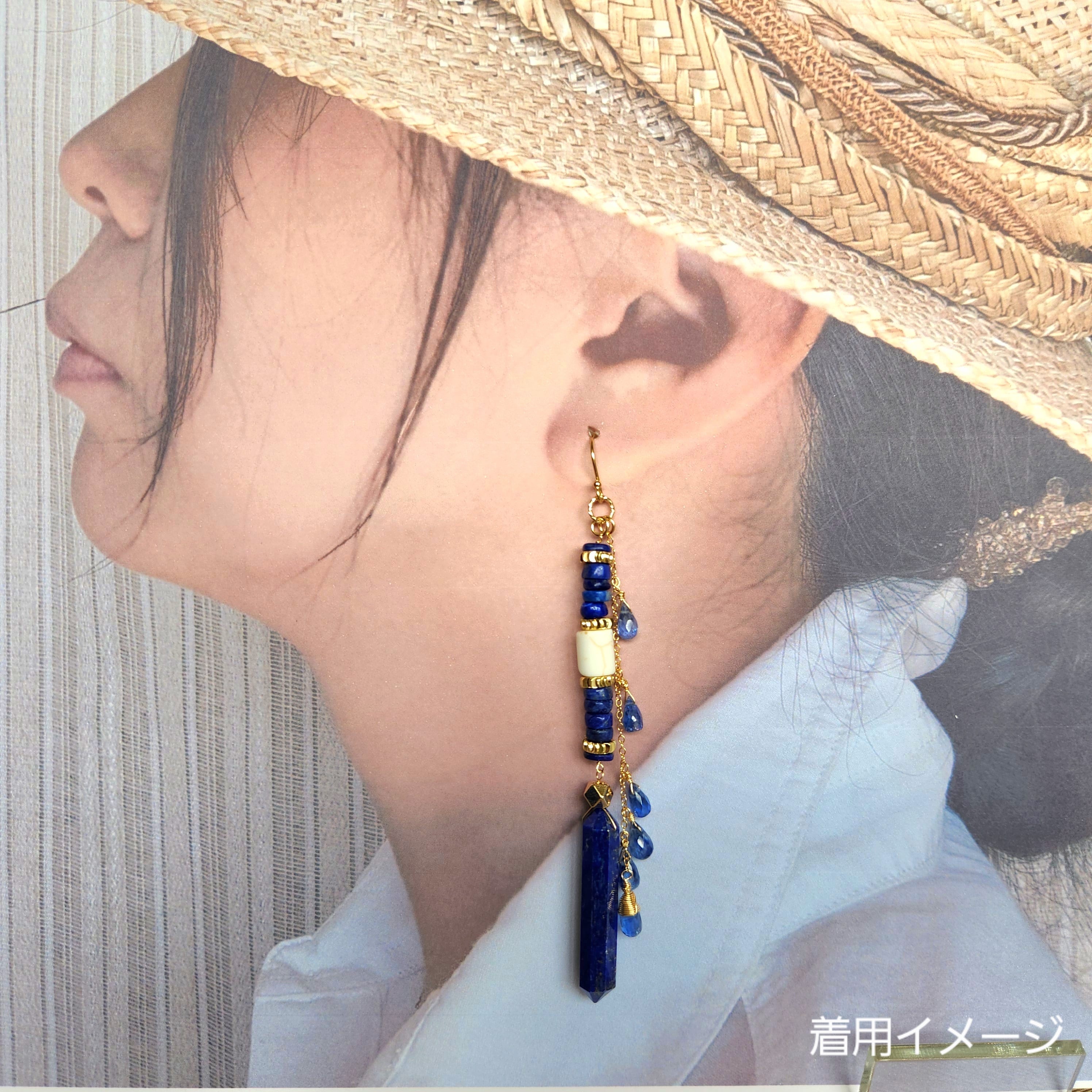 シャープな印象のペンシルカットのラピスラズリをメインに使用したロングタイプのピアスです。