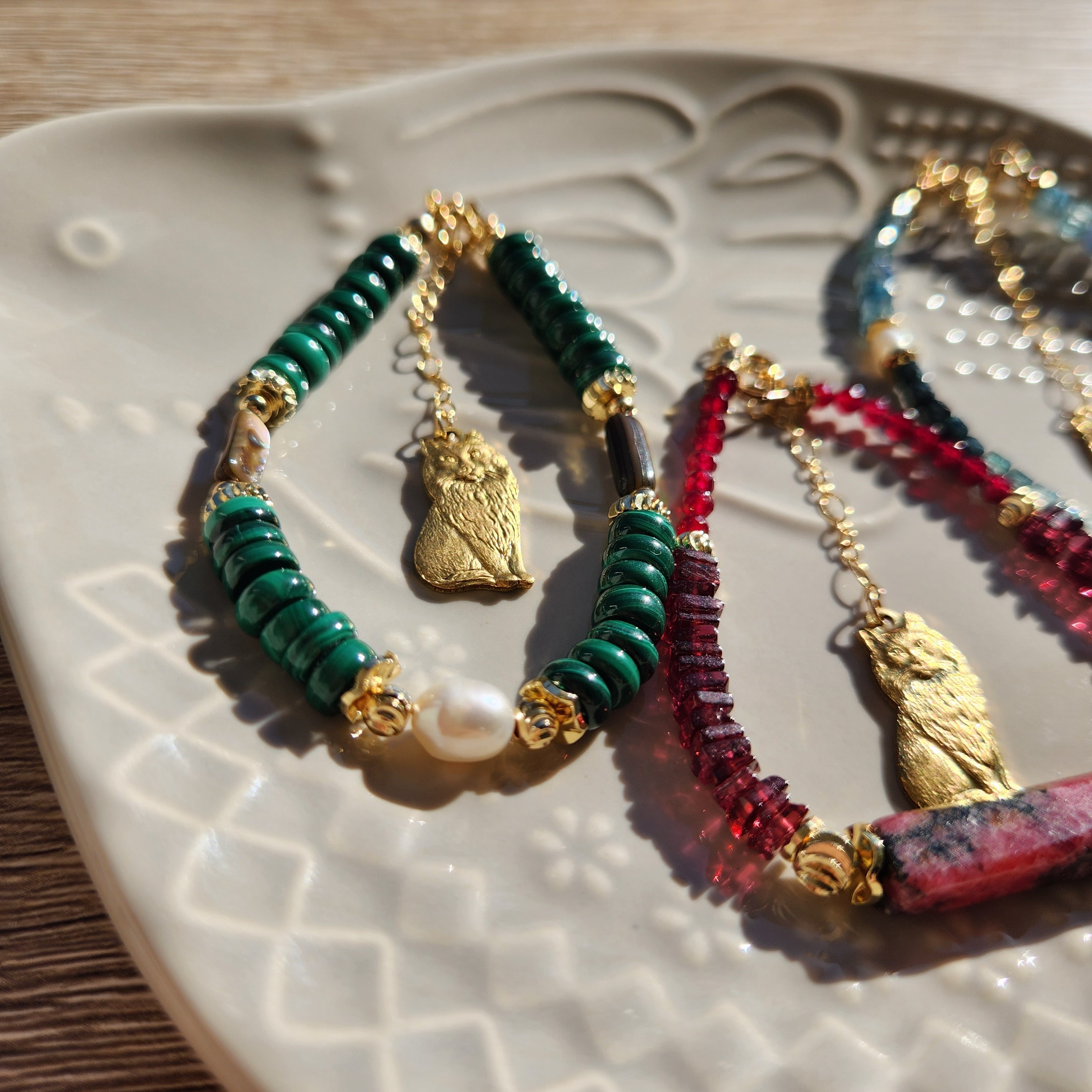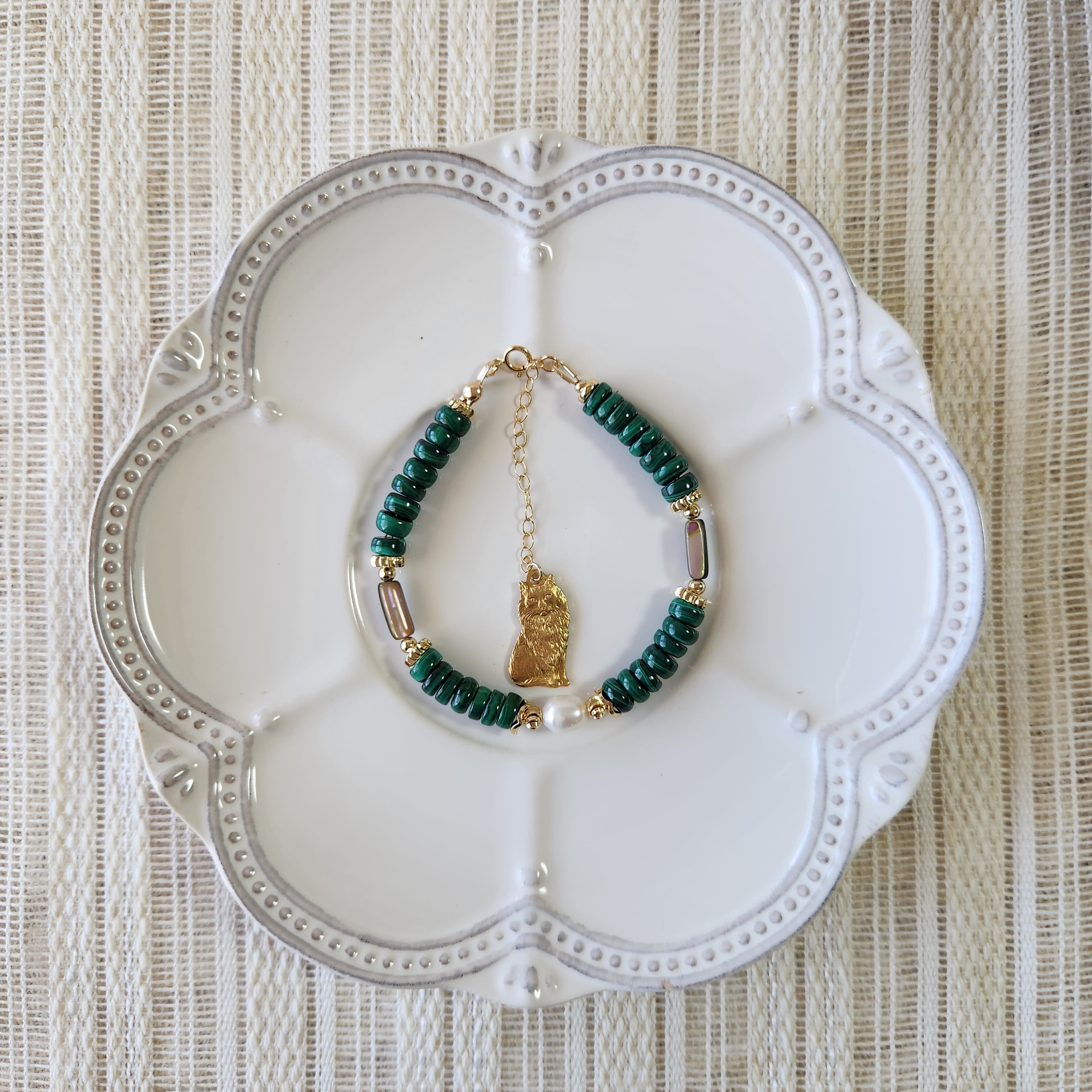 マラカイト×淡水パール×アバロンシェル×真鍮パーツねこ ブレスレット 25033B