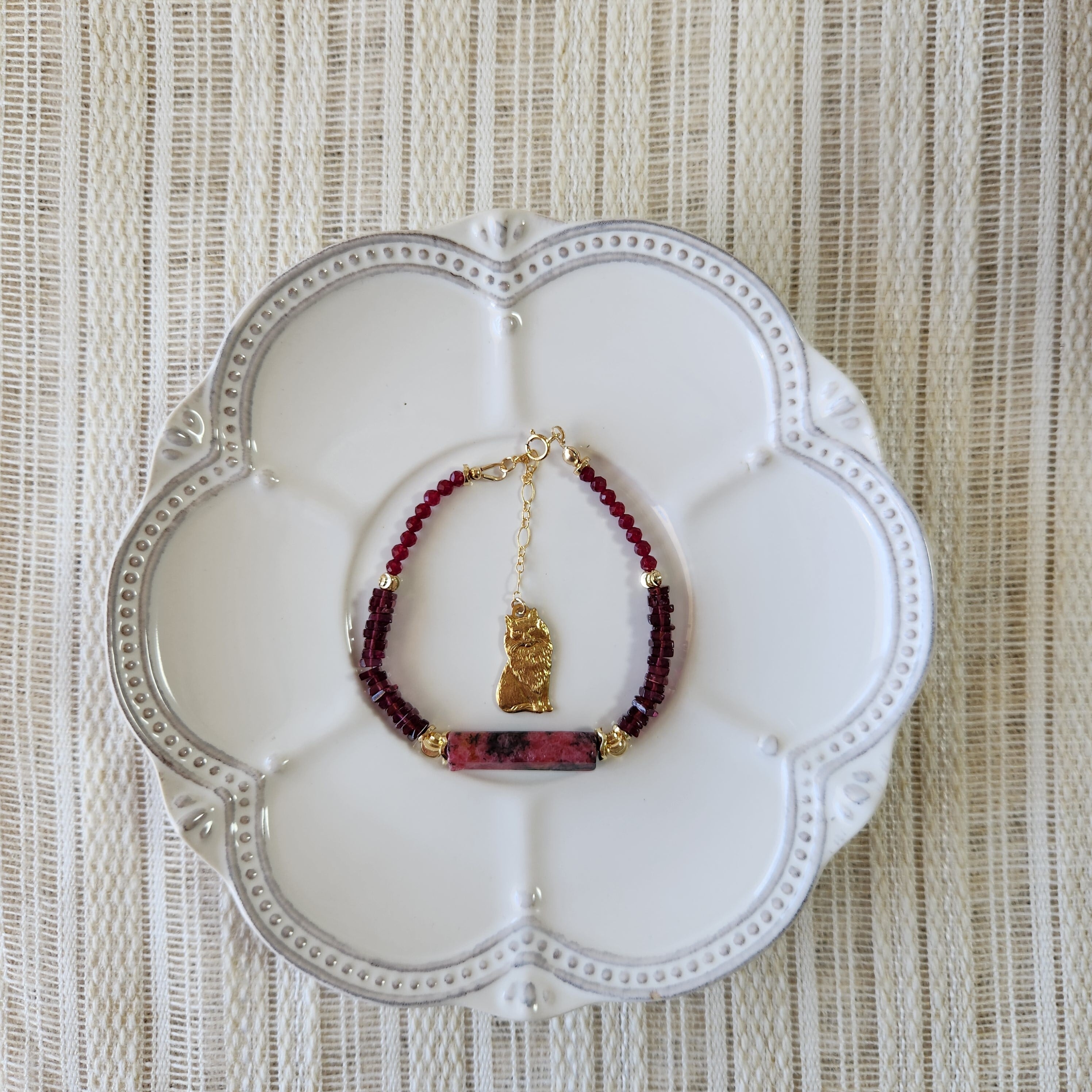 デンドリティックロードナイト×ガーネット×レッドジェード×真鍮パーツねこ ブレスレット 25034B
