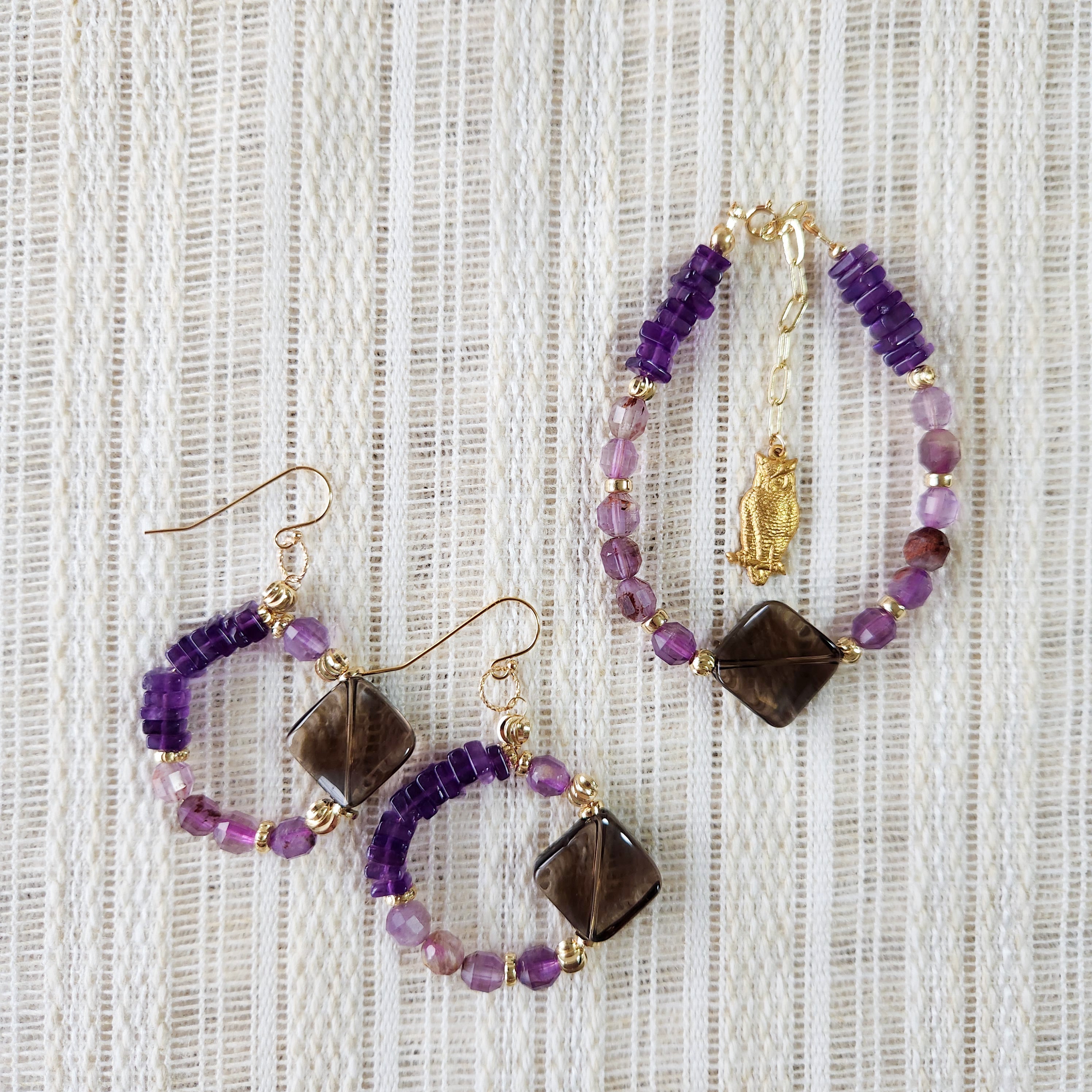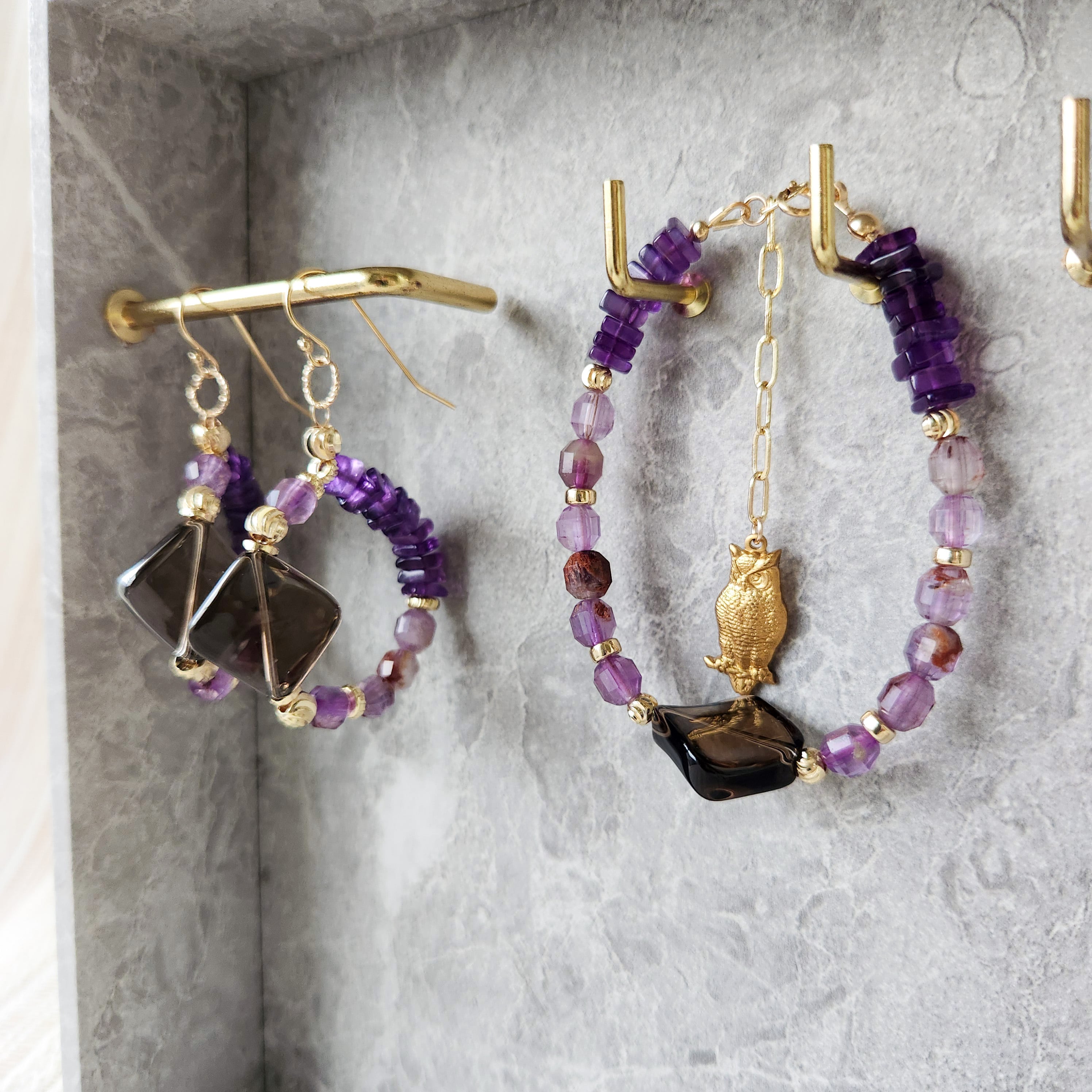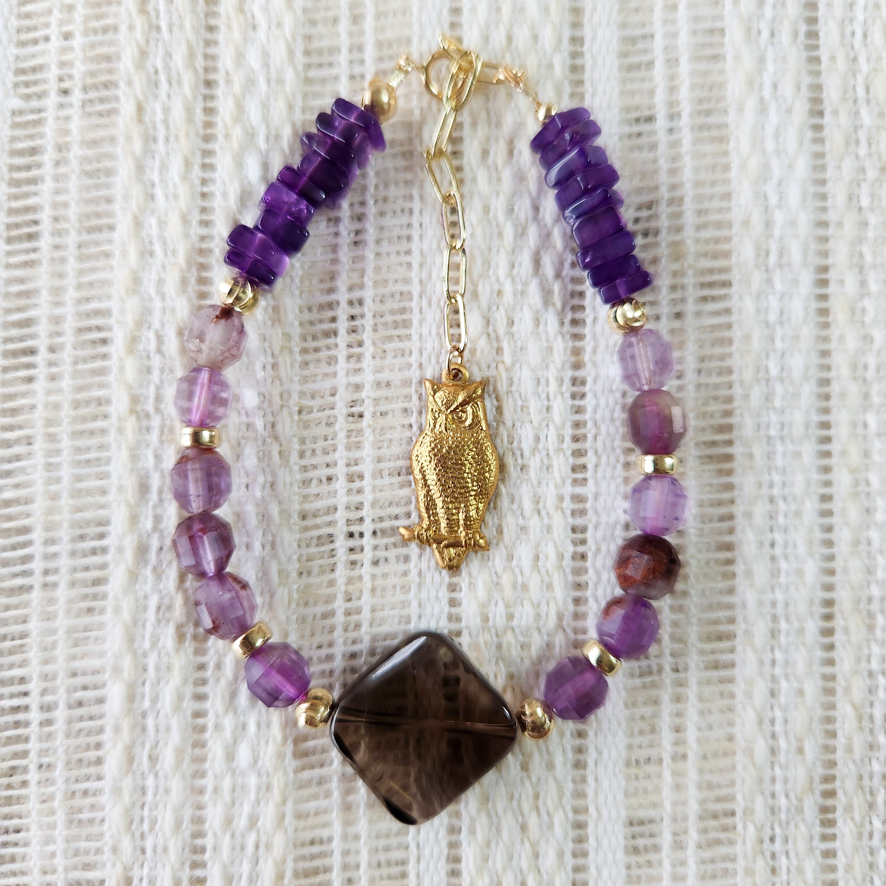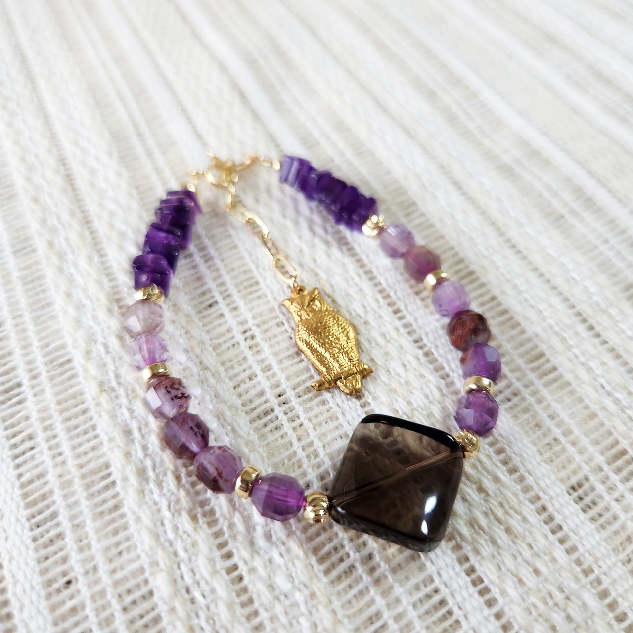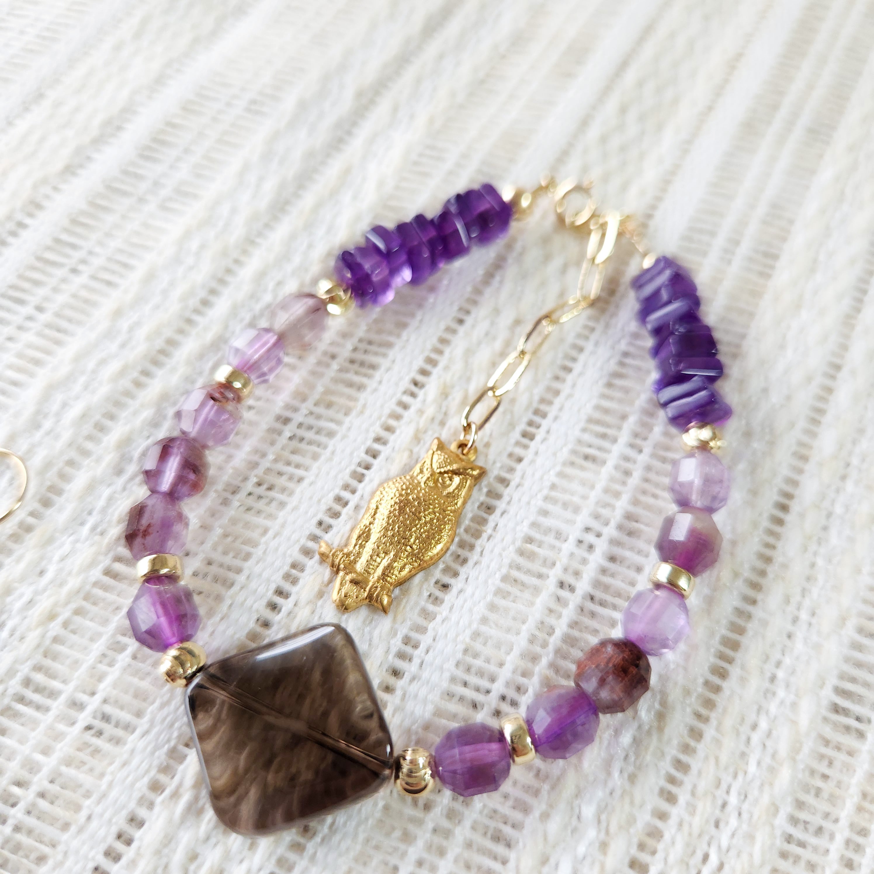 スモーキークォーツ×ガーデンアメジスト×真鍮パーツふくろう ブレスレット 25038B