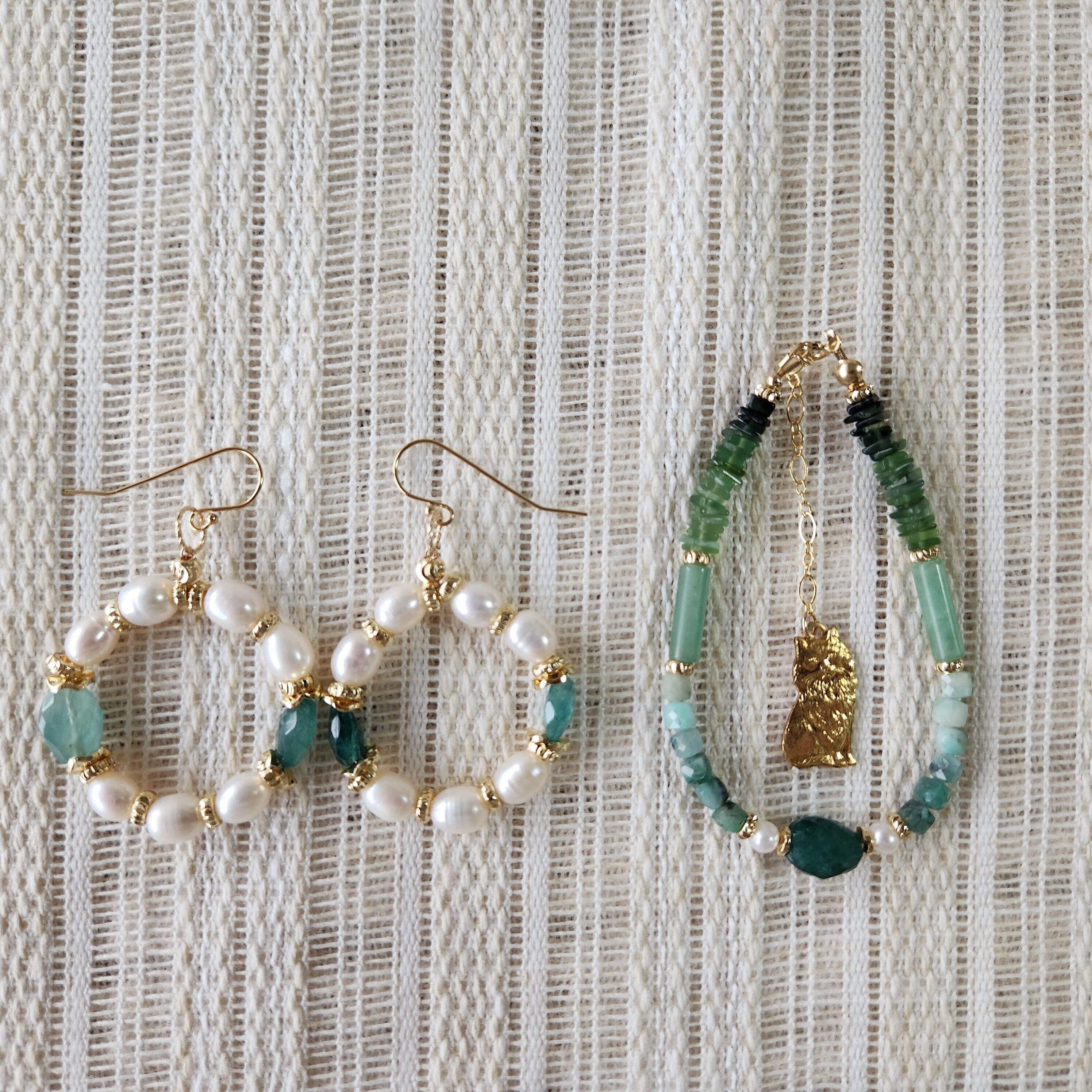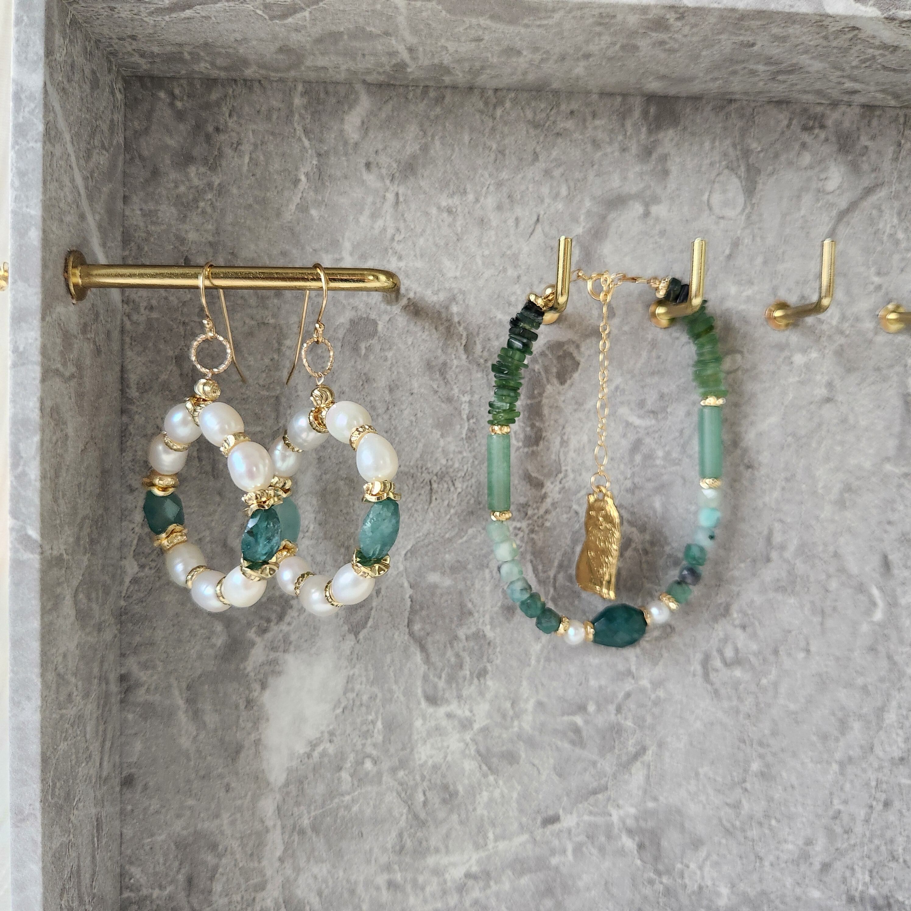 美しいブルーグリーンの希少石グランディディエライトをメインに使用したピアスです。