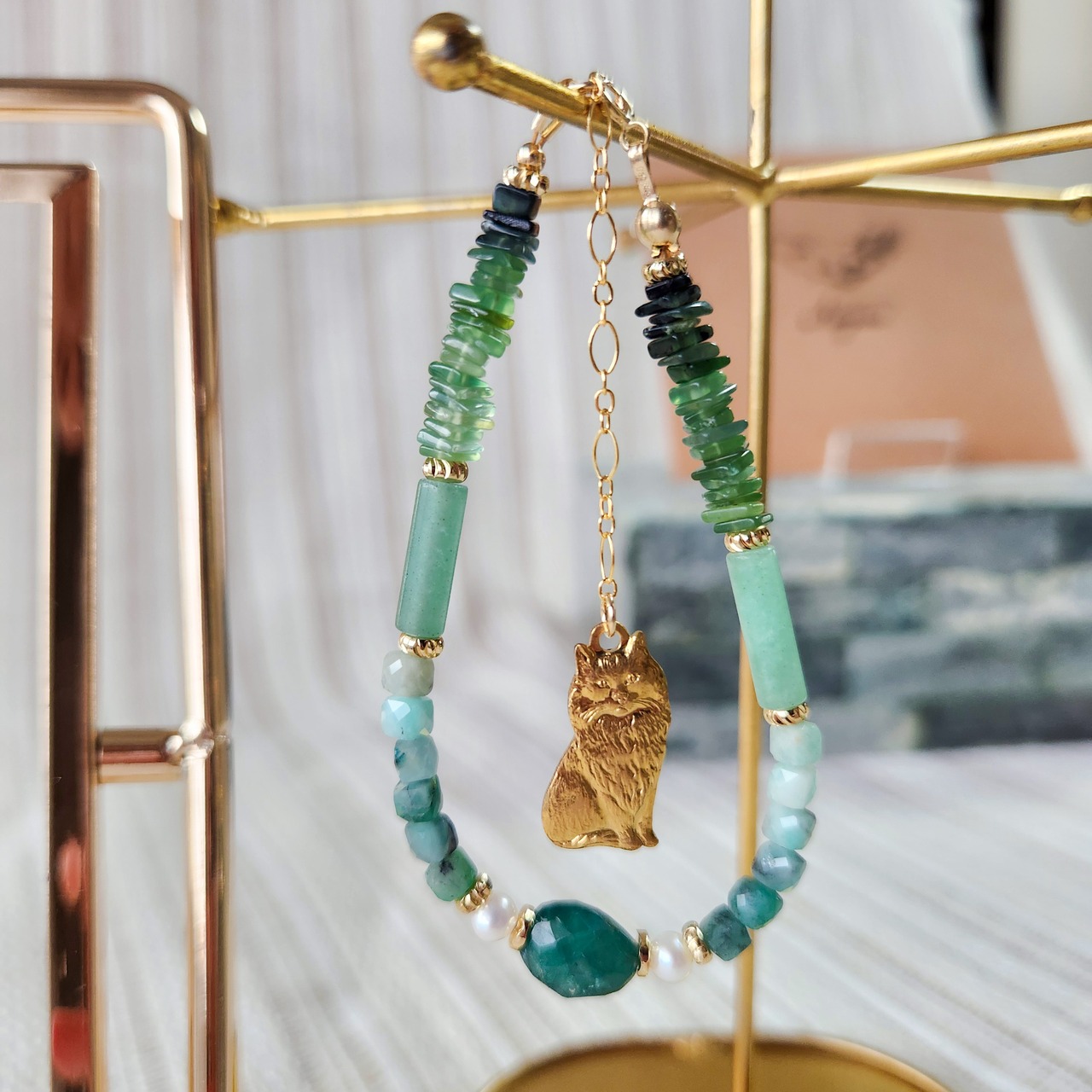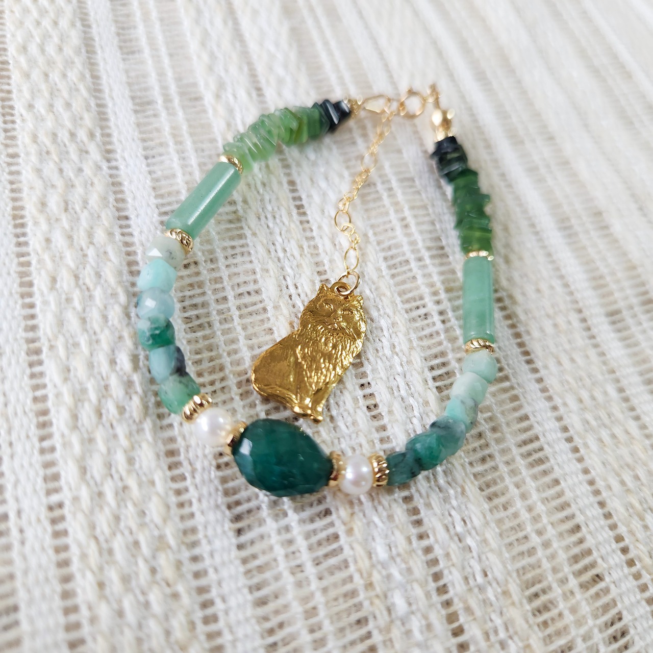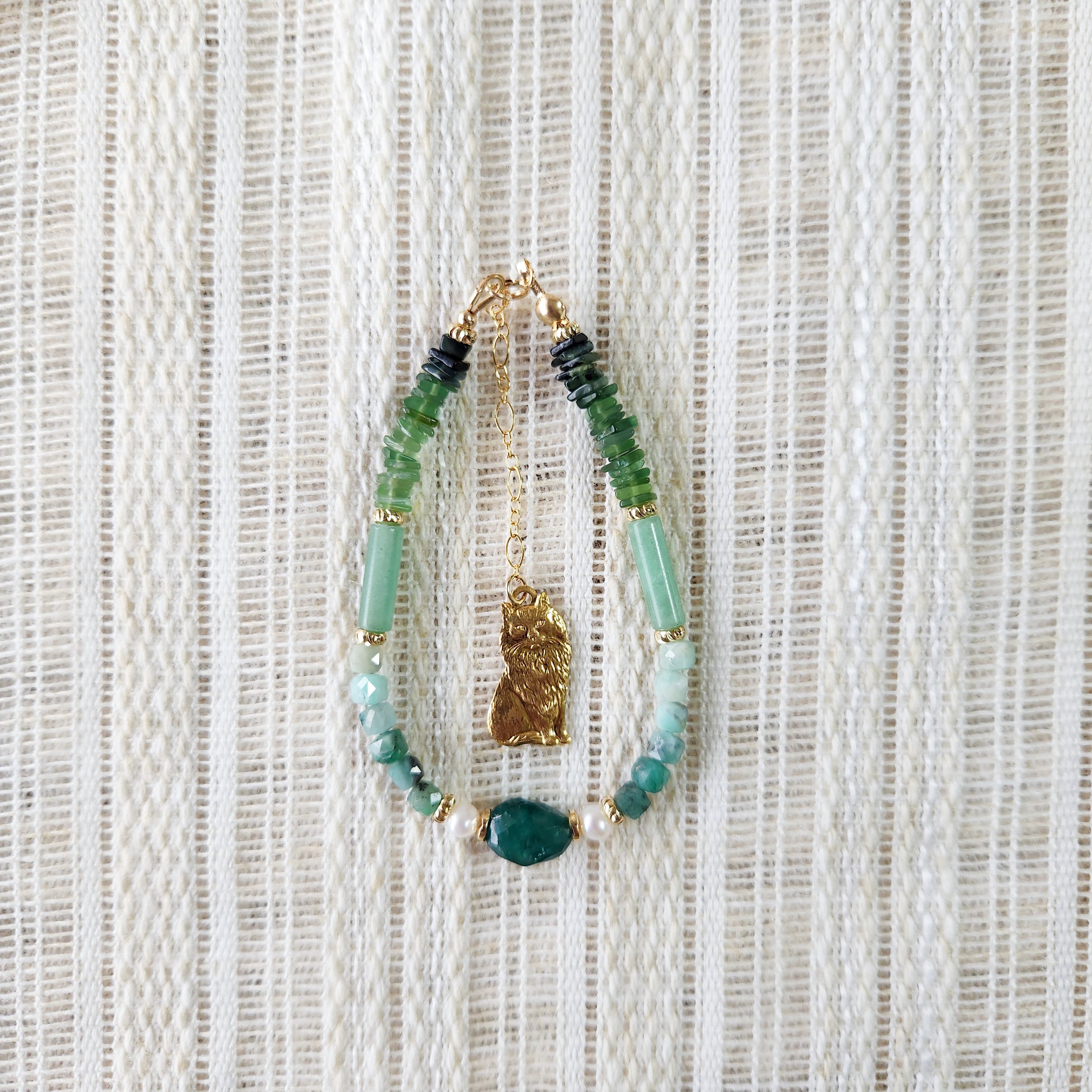 グランディディエライト×エメラルド×グリーンアベンチュリン×サーペティン×淡水パール×真鍮パーツねこ ブレスレット 25039B