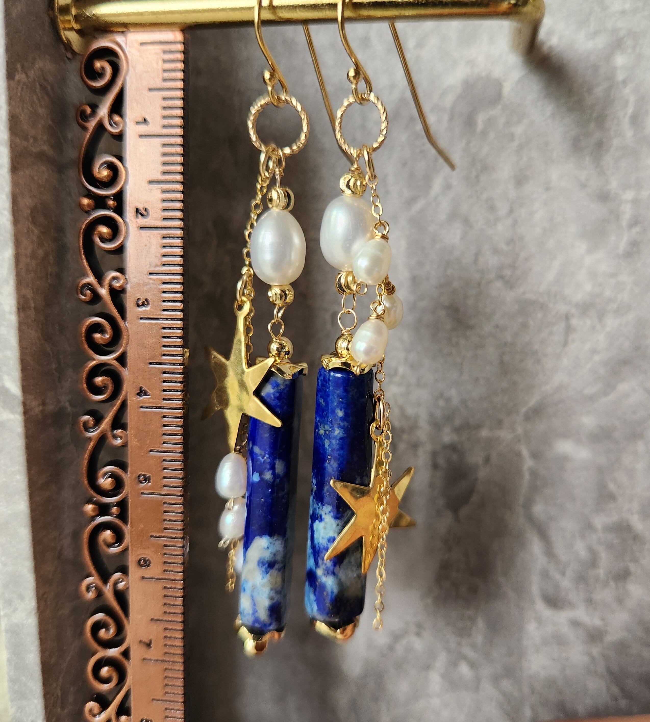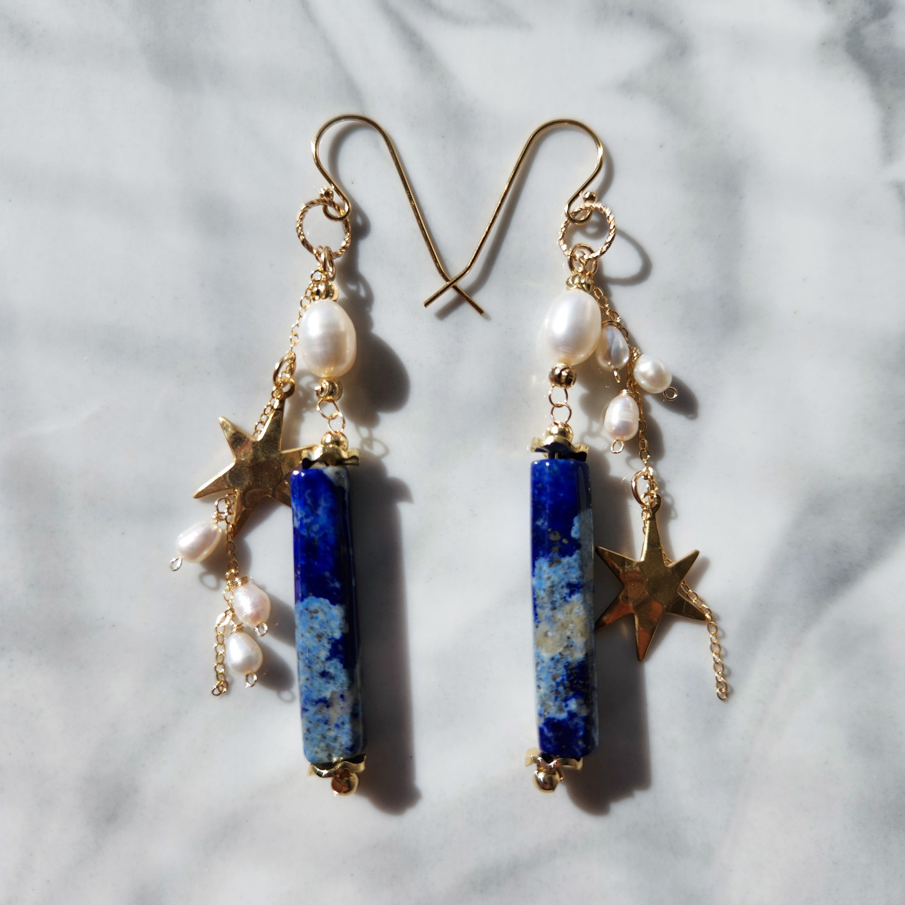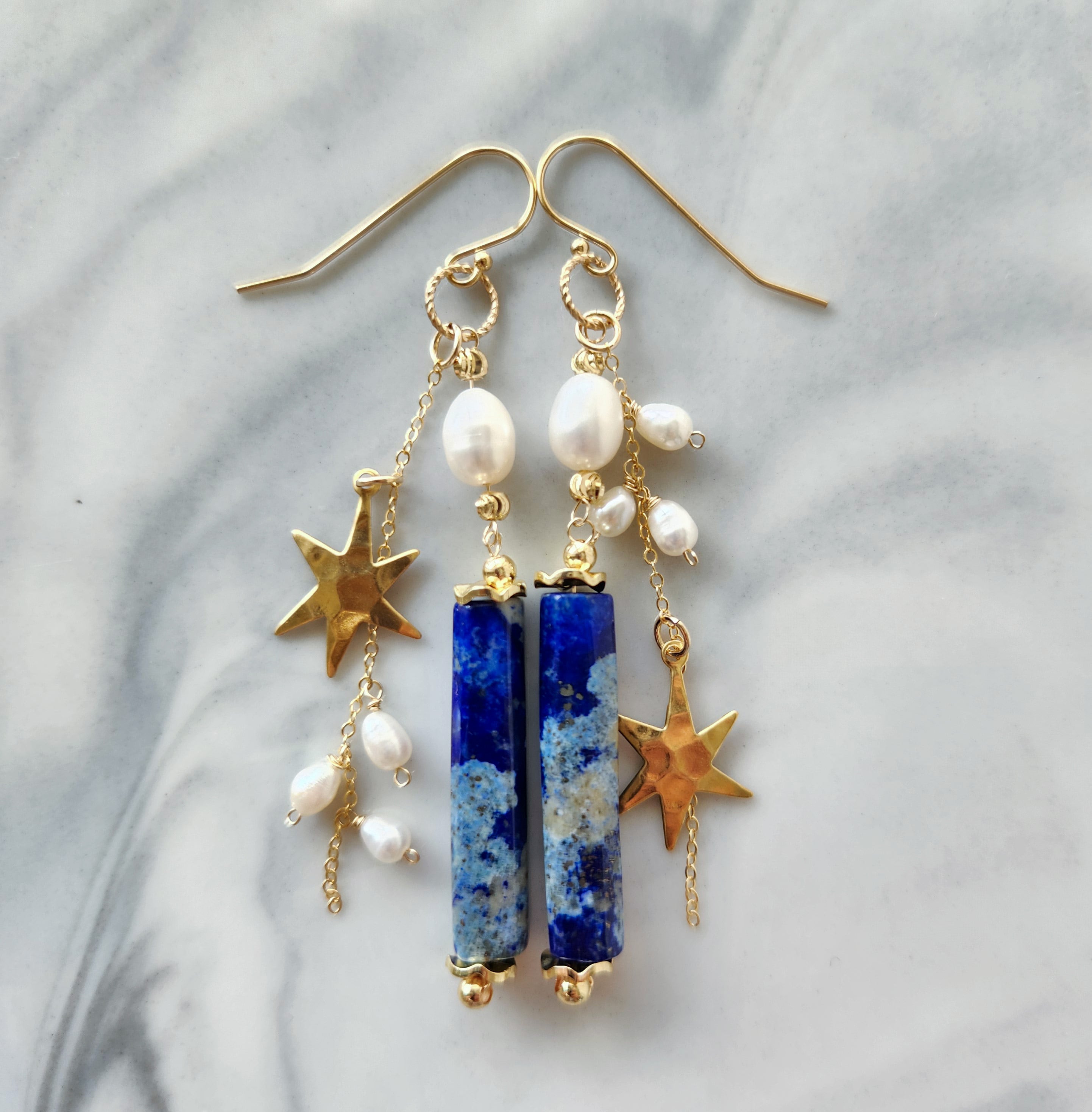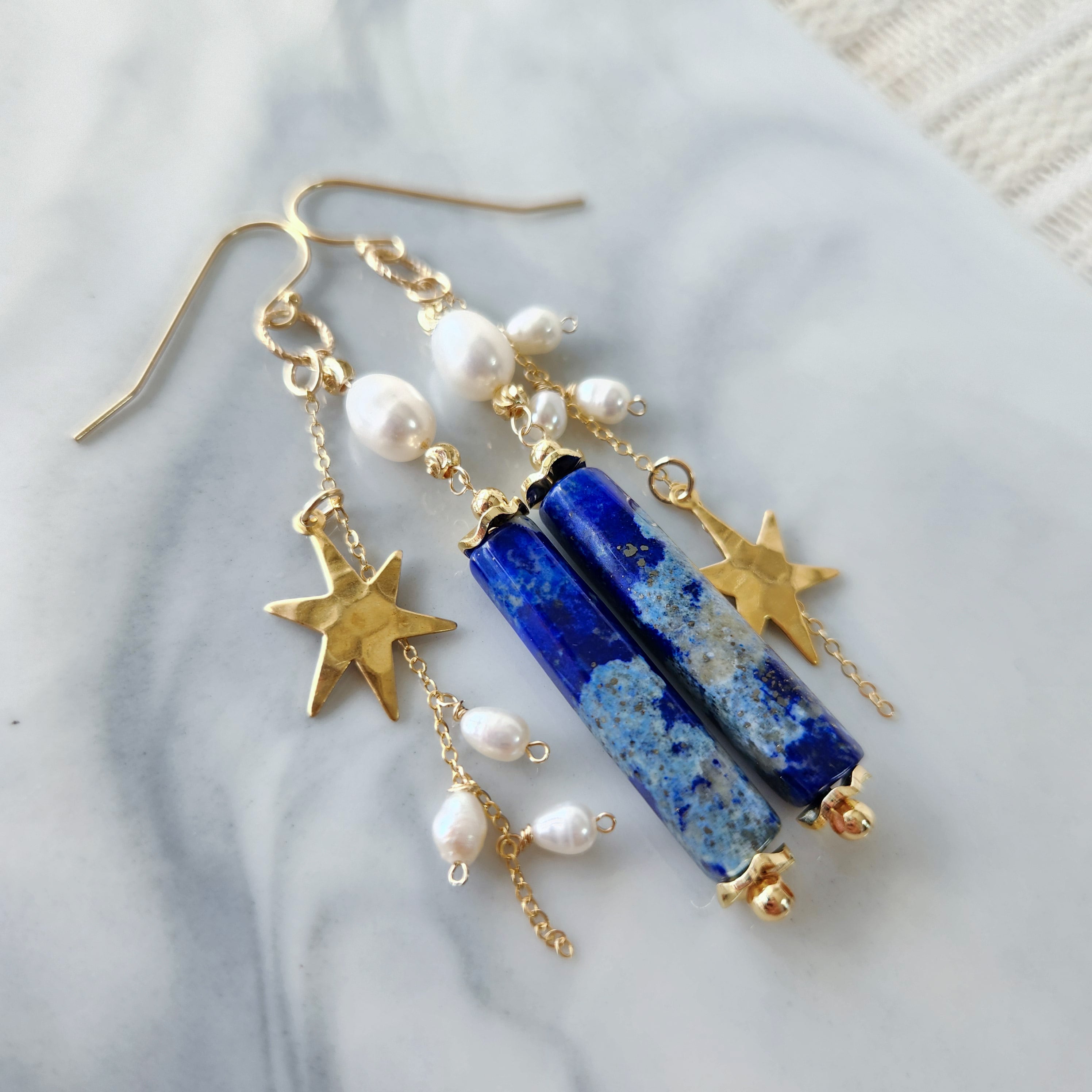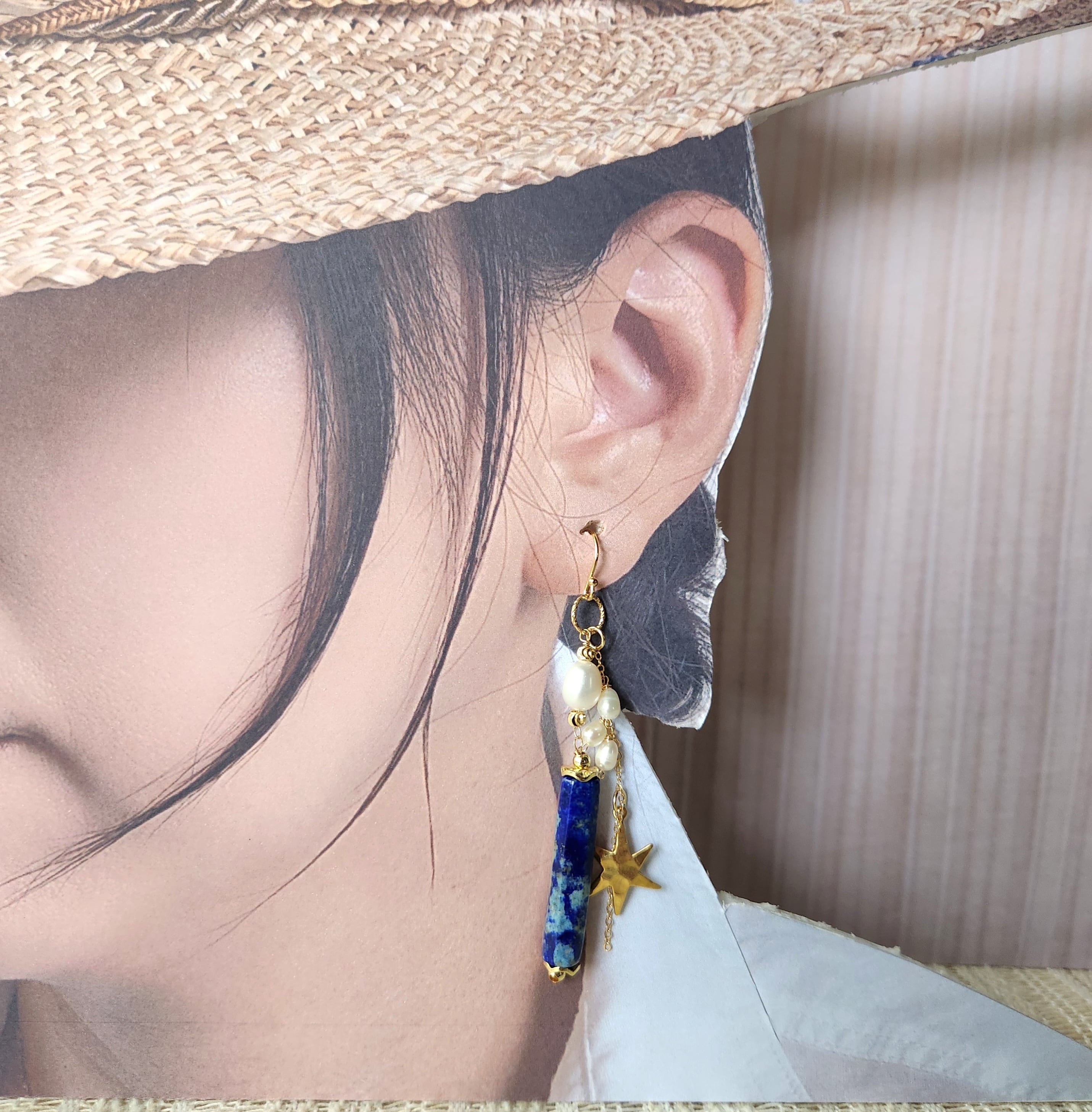 大胆な模様の入ったラピスラズリにパールと星をちりばめたアシンメトリーのピアスです。