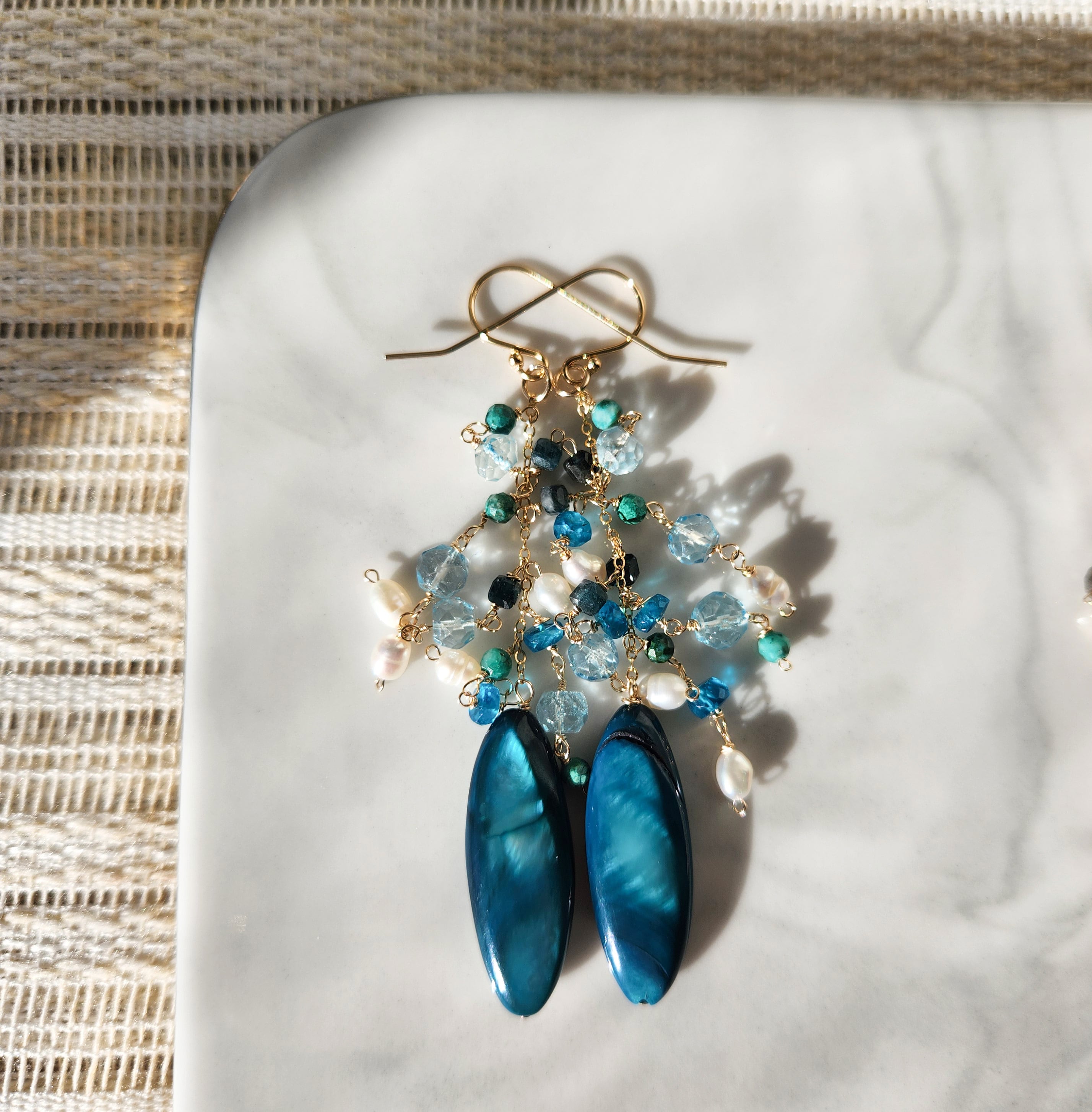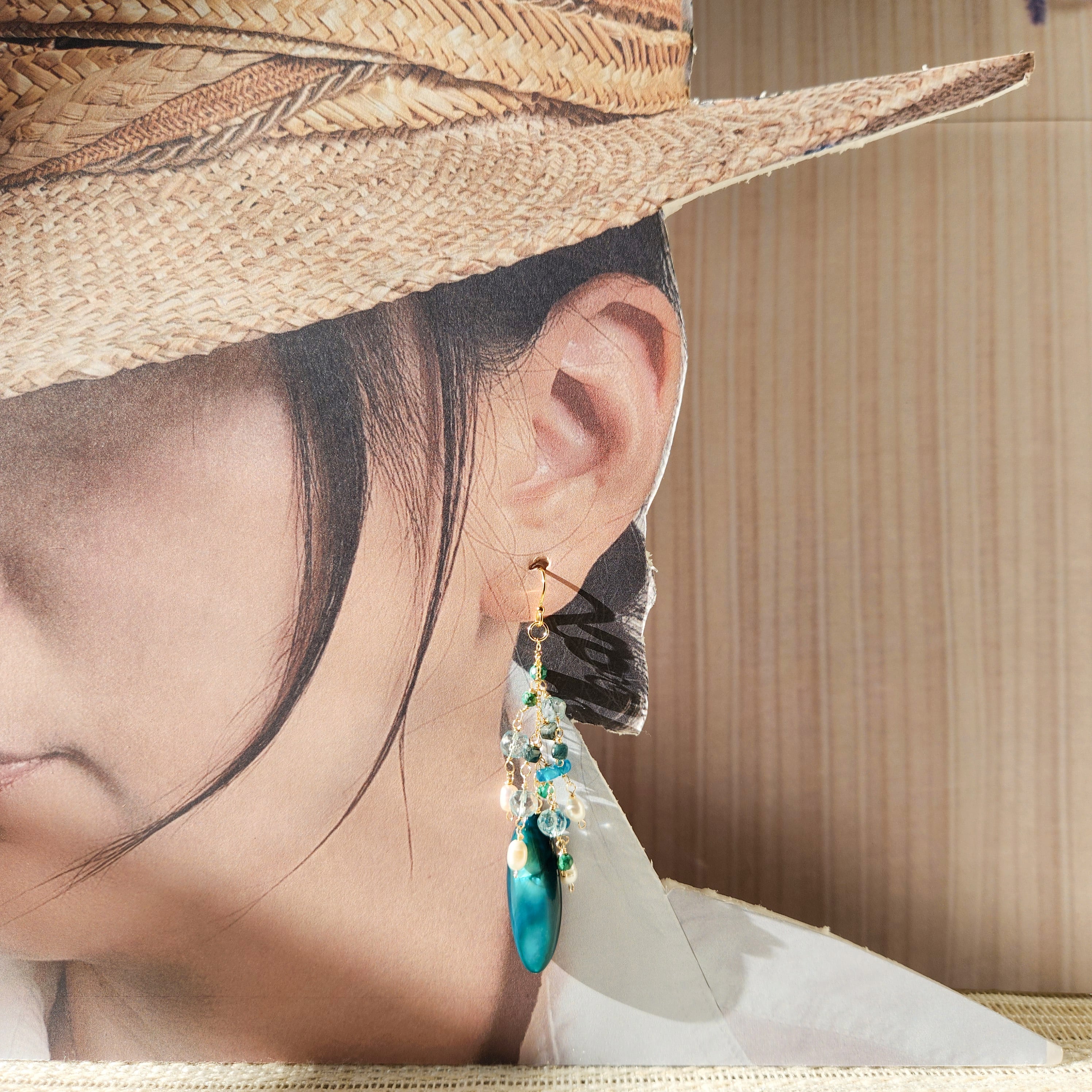 ブルーグリーンマザーオフパール×淡水ケシパール×アパタイト×クォーツ×トルマリン×クリソコラ ピアス 25050P