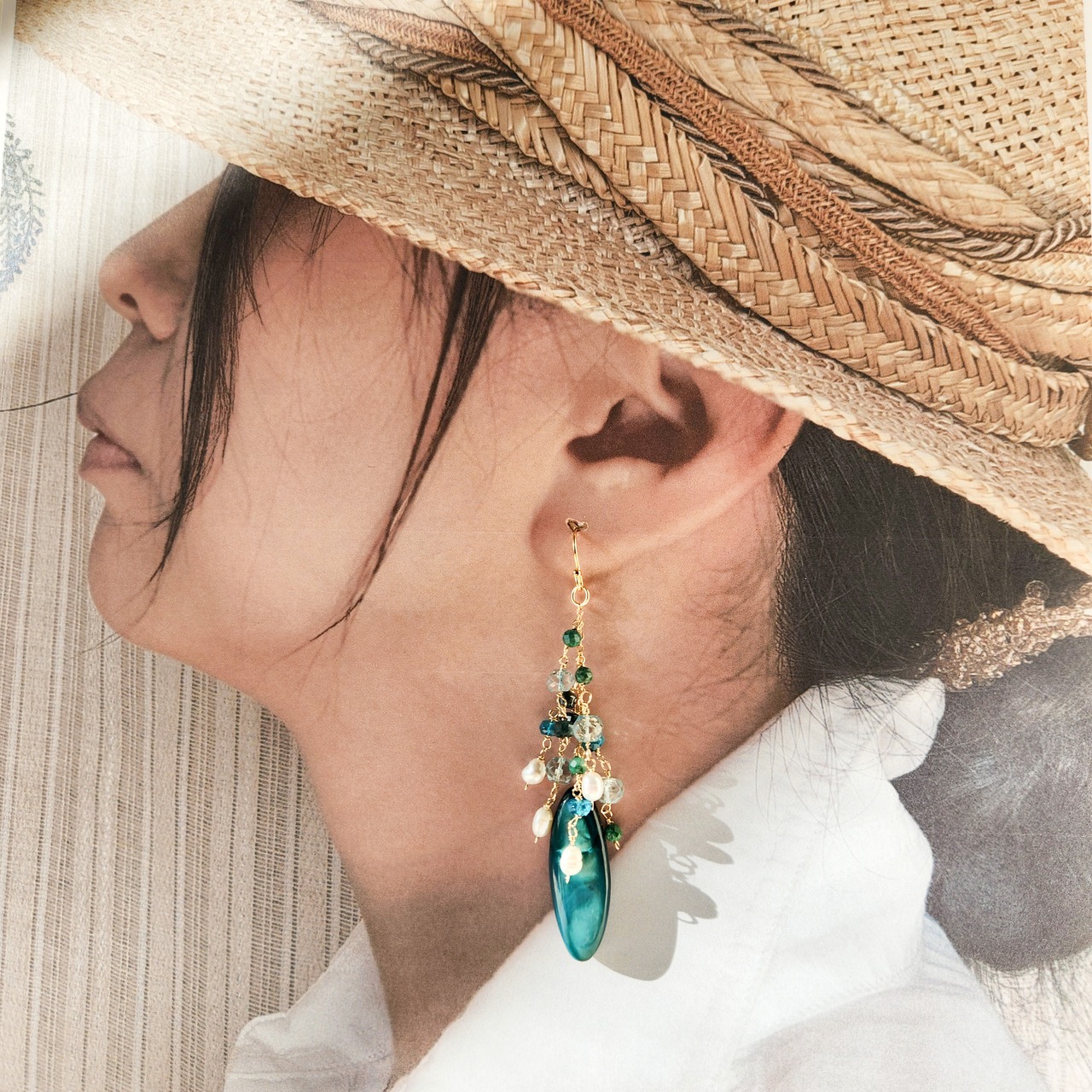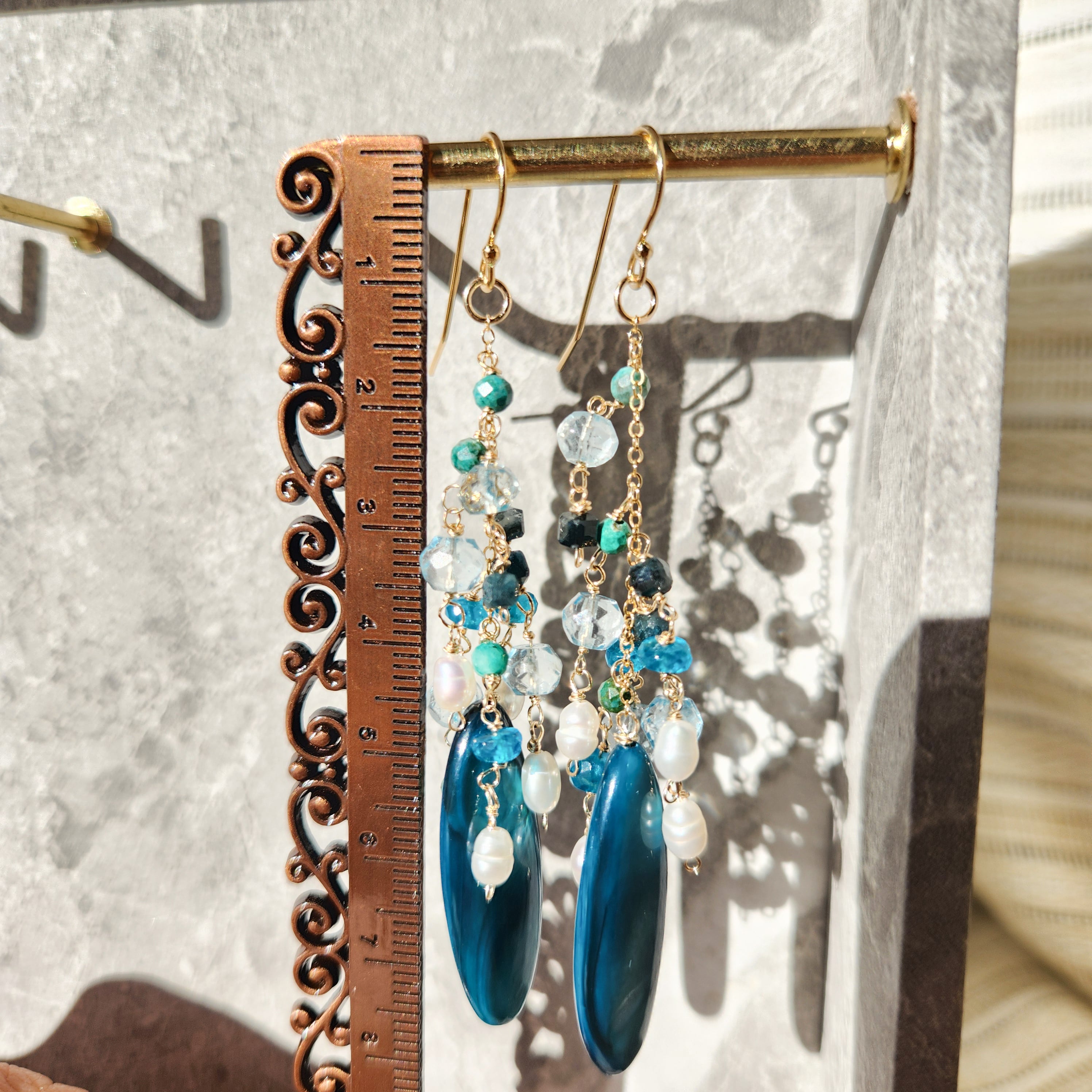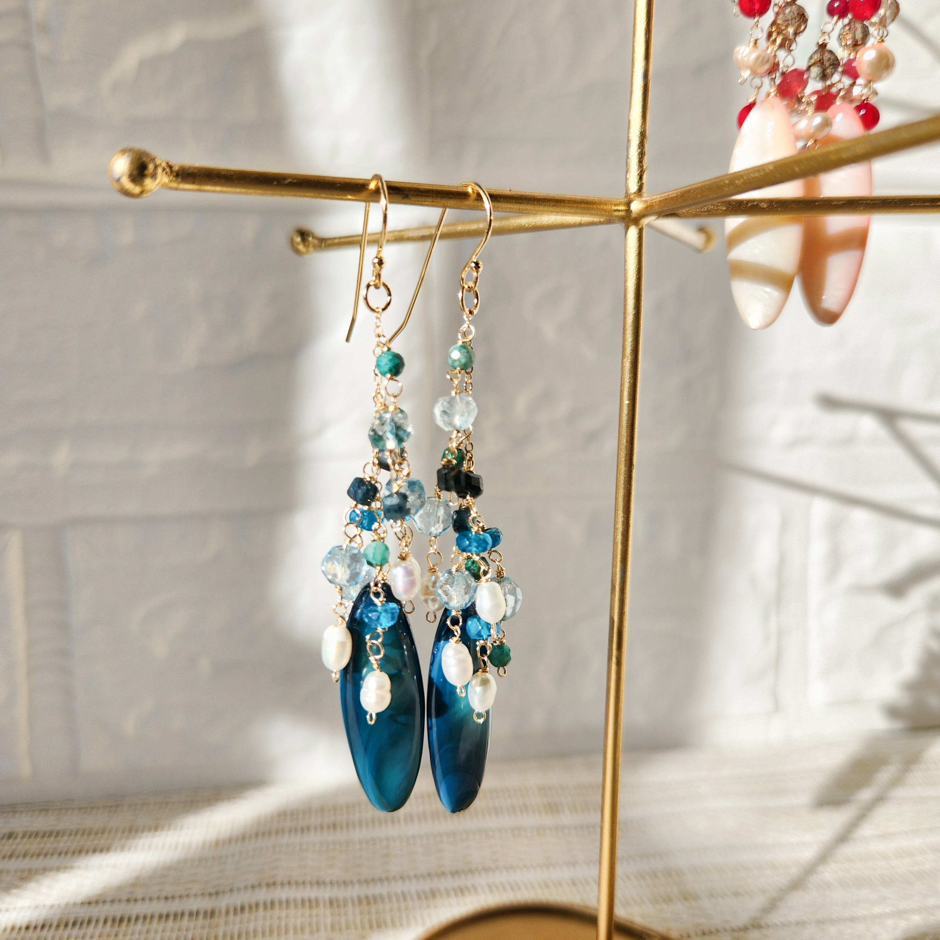 淡水ケシパールやブルーとグリーンの小粒ストーンを組み合わせたピアスです。