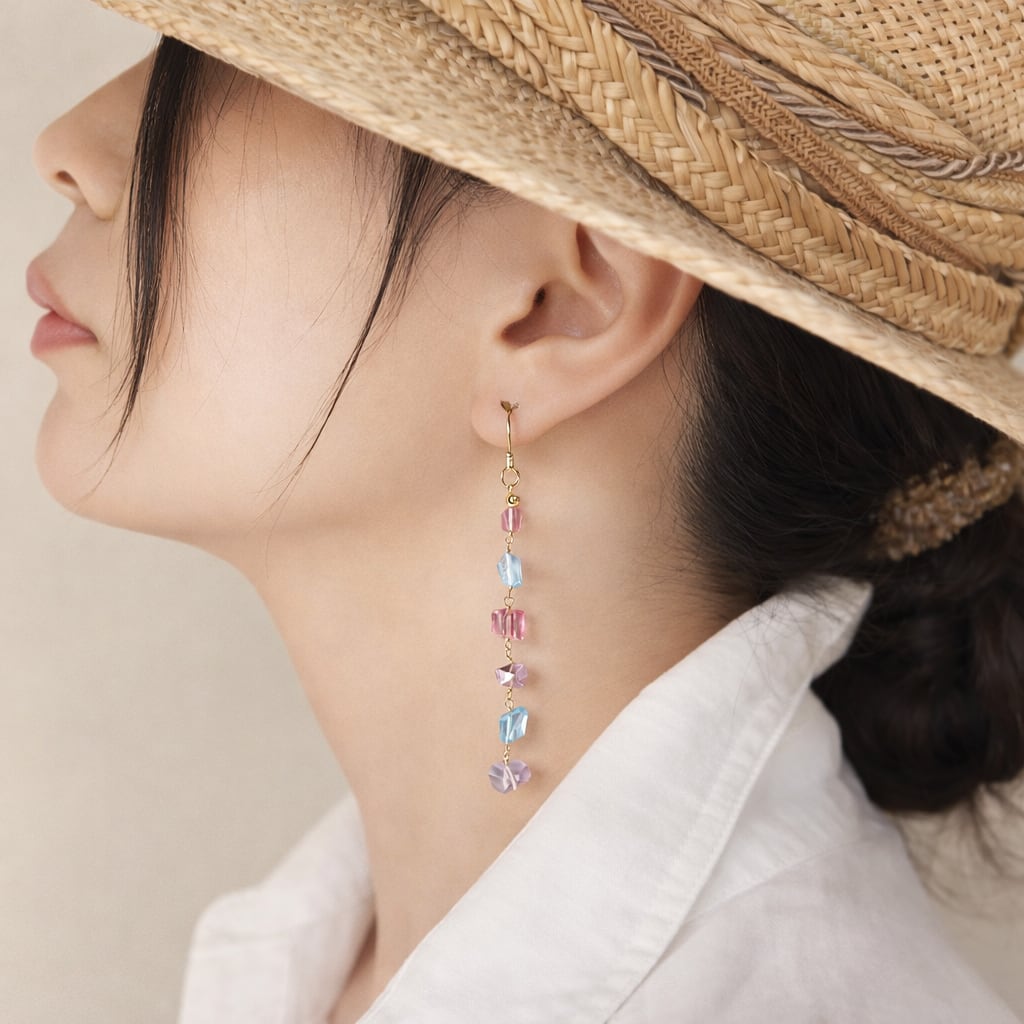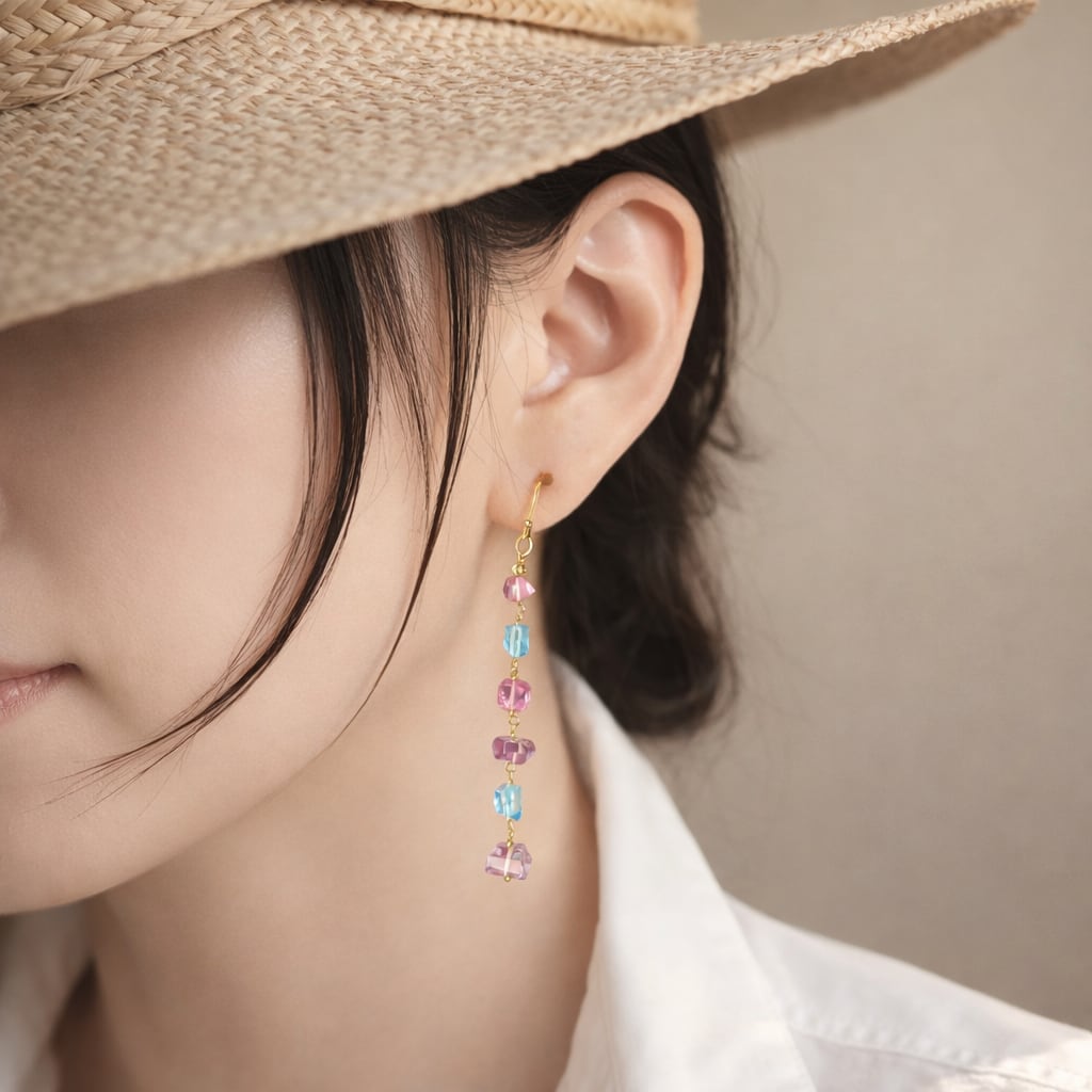 ピンクとスカイブルーのトパーズとアメジストをつなぎ合わせたピアスです。