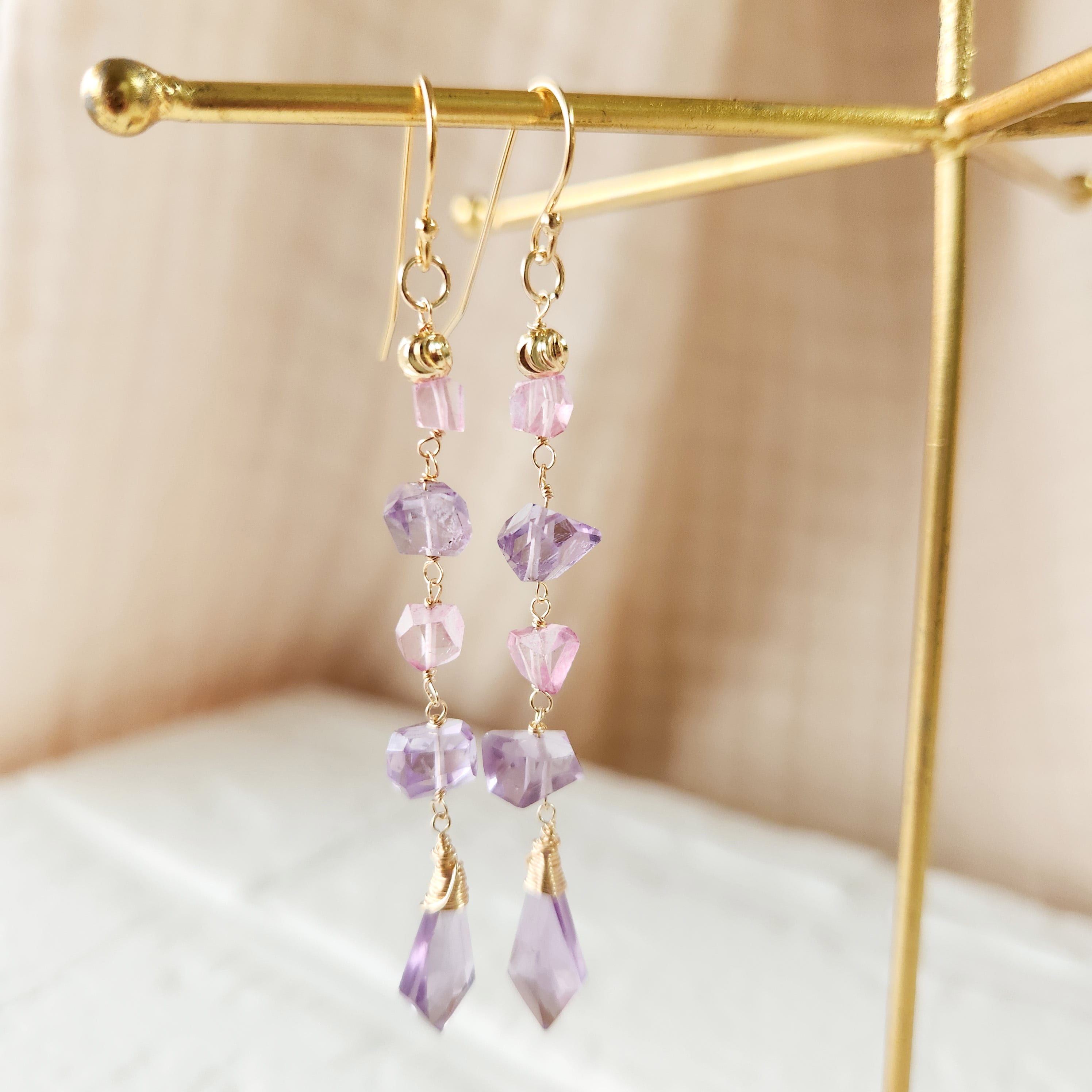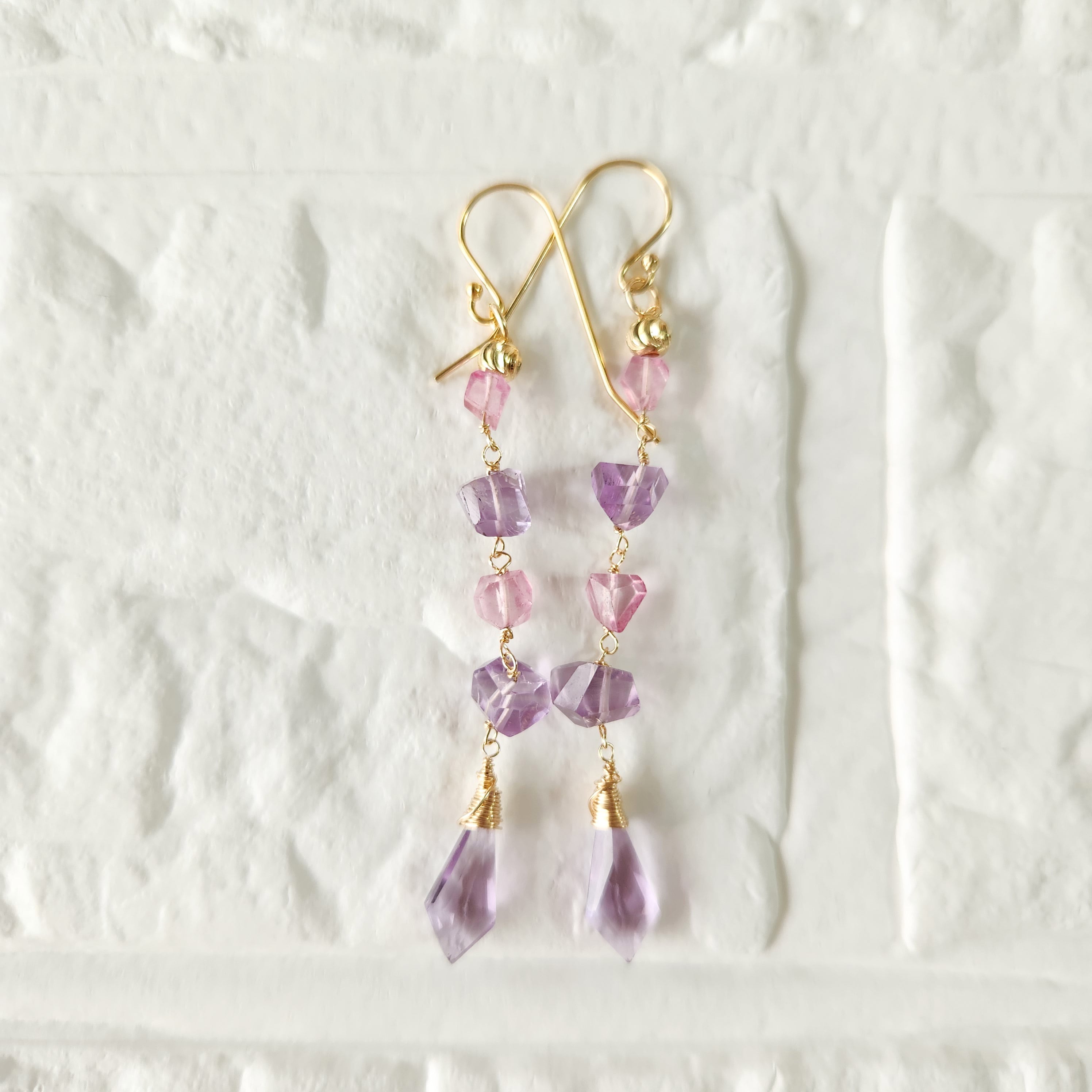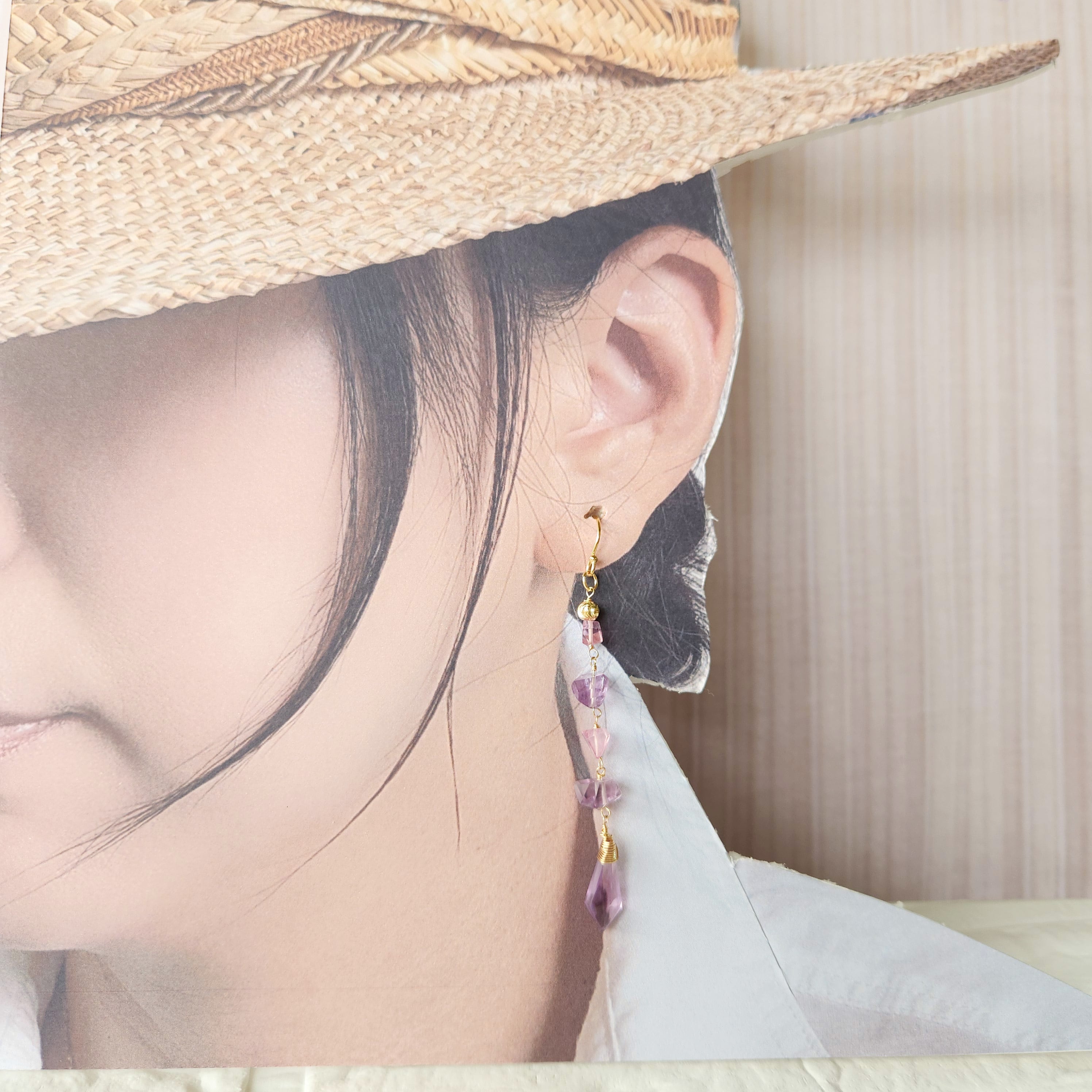 ランダムな形のトパーズとアメジストをつなぎ合わせたピアスです。