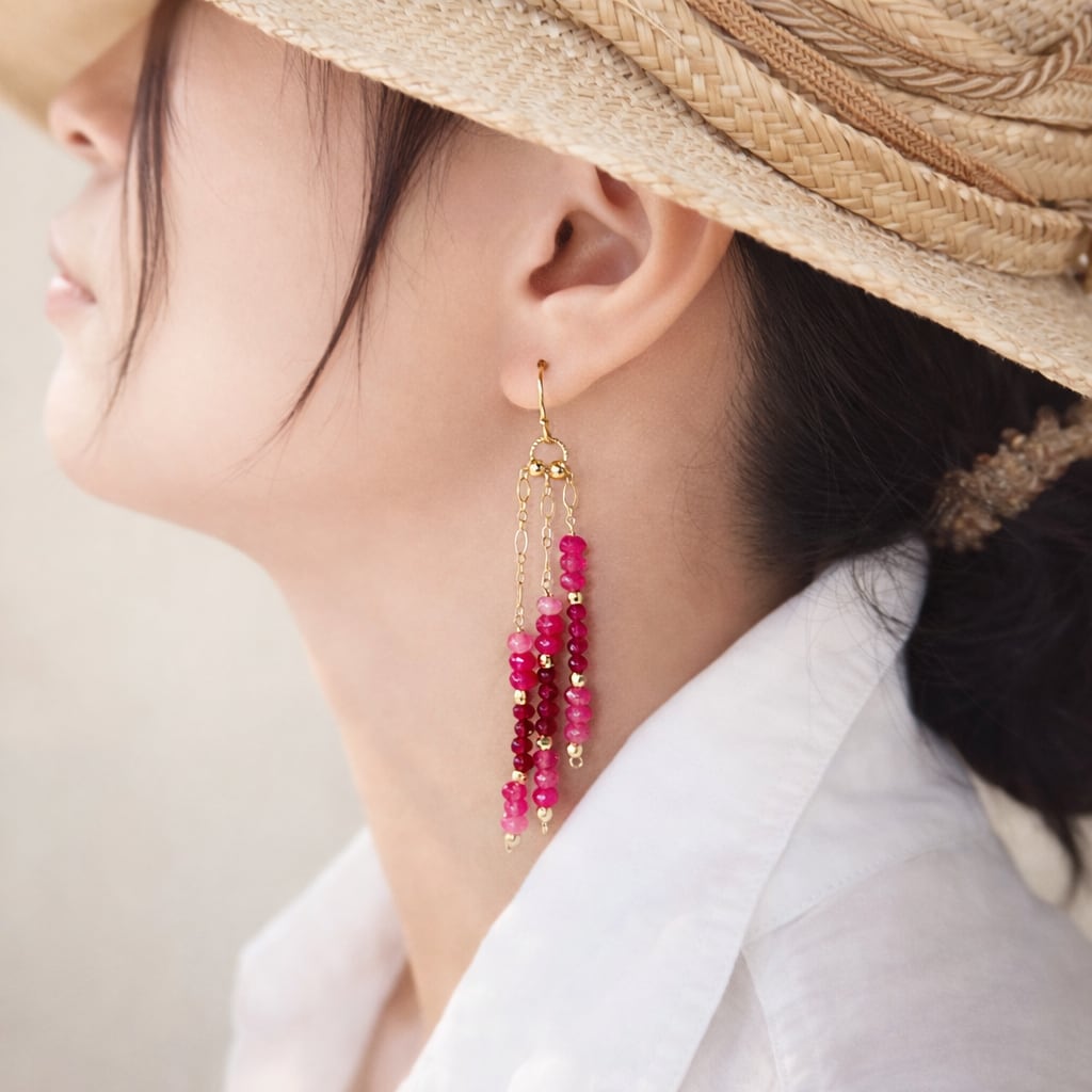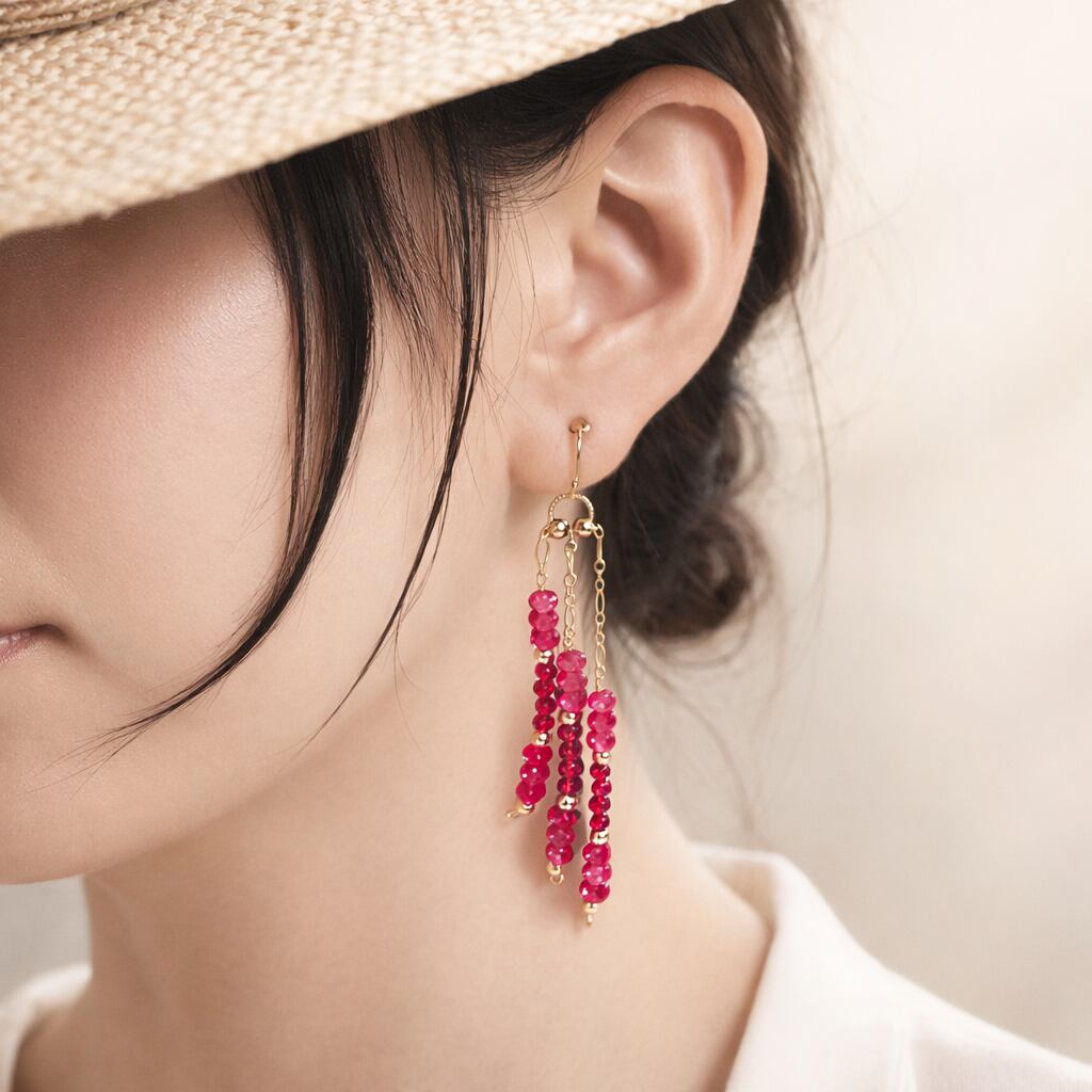 耳元の赤が、装いにさりげないアクセントを添えるピアスです。