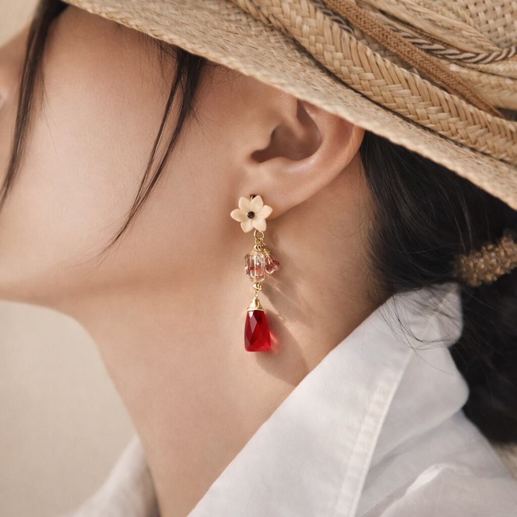 耳元には立体的な花の形にカットされたクィーンコンクシェルをあしらいました。