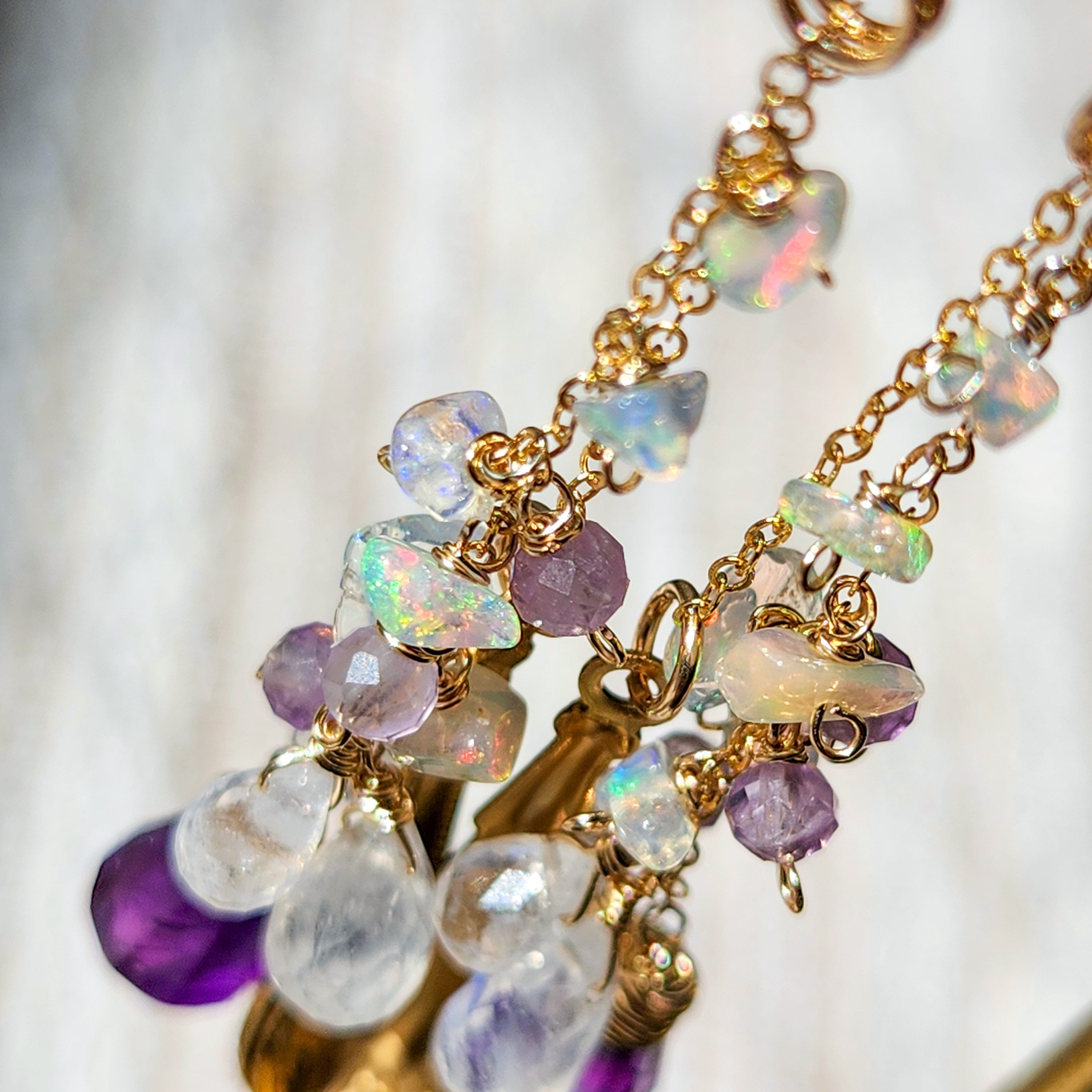 シラーが美しいレインボームーンストーンと、遊色がきらめくエチオピアオパールを組み合わせたピアスです。