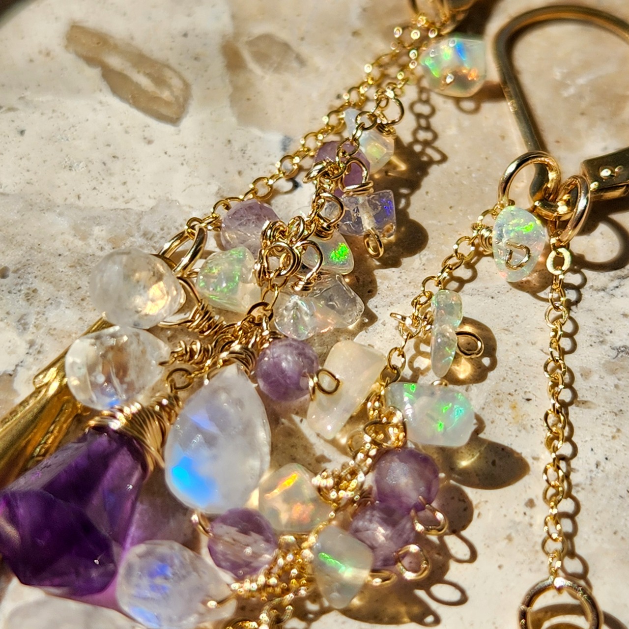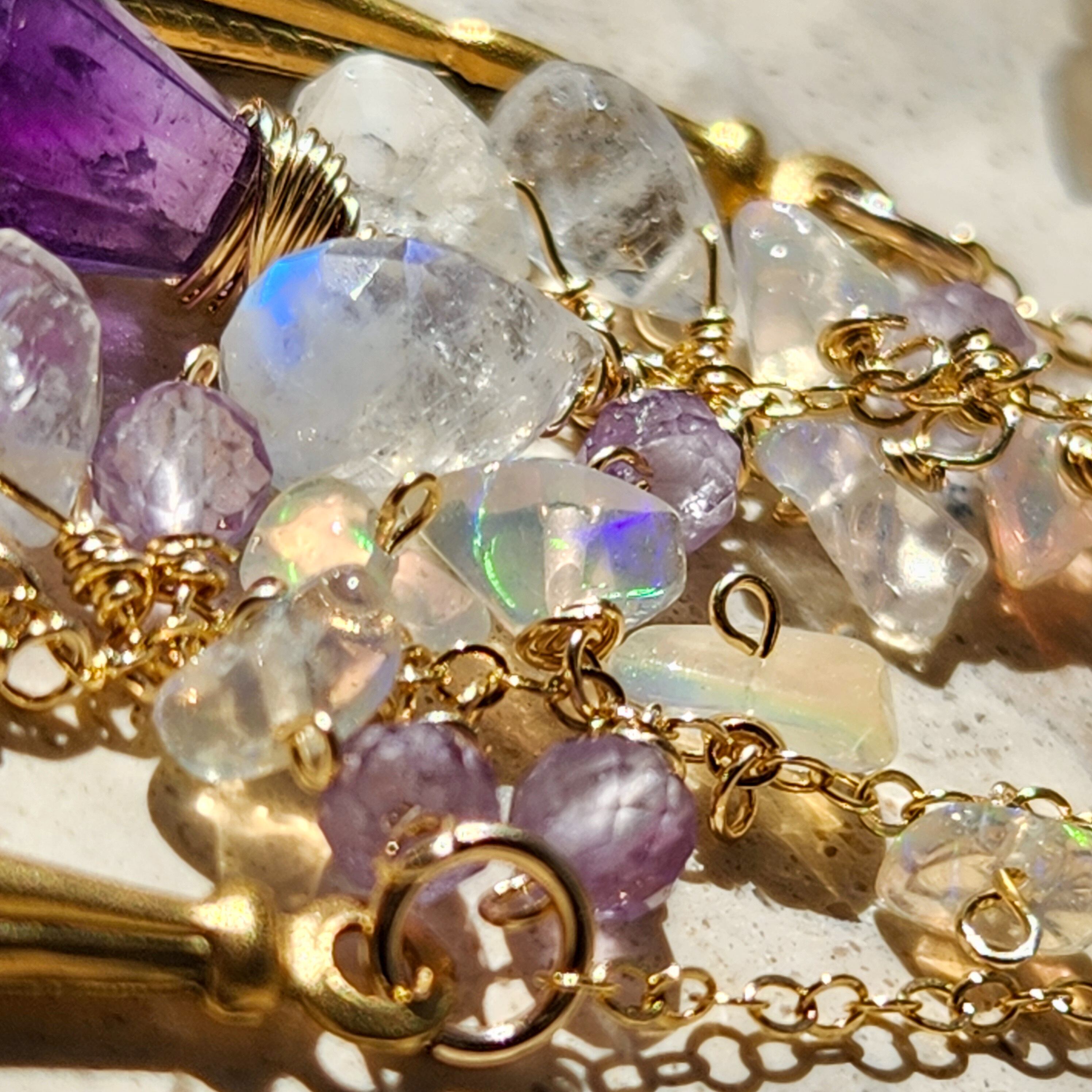 ラベンダーカラーの小粒アメジスト、淡いブルーのシラー、やさしいレインボーの遊色が重なります。